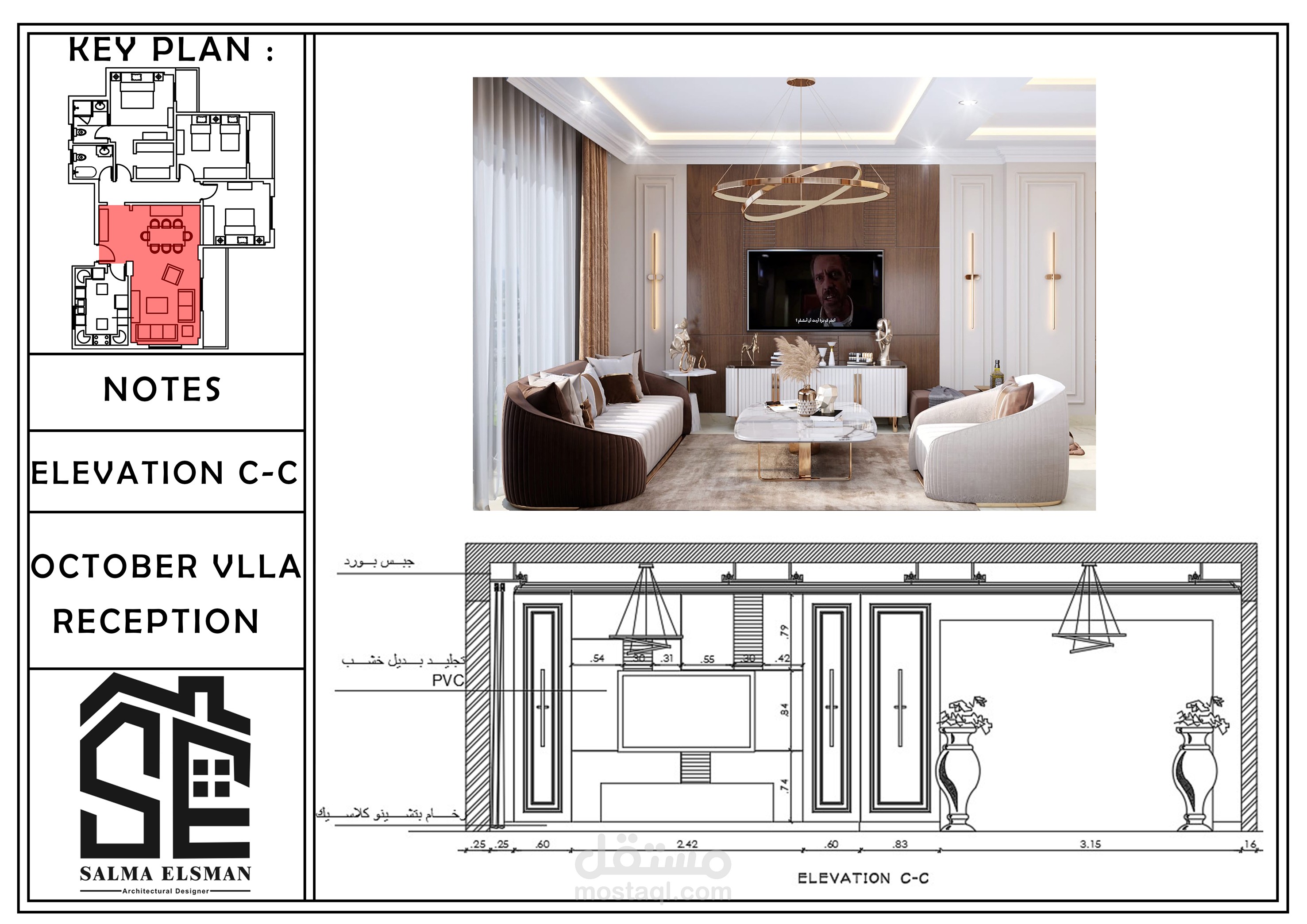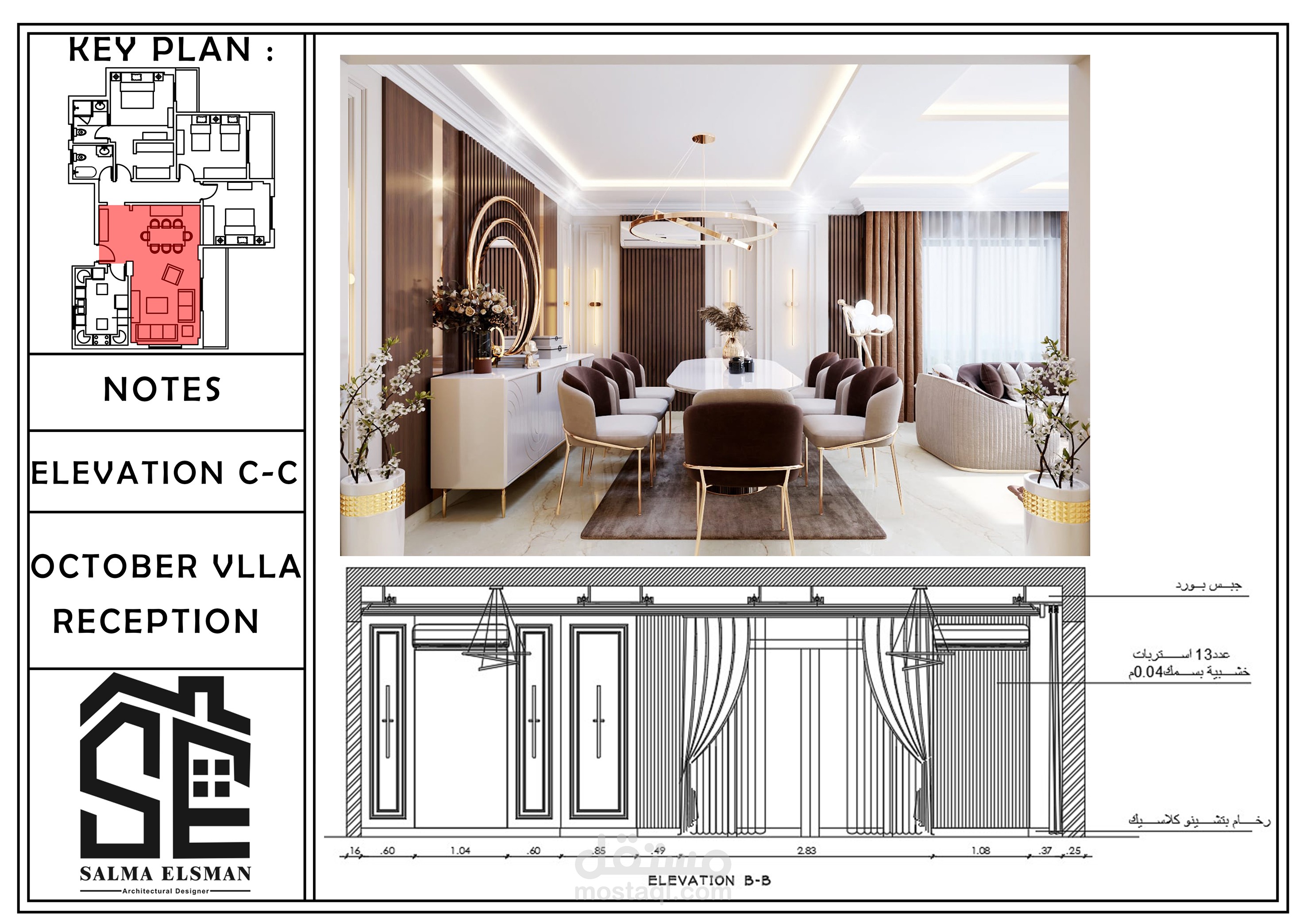 رسومات تفصيليه لاستقبال مع لوح لتوضيح توزيع الاثاث والخامات