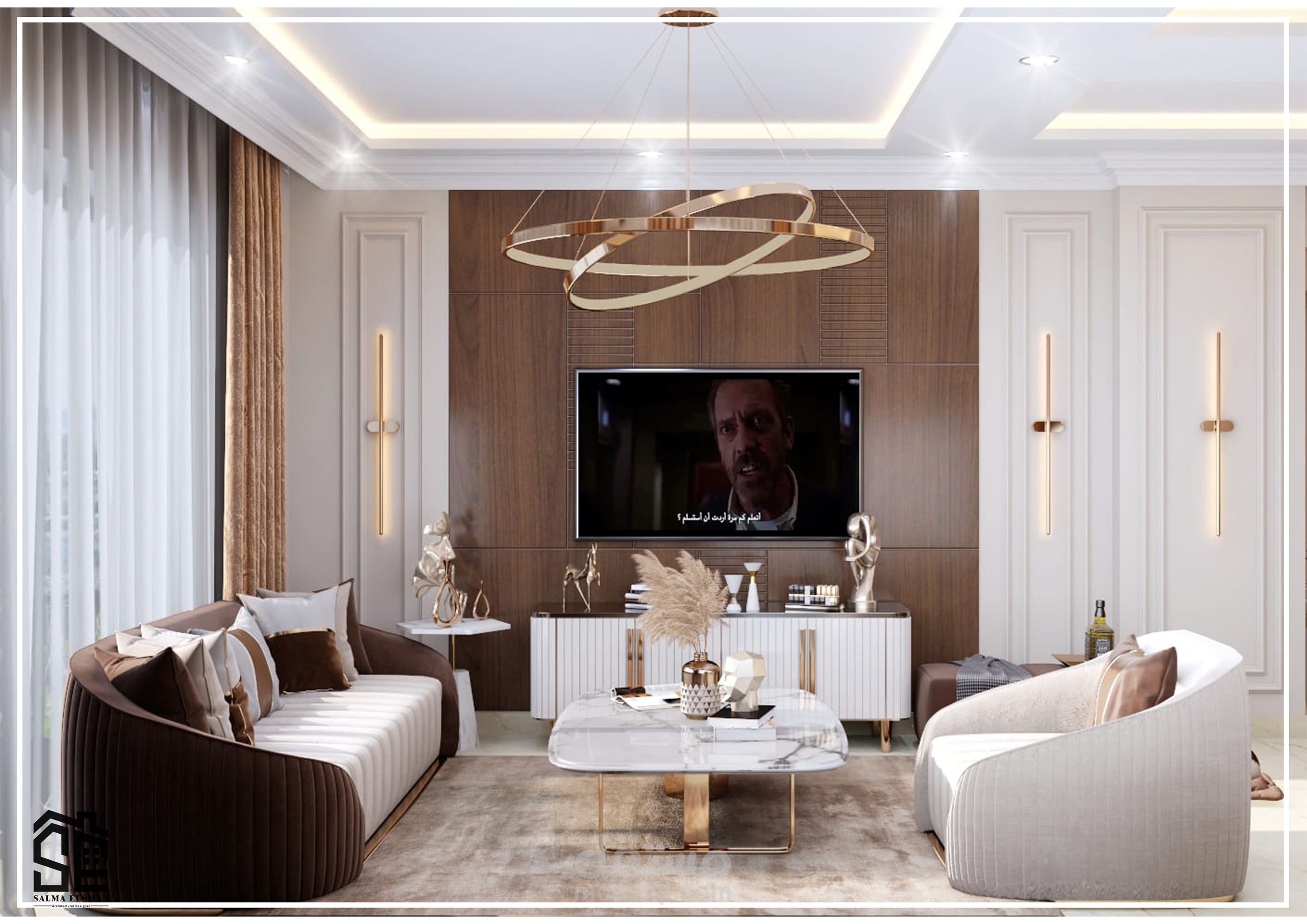 تصميم داخلي لاستقبال وطعام علي الطراز الحديث مع عمل لوح لتوزيع الاثاث وتوضيح الابعاد والخامات