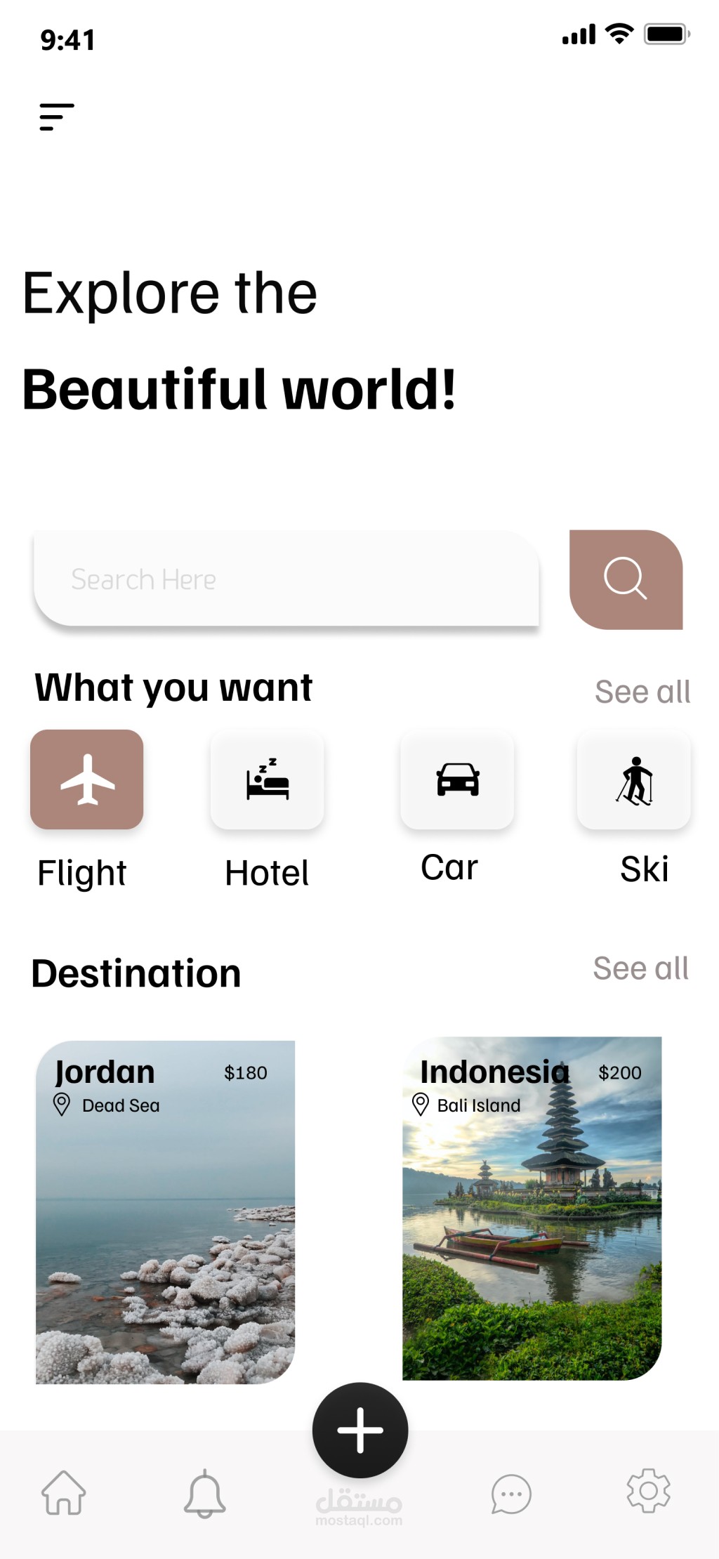 تصميم 3-واجهات لتطبيق سفر باللغة الانجليزية تقوم فكرة التطبيق على اقامة رحلات سياحية حول العالم و يقوم المستخدم باختيار المدينة او المنطقة التي يريد الذهاب اليها و الحجز للسفر من خلال التطبيق