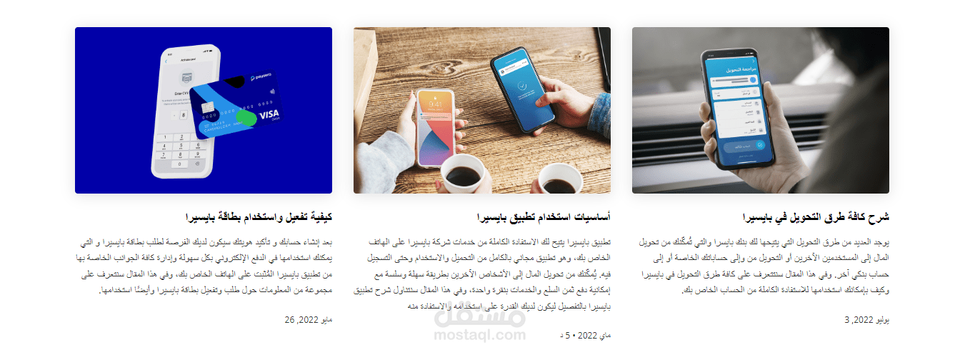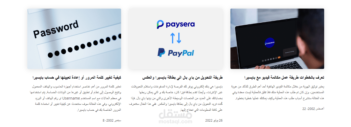 في موقع شركة بايسيرا - paysera كتبت مجموعة من المقالات المتعلّقة بالخدمات المقدمة من قبل الشركة وشرحها للمستخدمين، واشتمل المشروع على: