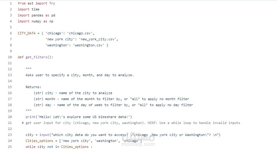 استكشاف البيانات المتعلقة بأنظمة مشاركة الدراجات لثلاث مدن رئيسية في الولايات المتحدة - شيكاغو ونيويورك وواشنطن. الاكواد المكتوبة تجيب على أسئلة مثيرة للاهتمام عن طريق حساب الإحصاء الوصفي باستخدام بايثون ومكتباته. الكود أيضا يأخذ مدخلات من المستخدم لإنشاء تجربة تفاعلية لتقديم هذه الإحصائيات.