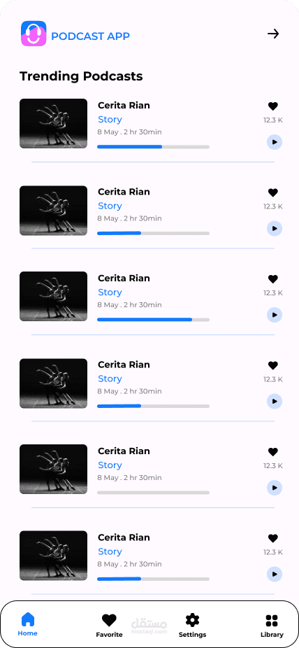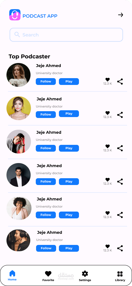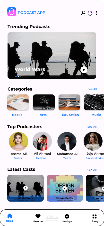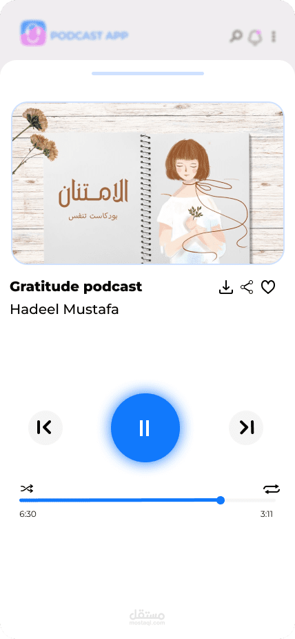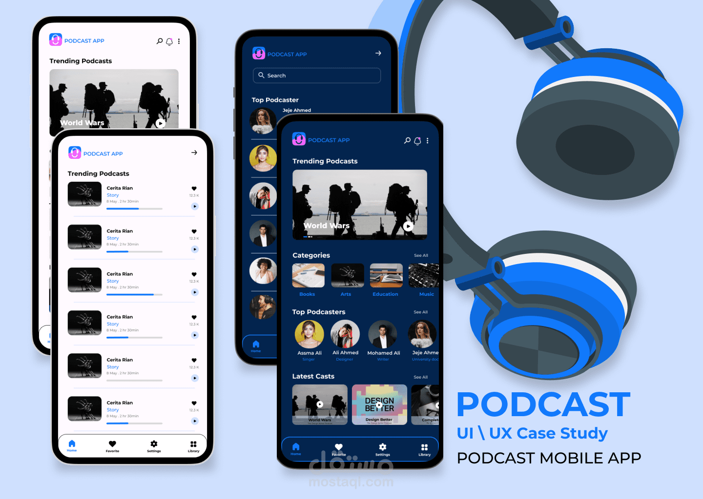 انا قمت بعمل بودكاست باللغة الإنجليزية قمت بفهم المشكلة ومتطلبات صاحب العمل ومن ثم قمث بالبحث عن ايجاد الجل وذلك عن طريق تحليل المنافسين والمميزات التي في موجودة في السوق وقمت بعمل مقابلة مع المستخدمين وايضا قمت بإحصاءات عن المستخدمين وبعد ذلك قمت بإيحاد الحل المناسب والعم عليه لكي نوصل الى بودكاست ينافس الموجودون في السوق وبنفس الكفاءة وعملت منه نسختين منها الموود الفاتح ومنها المود الغامق لكي يناسب جميع المستخدمين وجميع مشاكلهم البصرية.