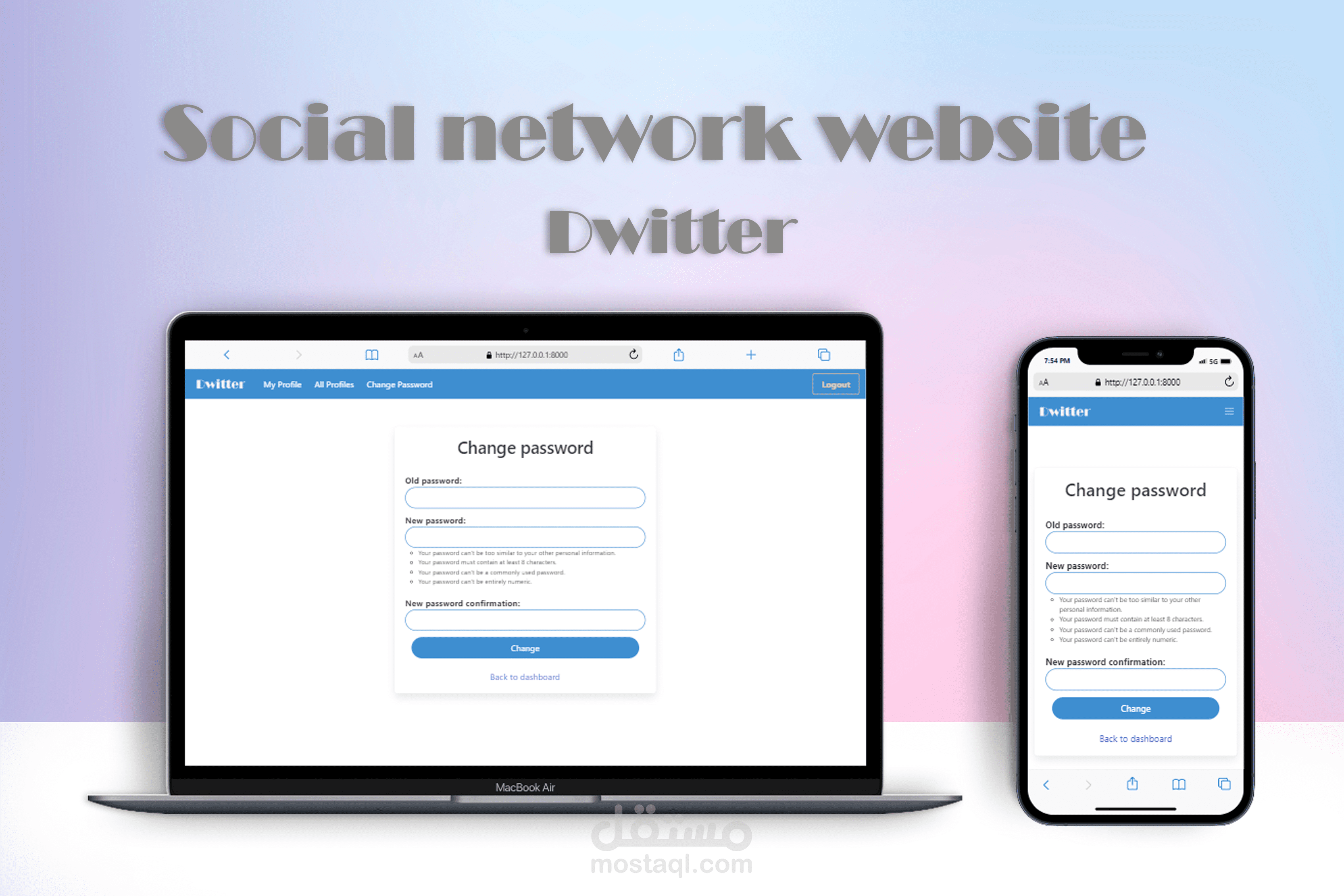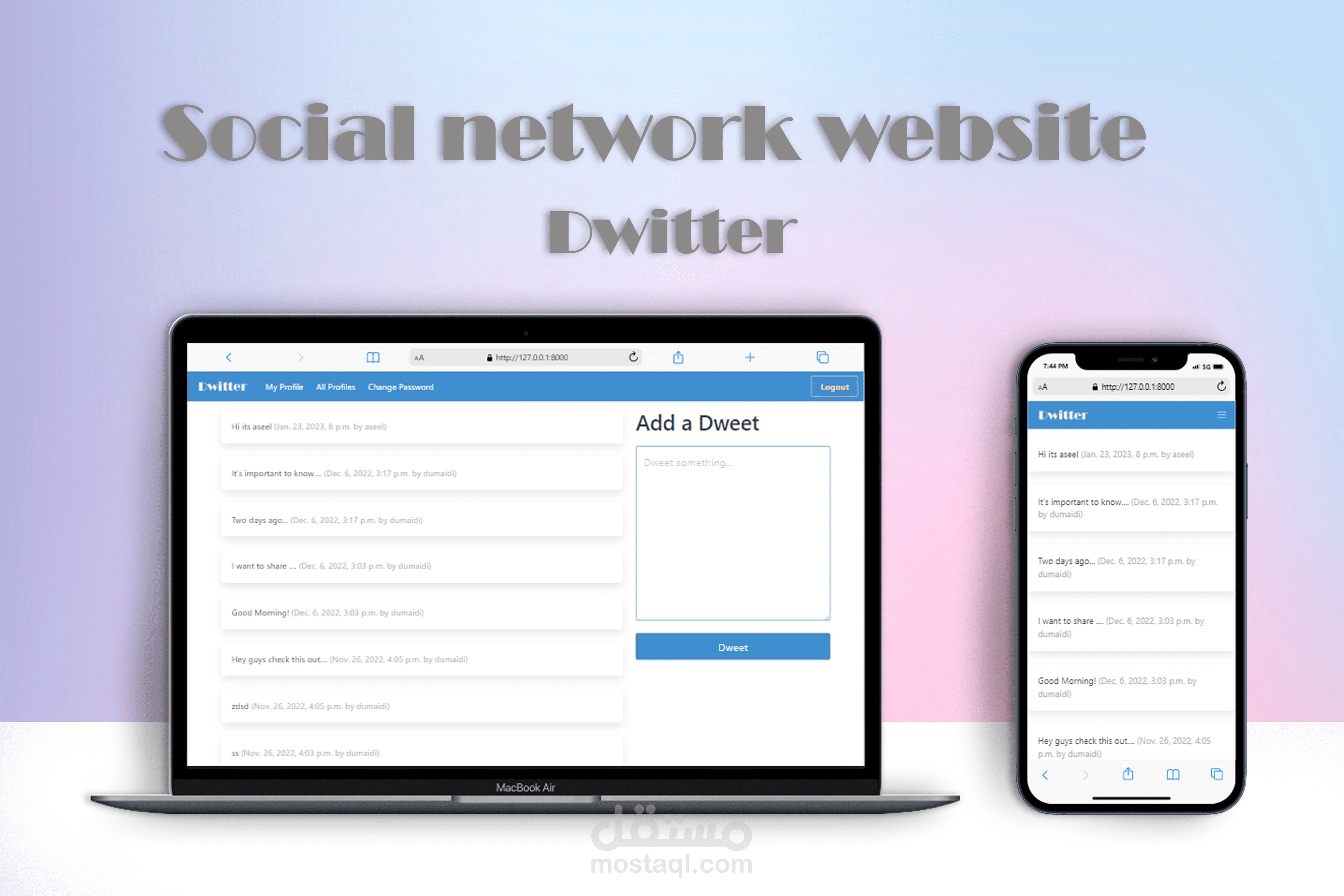 "ديويتر" هو تطبيق ويب اجتماعي مصمم ومطوّر باستخدام إطار عمل Django. تقدم هذه المنصة المبتكرة للمستخدمين تجربة سلسة للتواصل والمشاركة والتفاعل مع الأصدقاء والعائلة والزملاء في بيئة آمنة وسهلة الاستخدام.