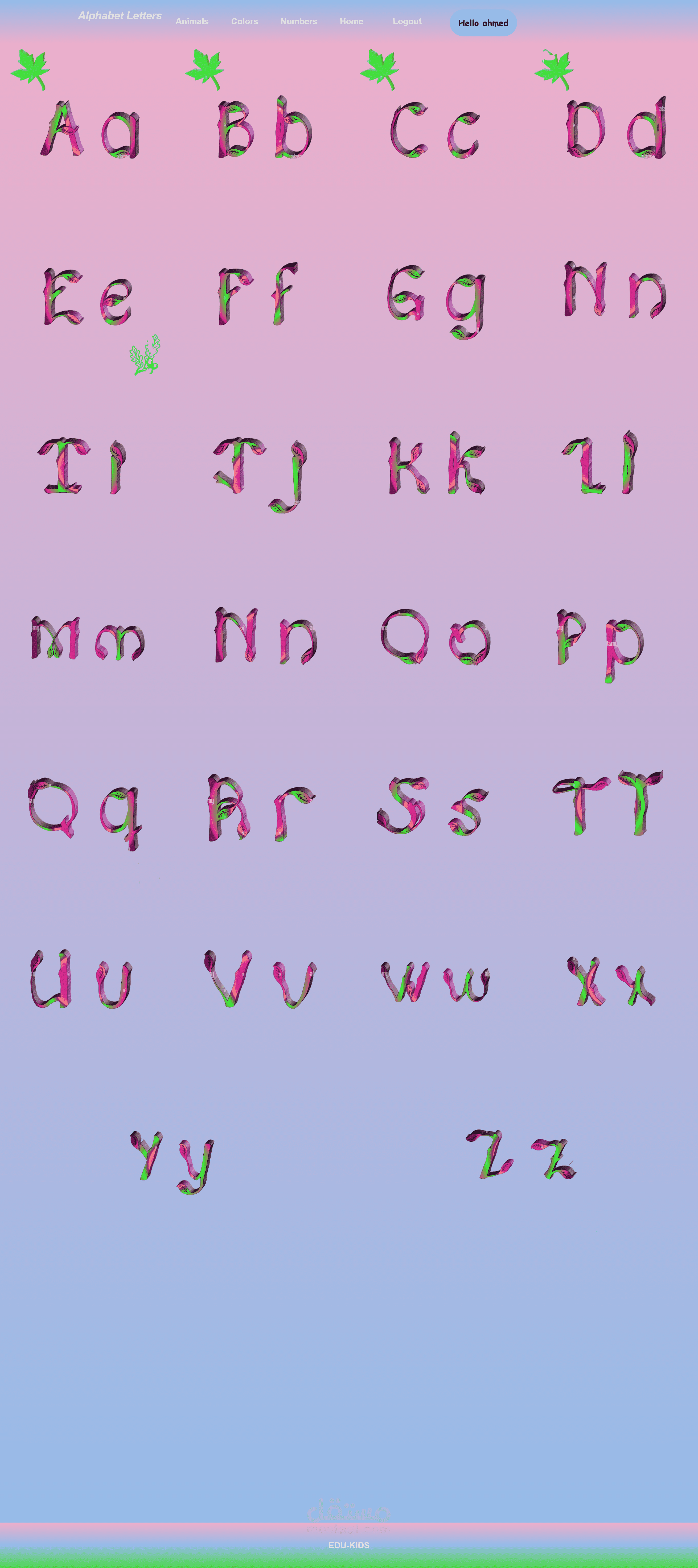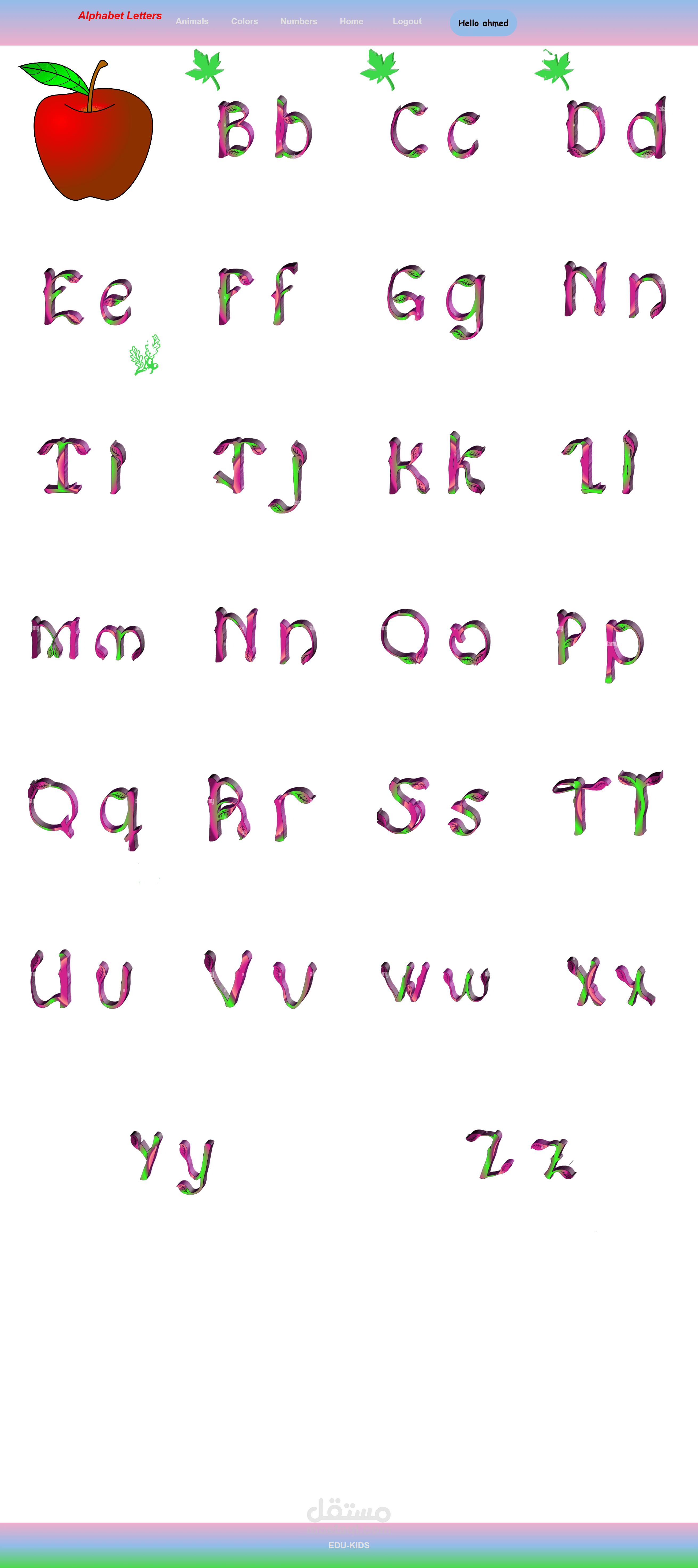موقع تعليمي للاطفال خاص بتعليمهم الحروف الانجليزيه بطريقه تتوافق مع المعاير العالميه في جوده التعلم مثال التعلم بالرسومات وبالاشكال وبالاصوات ؛ ؛ وكذلك ايضا الارقام والالوان المختلفه مع اضافه عدد من الفديوهات التحفيزيه والمبهجه للاطفال للتعليم عن طريغ الاغاني واخيرا هناك بس صور واشكال الحيوانات في صوره كلام وصوت واغاني