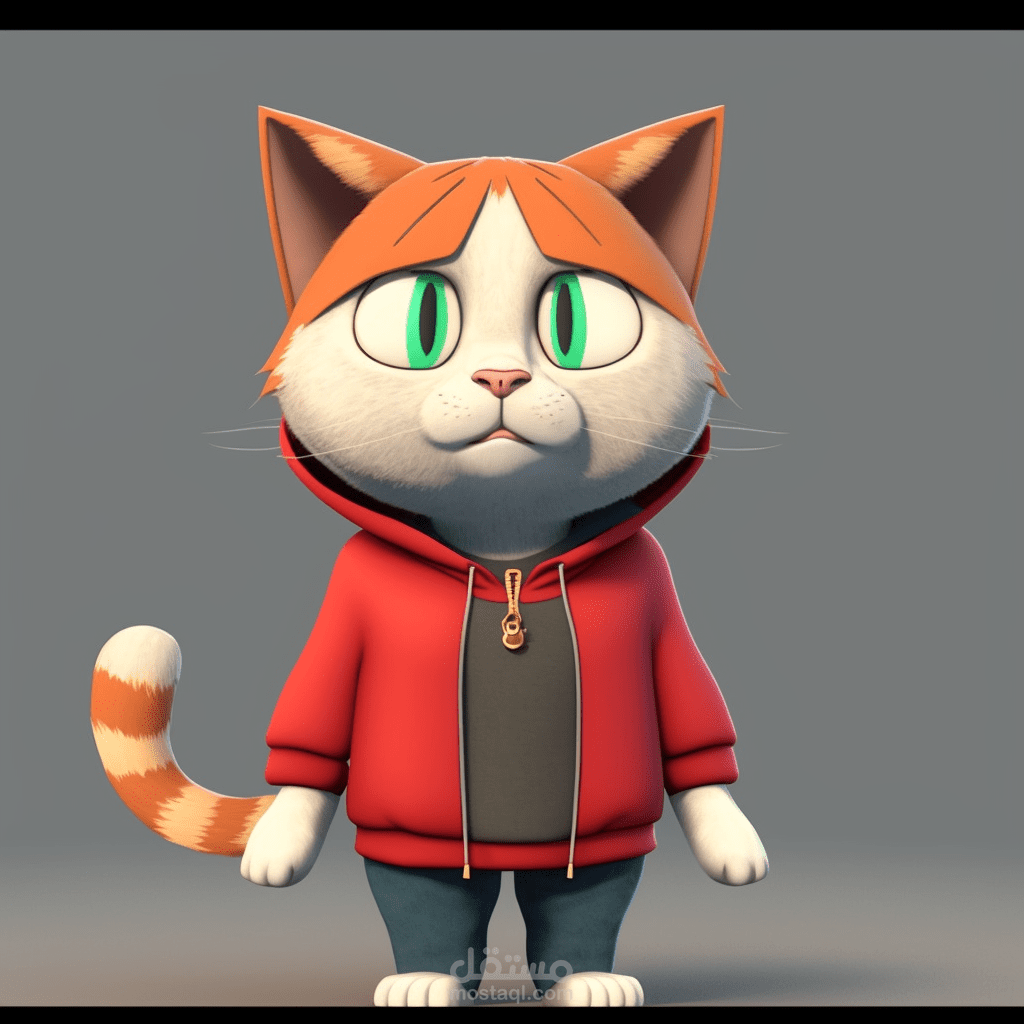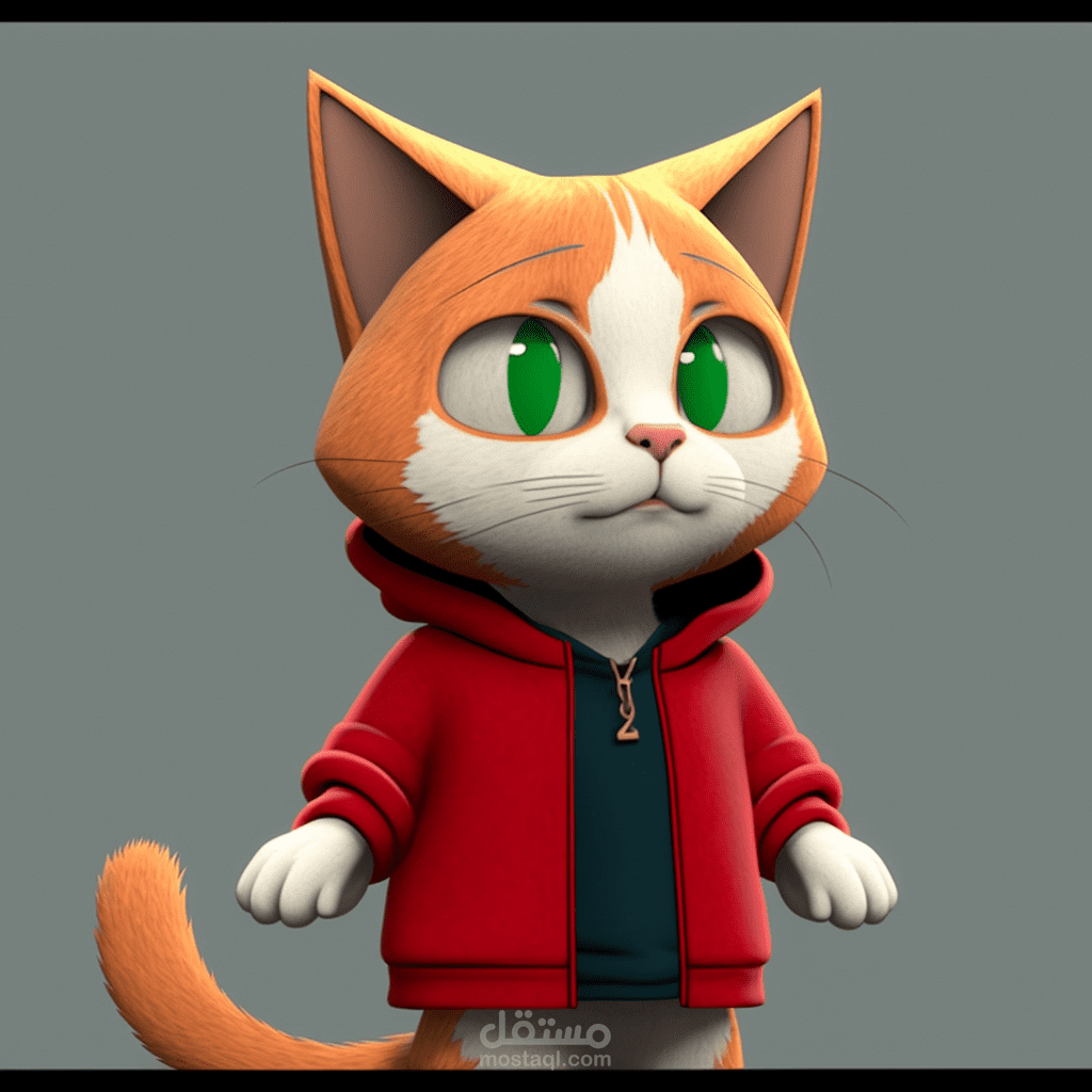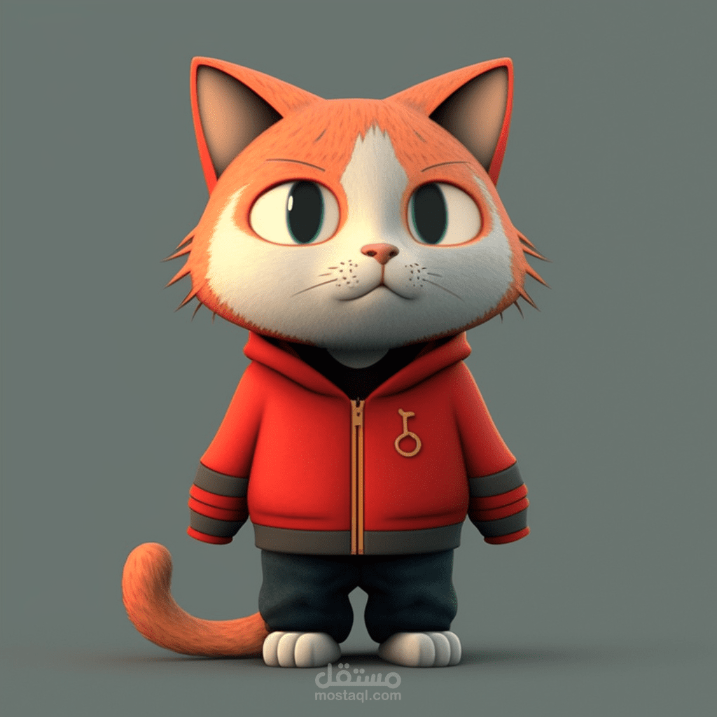detailed 3d character modeled, textured and rigged from the 2d image (MainCat_reference) below and should be ready for animation in Maya. It's a humanoid cat character that will speak and sing. So facial rigging and facial geometry should be done perfectly. The cat wears a red hoodie (the hoodie should be detailed like an actual hoodie with a clef symbol on it, as it is there in the reference) and blue jeans with white sneakers. The image "face_reference" is the kind of final quality we are looking for.