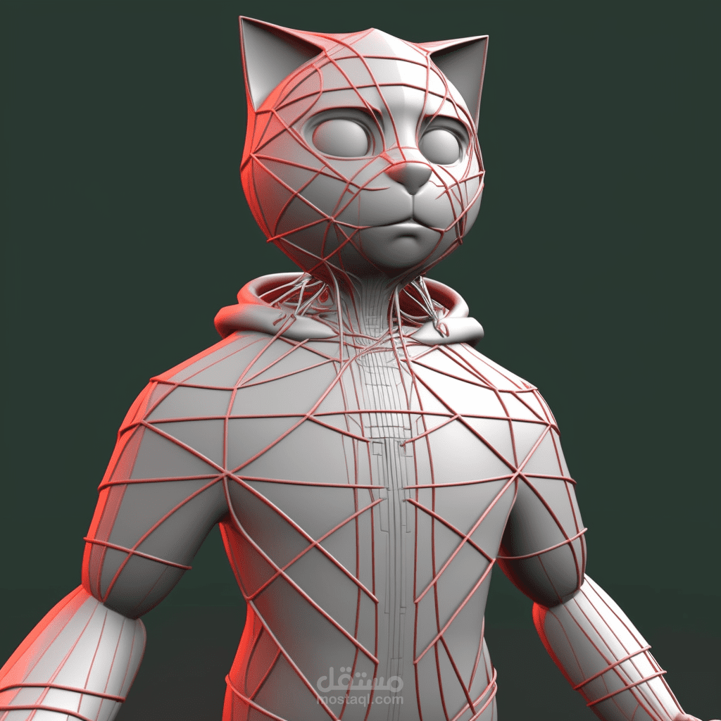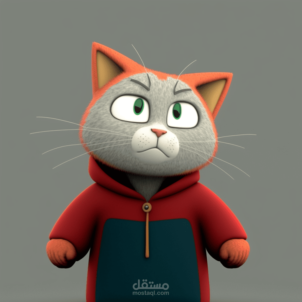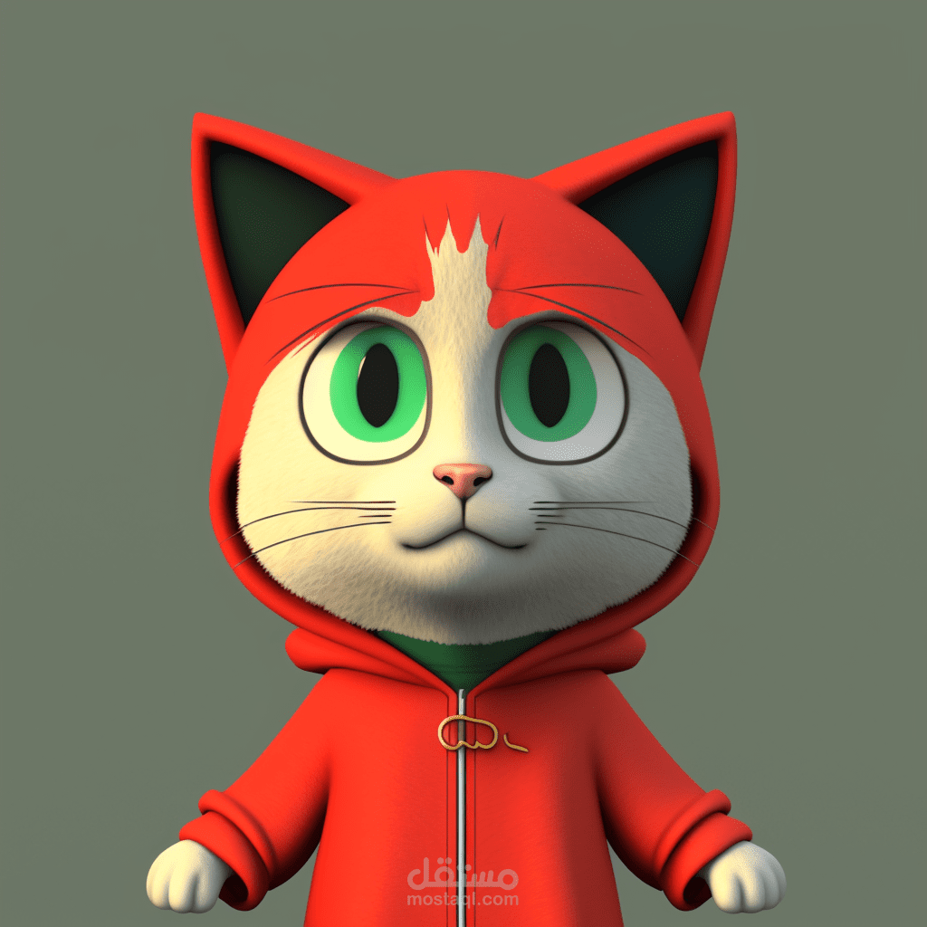 detailed 3d character modeled, textured and rigged from the 2d image (MainCat_reference) below and should be ready for animation in Maya. It's a humanoid cat character that will speak and sing. So facial rigging and facial geometry should be done perfectly. The cat wears a red hoodie (the hoodie should be detailed like an actual hoodie with a clef symbol on it, as it is there in the reference) and blue jeans with white sneakers. The image "face_reference" is the kind of final quality we are looking for.