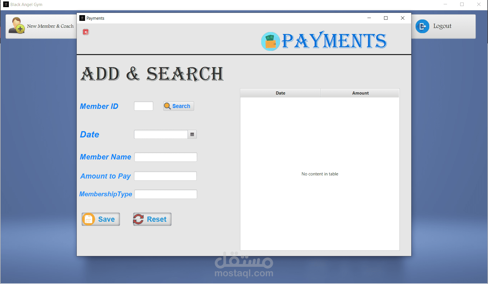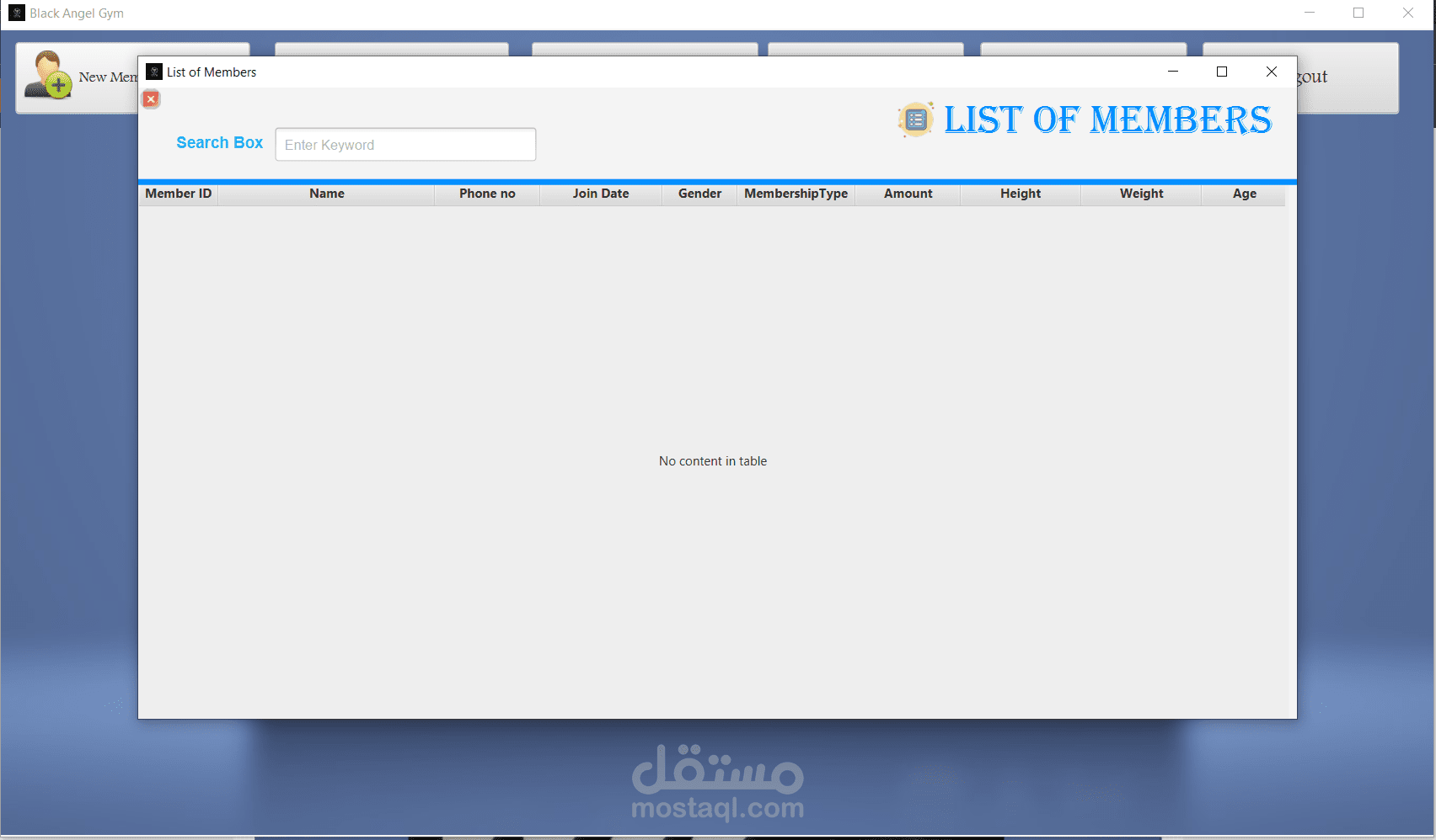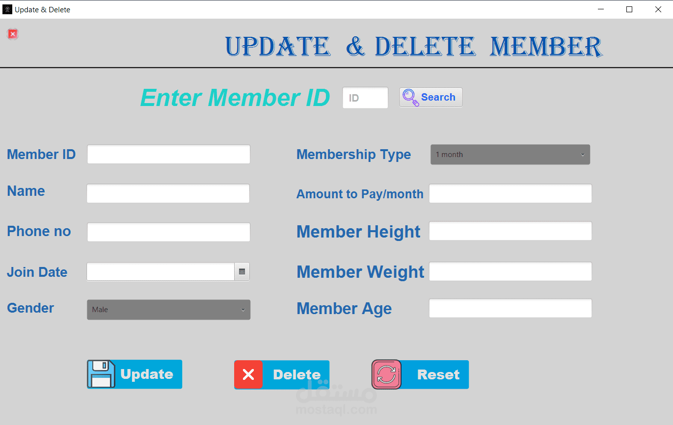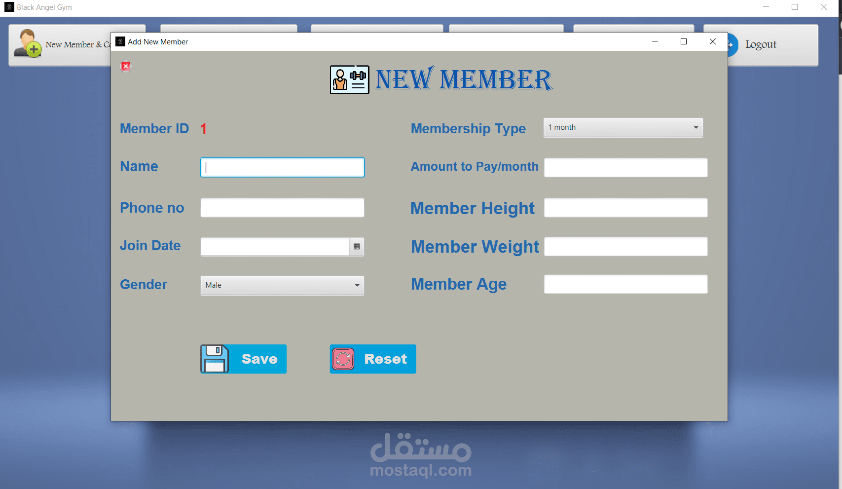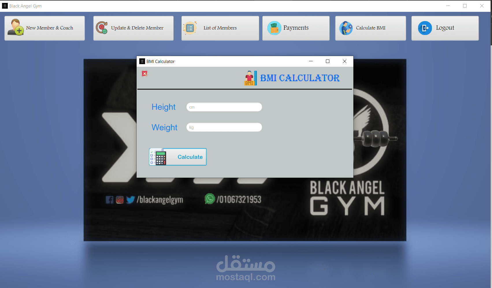 management of the gym, where the program contains a login page to secure access to the program, a home page, a page to add new members, a page to modify member data or delete a member, a page to display the list of members, we can search for a specific member, a page to view and add payments, a page to calculate BMI, the program connected to database and finally you can log out
