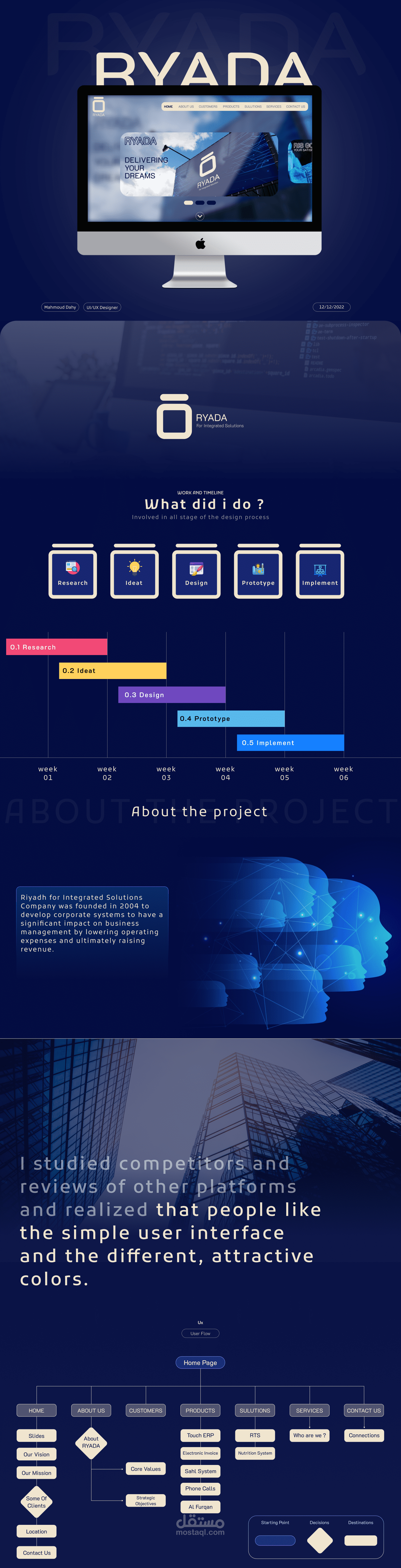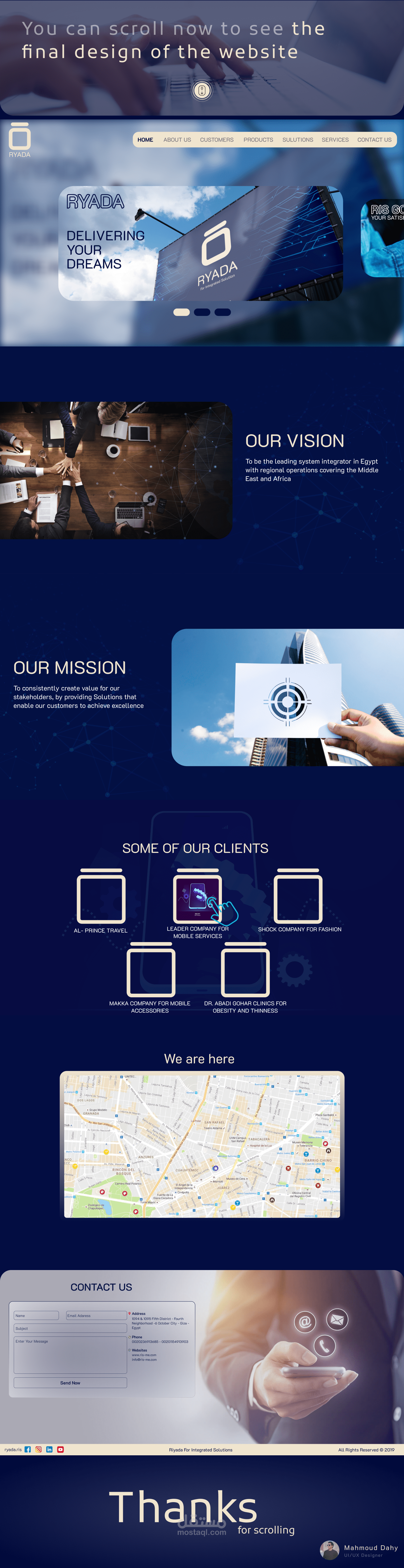 "Ryada" Website - UX/UI Design ️ I have redesigned this site and This is a simple summary of what the company is "Riyadh for Integrated Solutions Company was founded in 2004 to develop corporate systems to have a significant impact on business management by lowering operating expenses and ultimately raising revenue."
