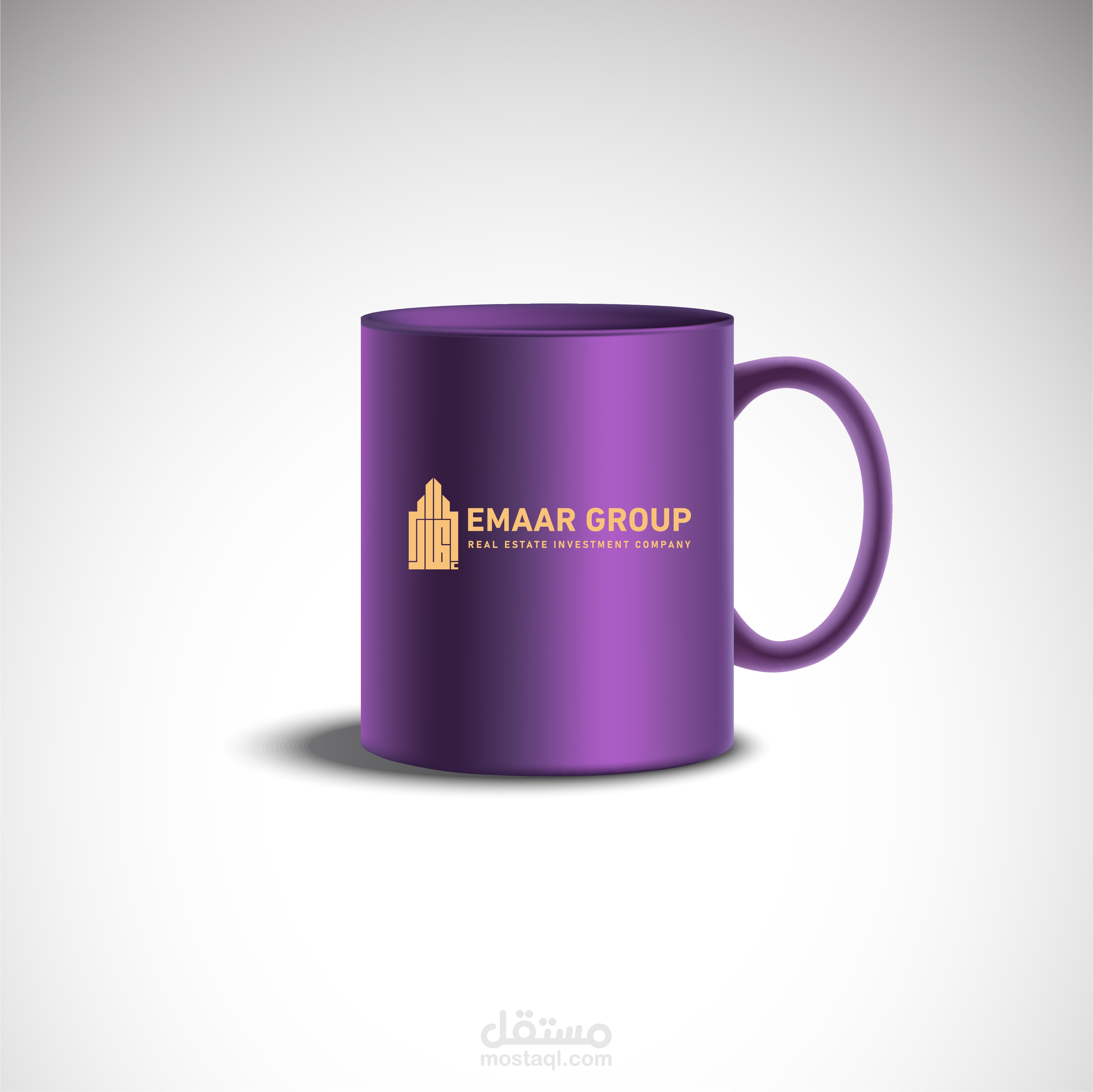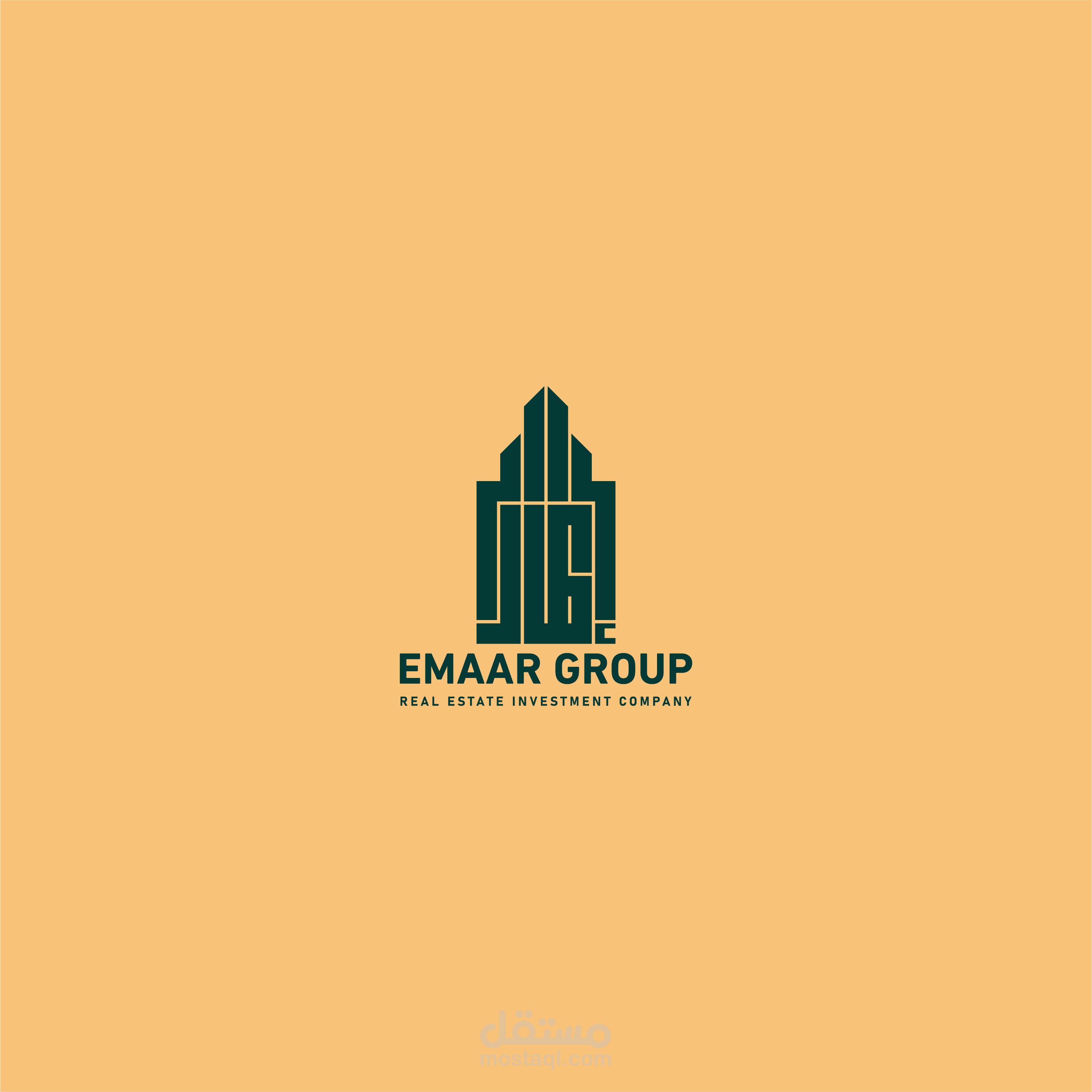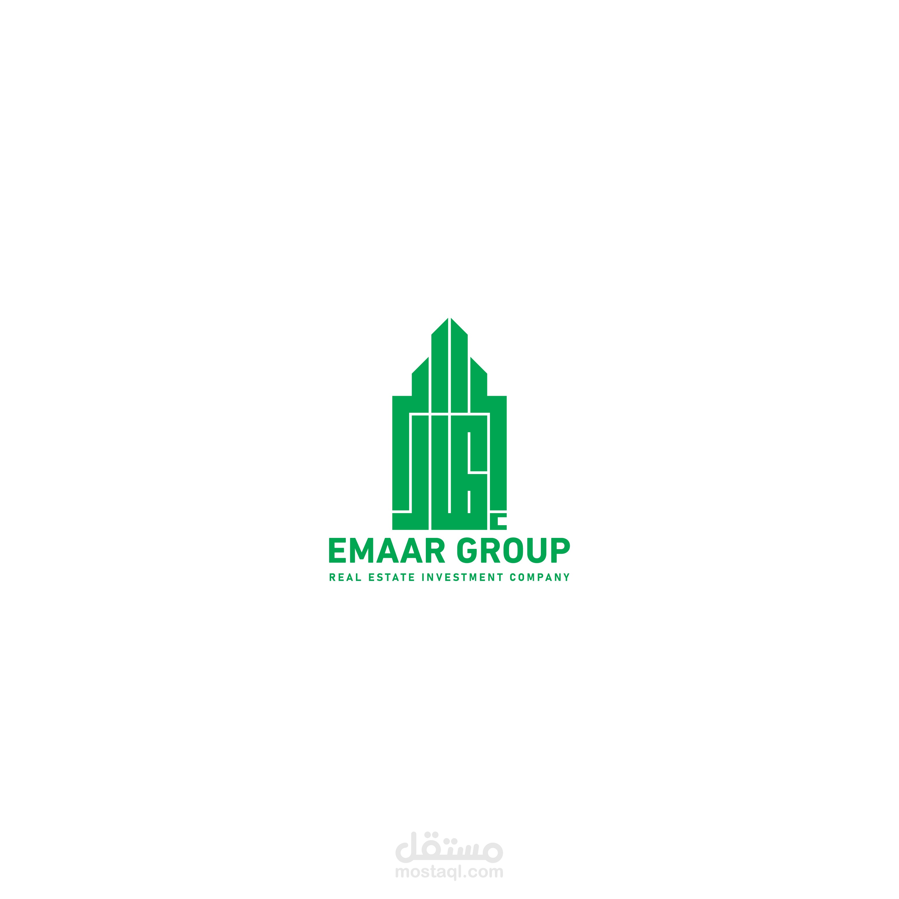 الشعار يشمل كلمة اعمار بطريقة الكوفي التربيعي , مع دمج شكل البناء وهو مايدل علي مجال الشركة