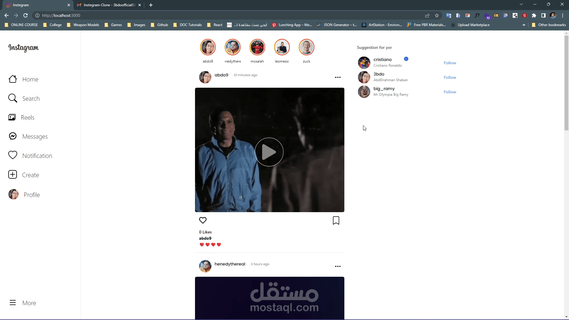 This is an Instagram clone web application that is fully responsive and built using the MERN (MongoDB, Express, React, Node) stack. It is a fully functional social media platform that mimics the features and functionality of the original Instagram, In this project, I focused to implement almost all main user functions in Instagram also I designed the pages to be similar to the Instagram website, especially for mobile devices that the website is fully responsive for all screens.