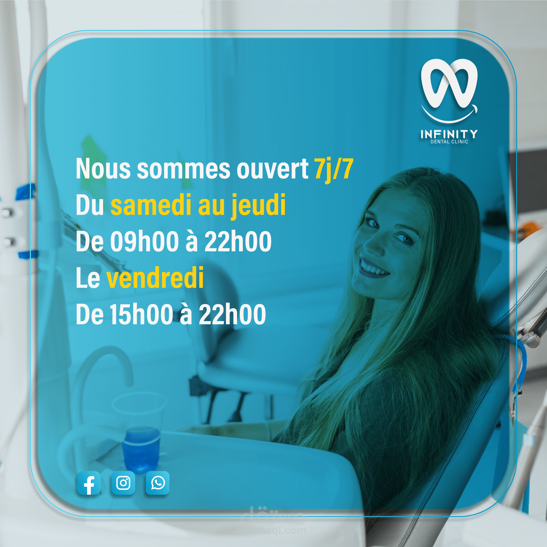 لذلك، إذا كنت تبحث عن عيادة أسنان تضع ابتسامتك أولا، فاتبعوا عيادة إنفينيتي الأسنان على وسائل التواصل الاجتماعي وشاهدوا ما يميزهم. وإذا كنت تحتاج إلى تصميمات احترافية على وسائل التواصل الاجتماعي لمساعدة عملك على التميز، فلا تتردد في التواصل معي.