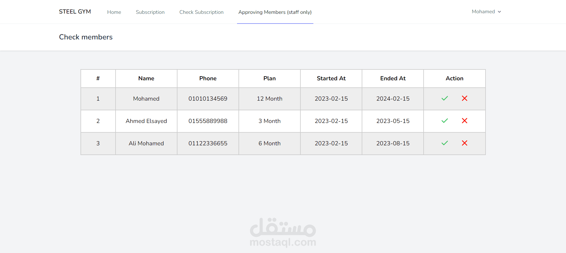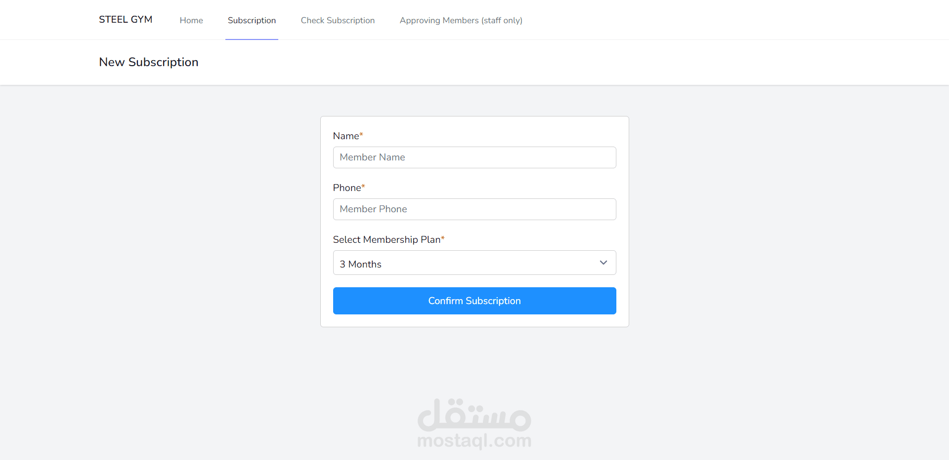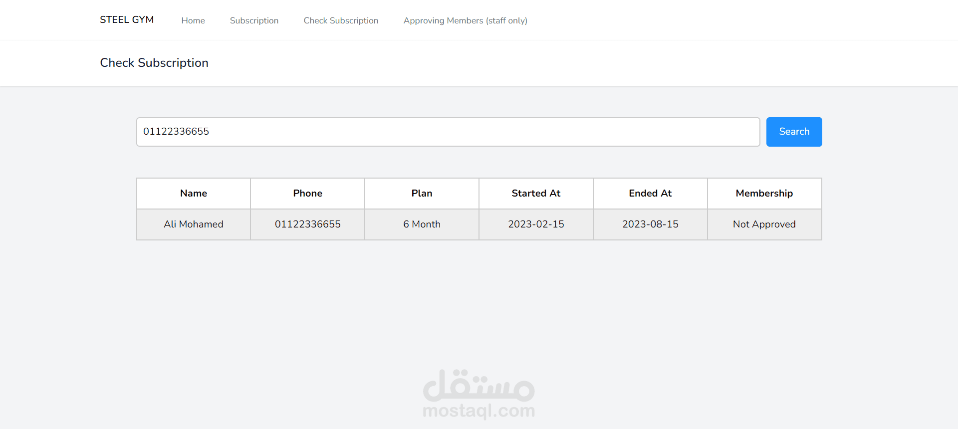 تصميم وتنفيذ واجهه للجمهور تمكنهم من تسجيل بيناتهم واختيار خطة الاشتراك لتظهر بعد ذلك تفاصيل الاشتراك في لوحة تحكم الادمن لتأكيد بيانات الاشتراك او رفضها مع امكانية بحث العميل برقم الهاتف للتأكد من حالة الاشتراك الخاص به.