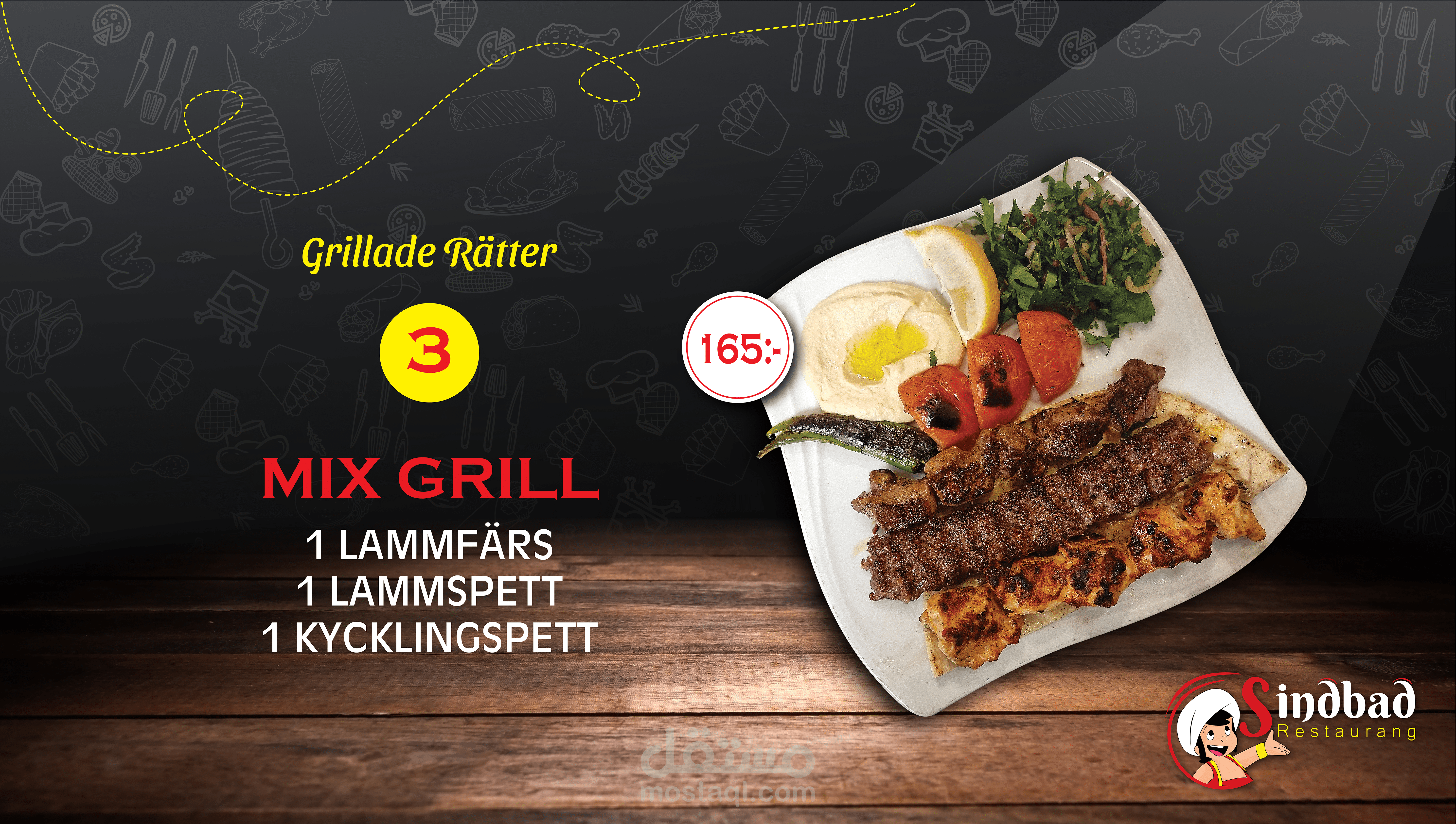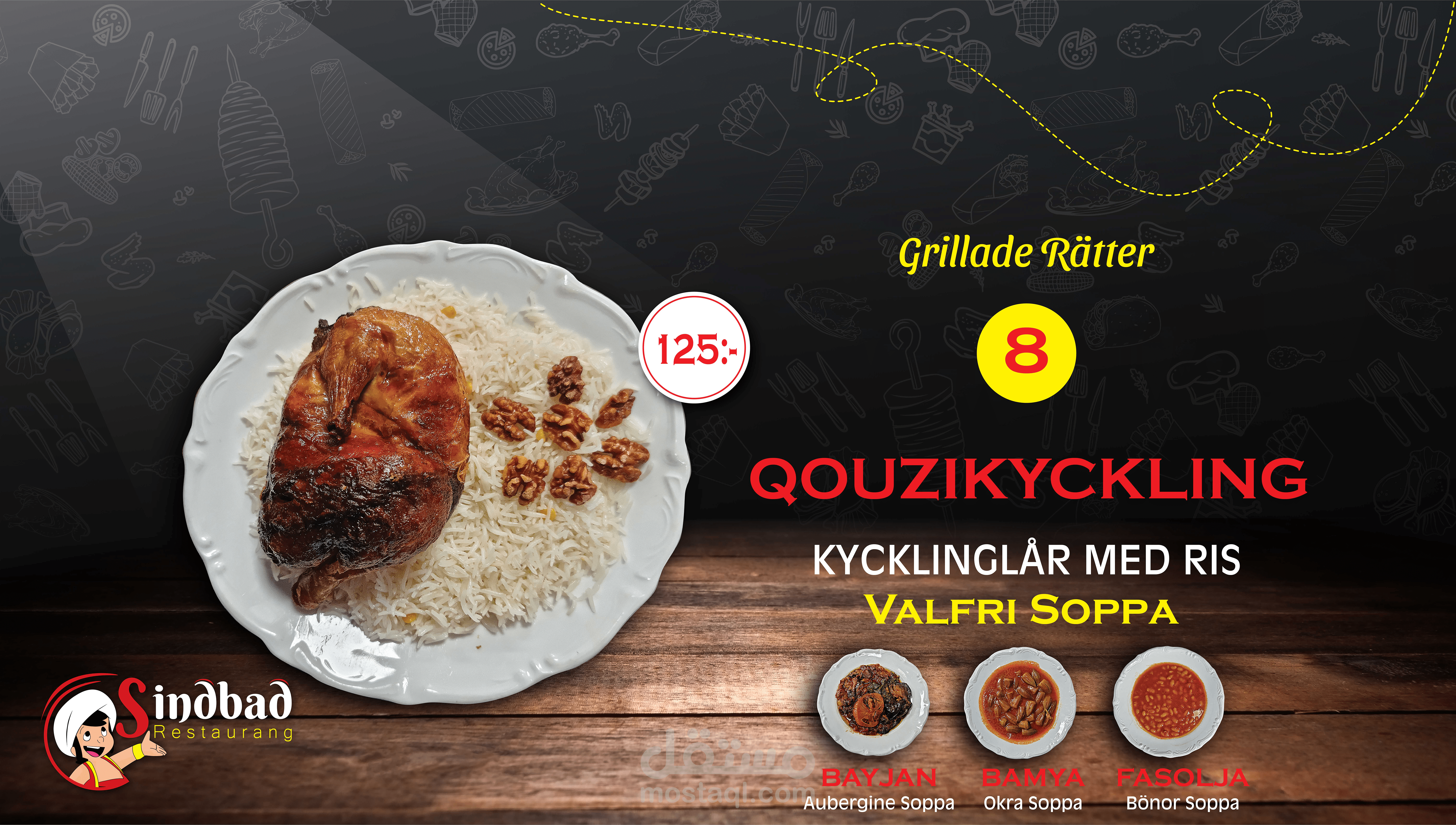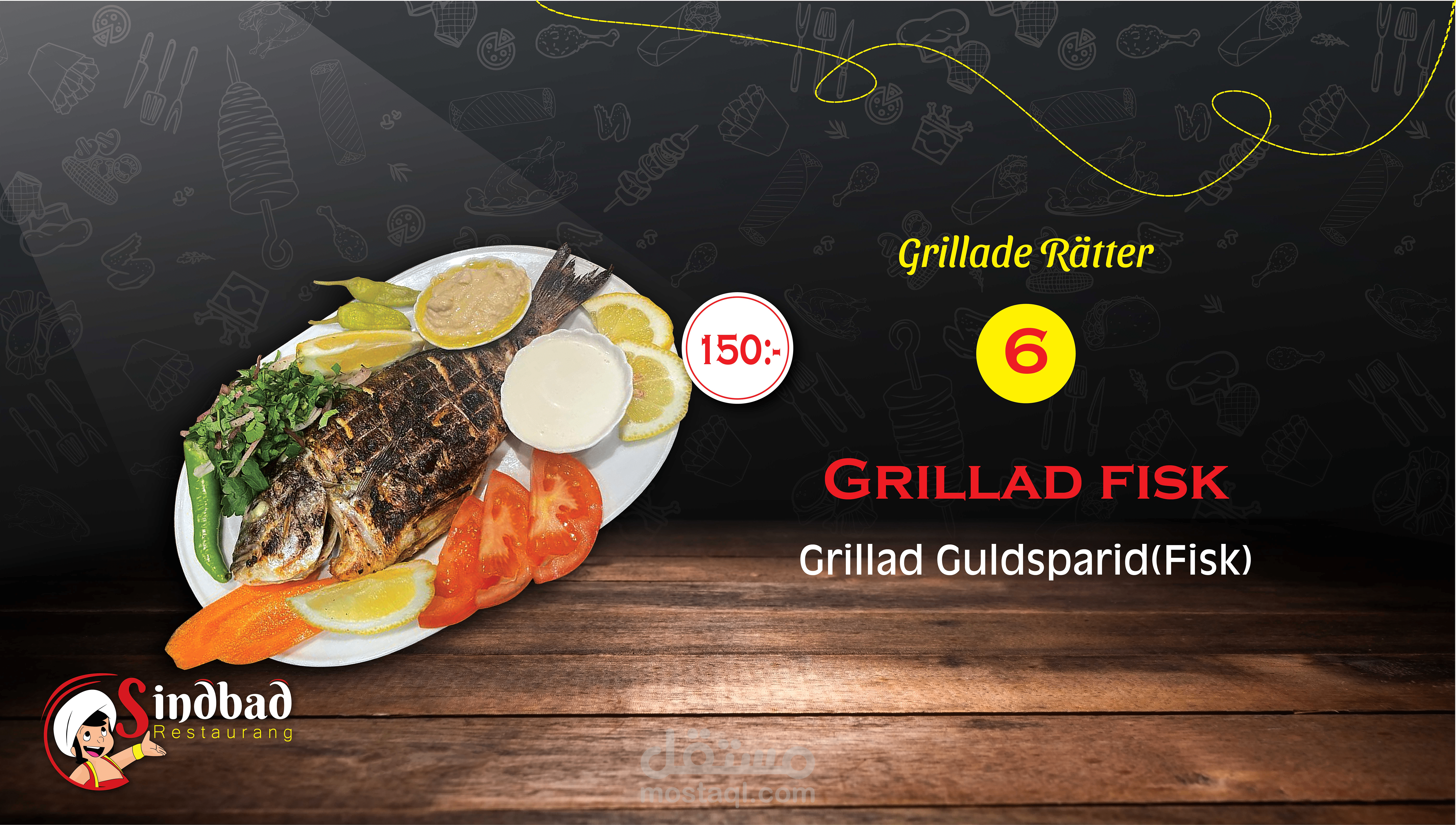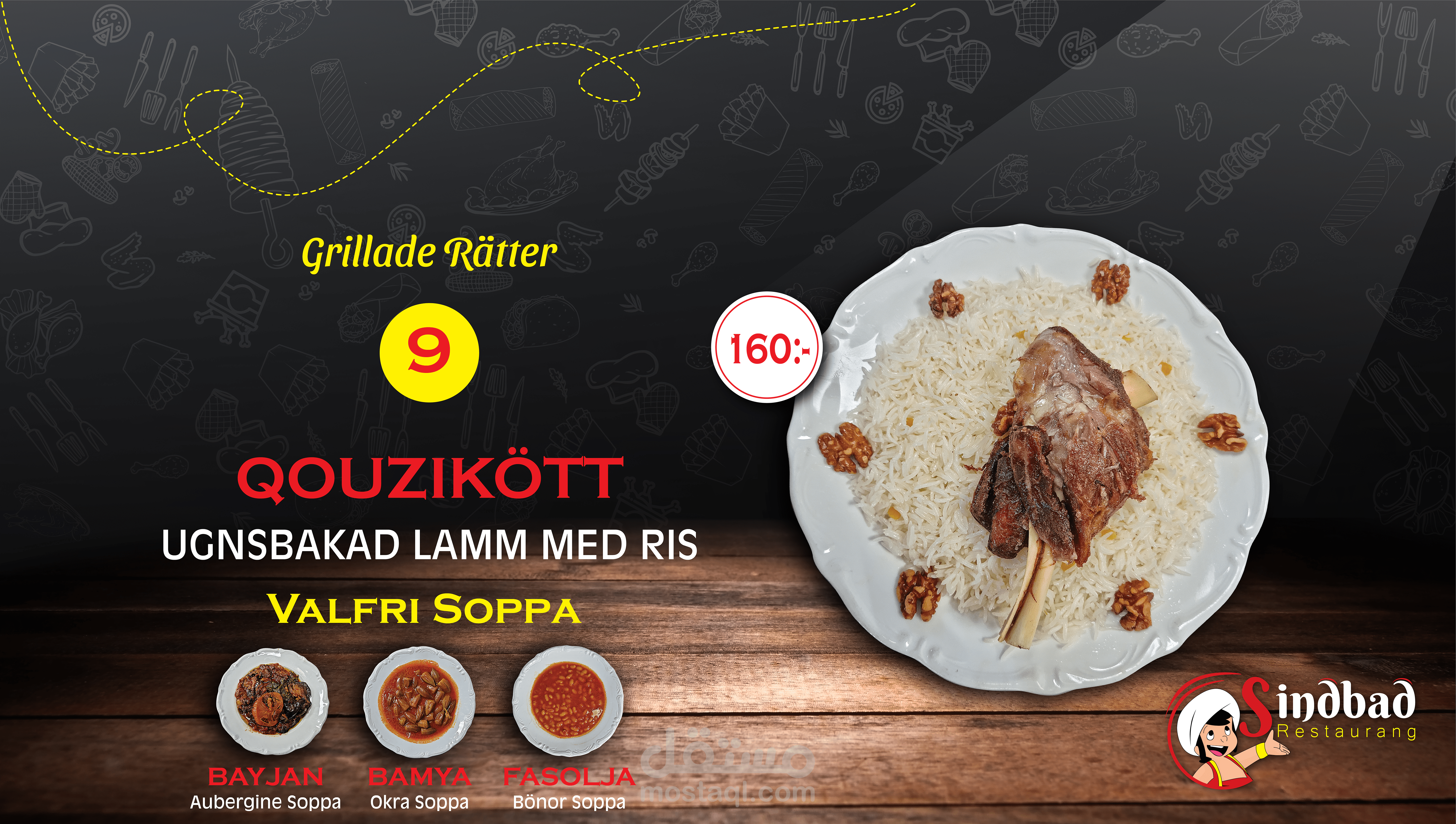 مطعم سندباد في السويد من المطاعم الجيدة وقد قمت بعمل تصميم يتناسب مع الاسم. لقد اخترت الخلفية الرمادية مع وجود صور مرسومة للاطعمة مع درجة شفافية مناسبة بحيث تظهر الخلفية بشكل مميز.