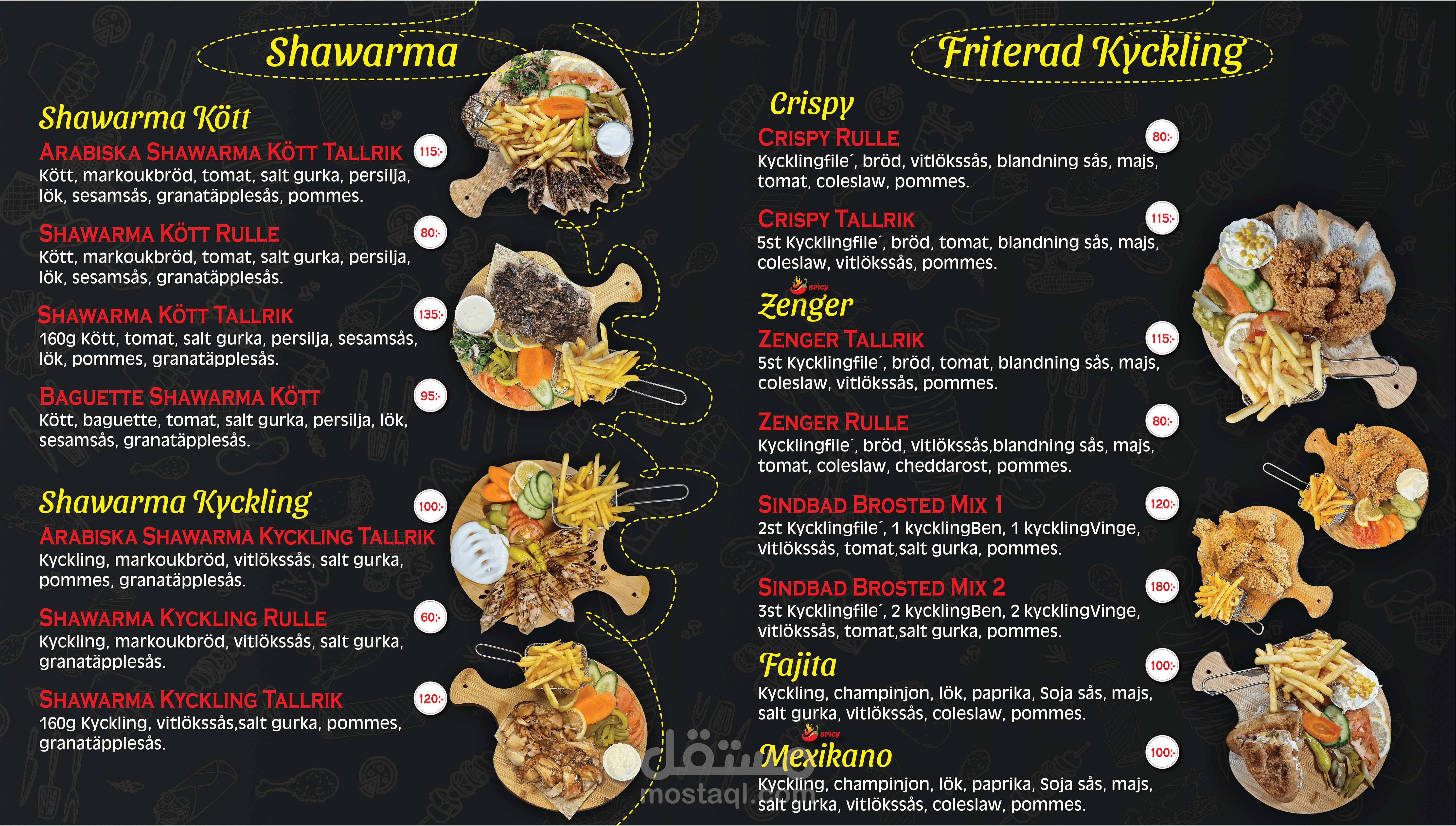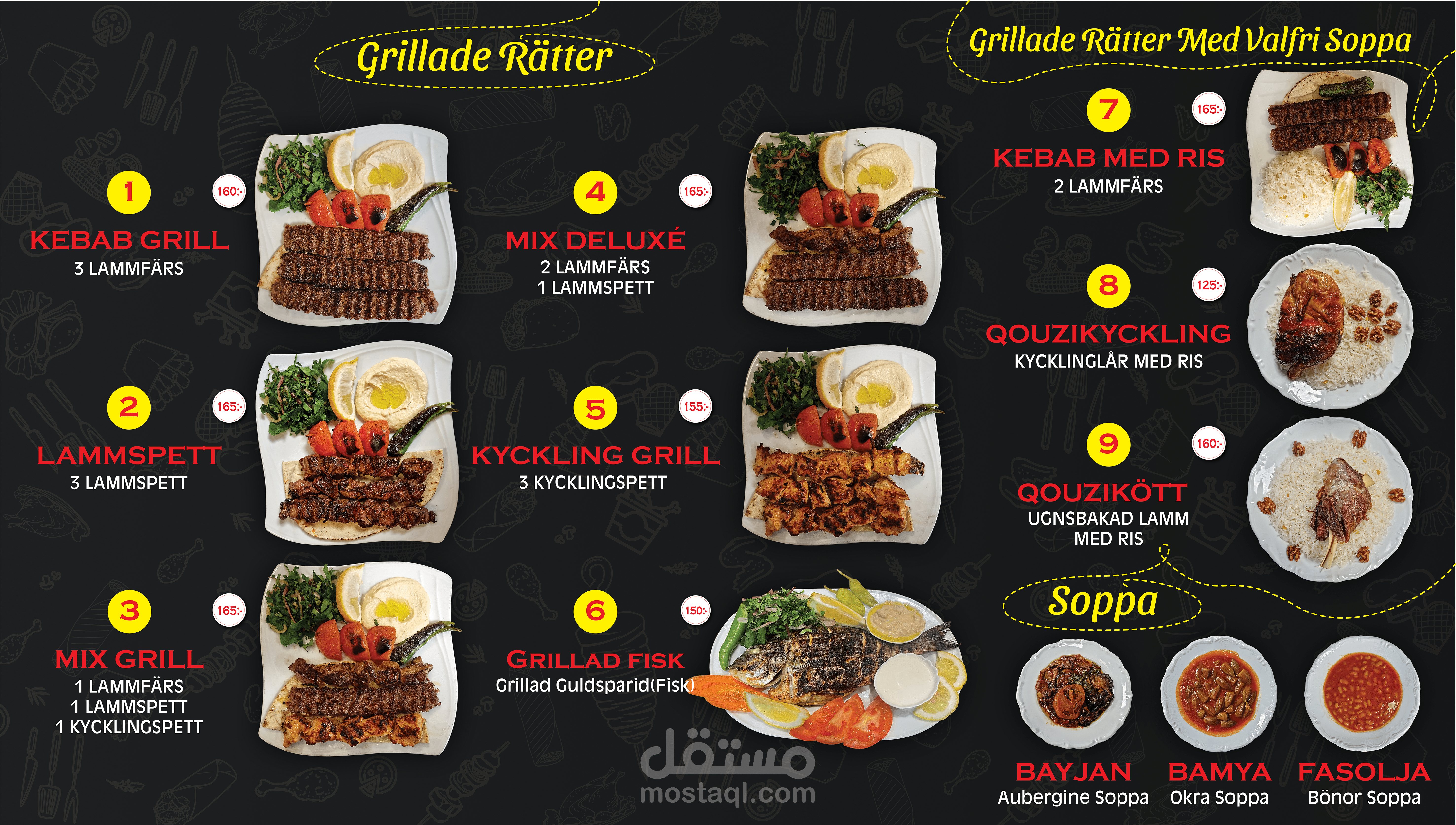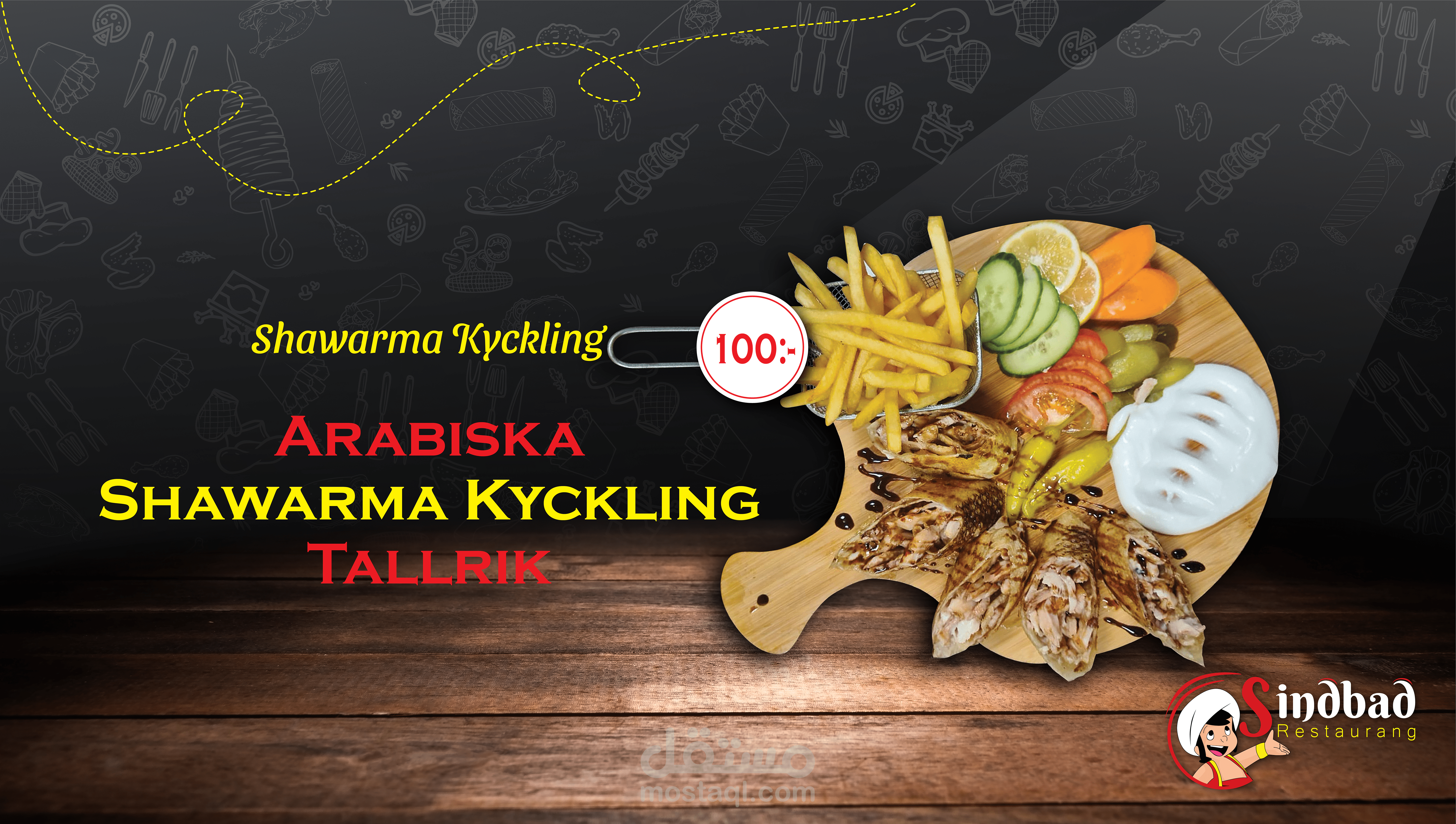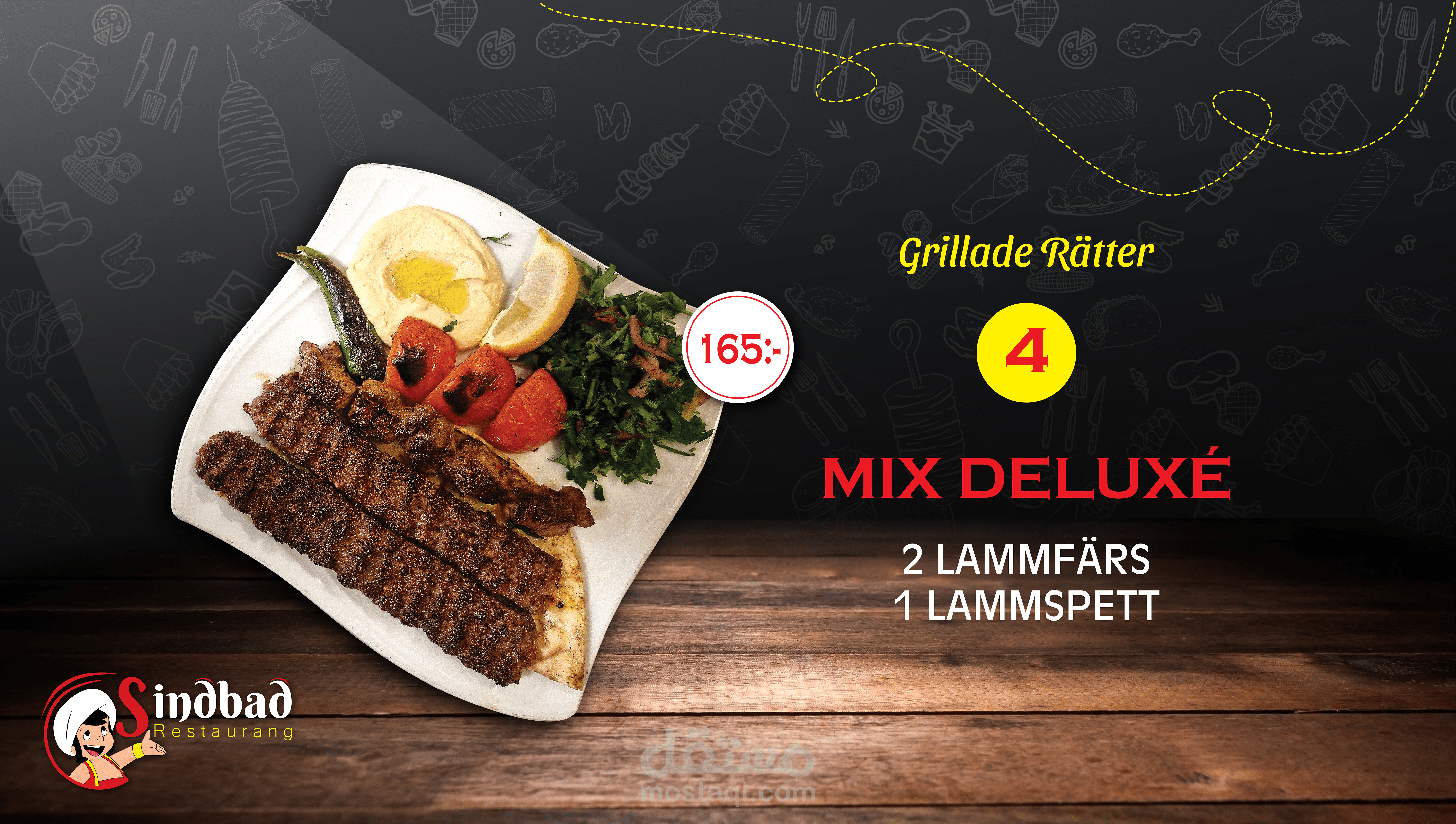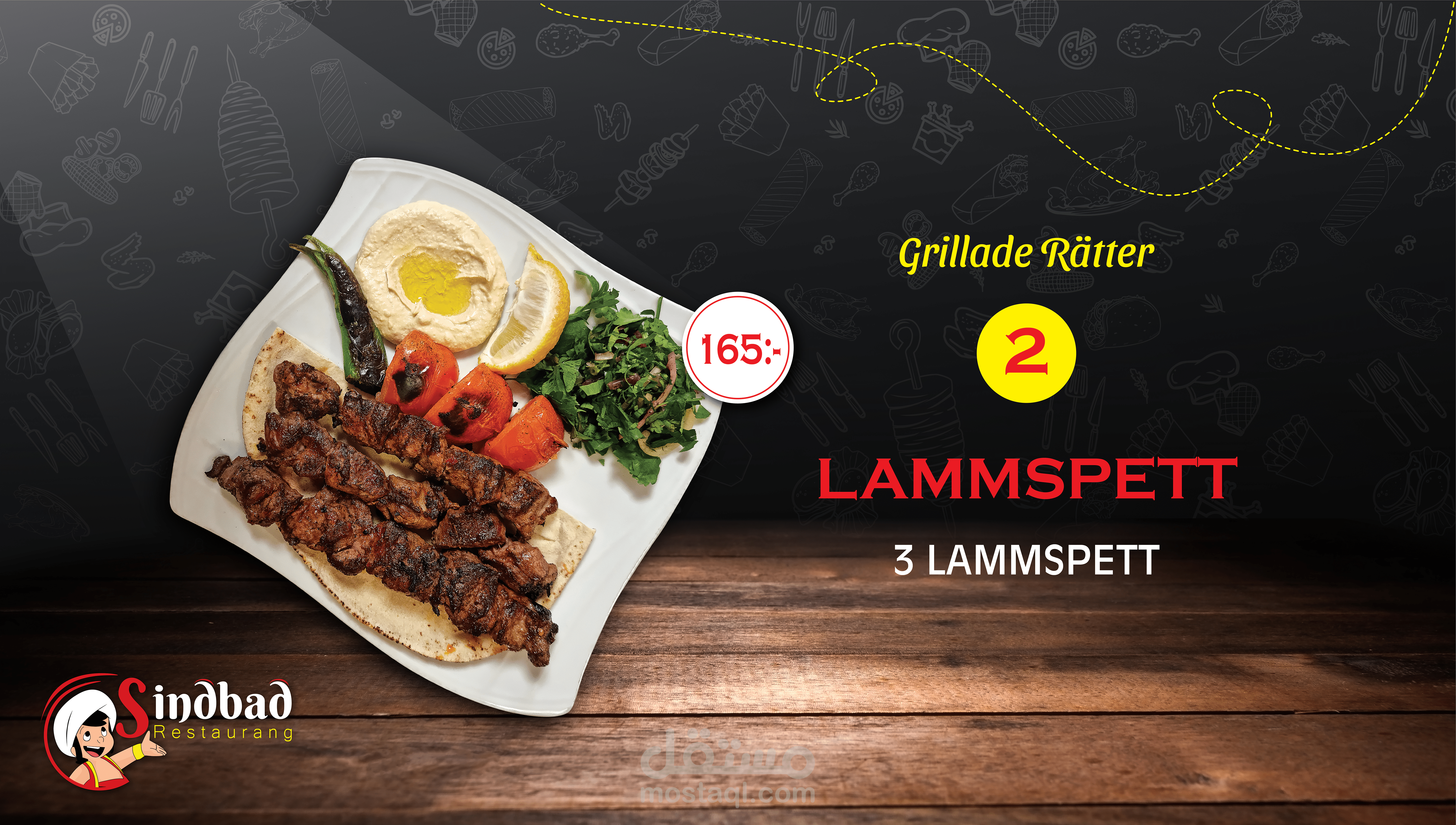 مطعم سندباد في السويد من المطاعم الجيدة وقد قمت بعمل تصميم يتناسب مع الاسم. لقد اخترت الخلفية الرمادية مع وجود صور مرسومة للاطعمة مع درجة شفافية مناسبة بحيث تظهر الخلفية بشكل مميز.