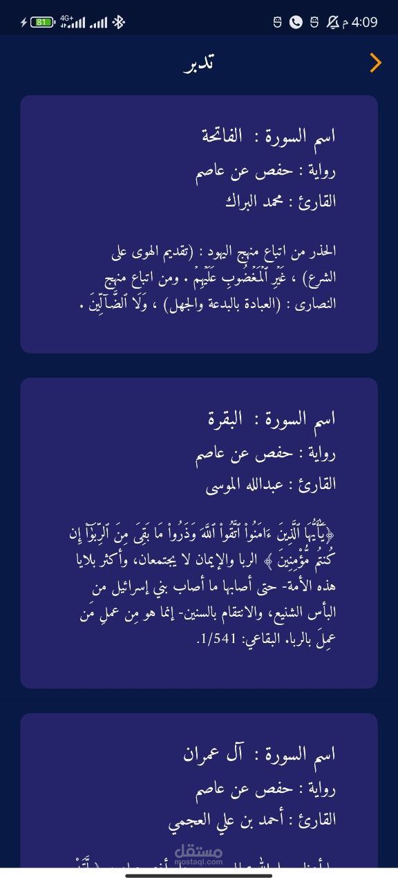 تطبيق لقراءة القران والإستماع له يتوفر به العديد من القراءات والكثير من القراء