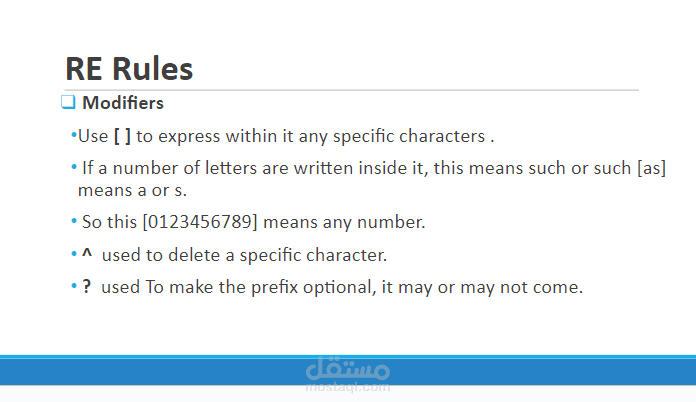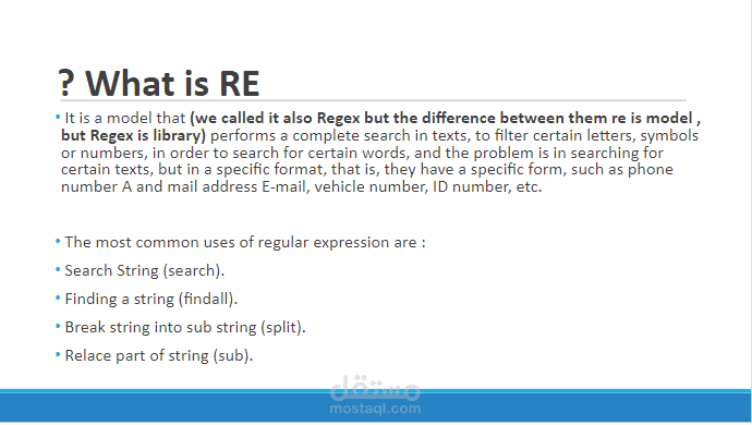 # في هذا العرض وضحت استخدام RE model ، عرفنا فيه بعض قواعد هذا الmodel، وأيضا علمنا ما هي المعرفات فيه (identifiers)، وأيضاً تم شرح فيه ال(functions) المستخدمة فيه، وهي :