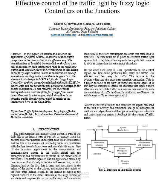 # هذه ورقة بحثية علمية بعنوان (Effective control of the traffic light by fuzzy logic Controllers on the Junctions)، وهي تعني التحكم الفعال في متحكمات المنطق الضبابي على تقاطعات الطرق.