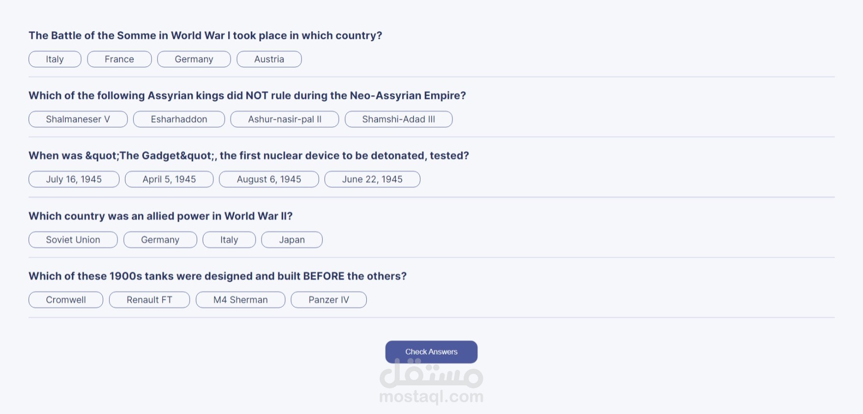 The site fetches some general questions via API and presents them to you to answer these questions and test yourself.