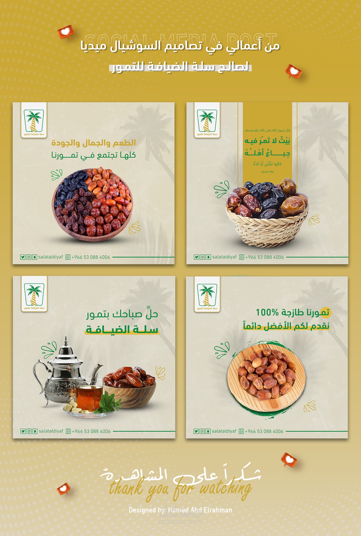 تصاميم ابداعية واحترافية باستخدام الفوتوشوب والاليستريتور لصالح تمور سلة الضيافة، لاستخدامها في البراند الخاص بهم على مواقع السوشيال ميديا - فيس بوك وانستغرام.