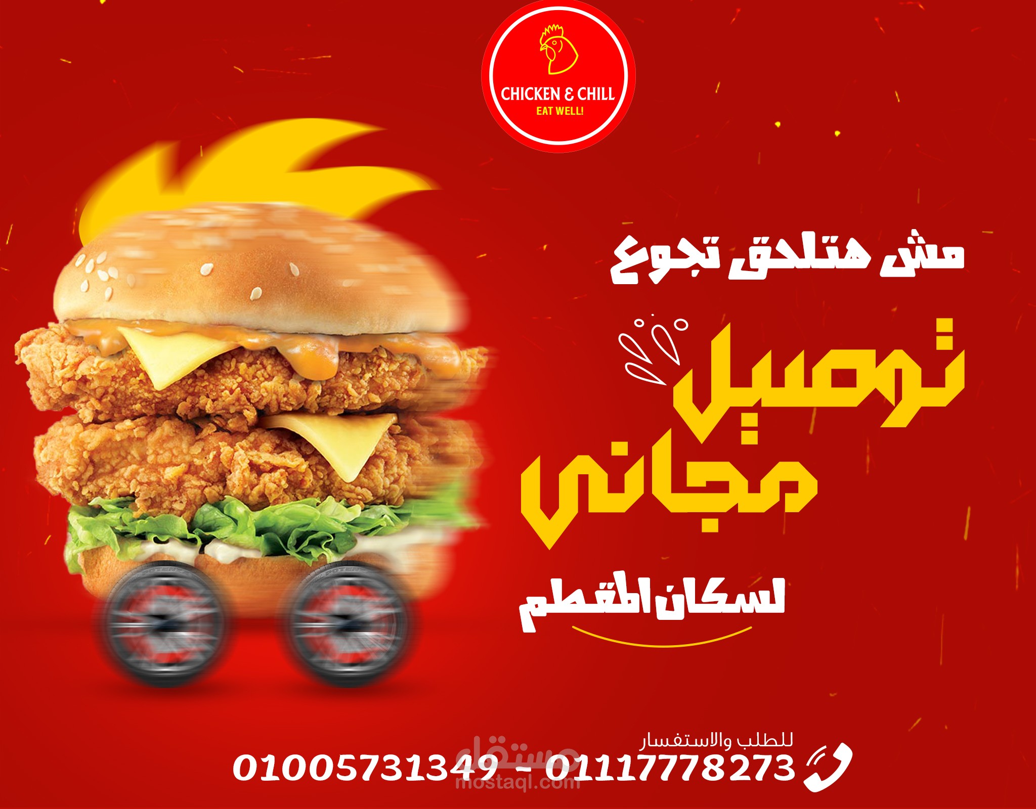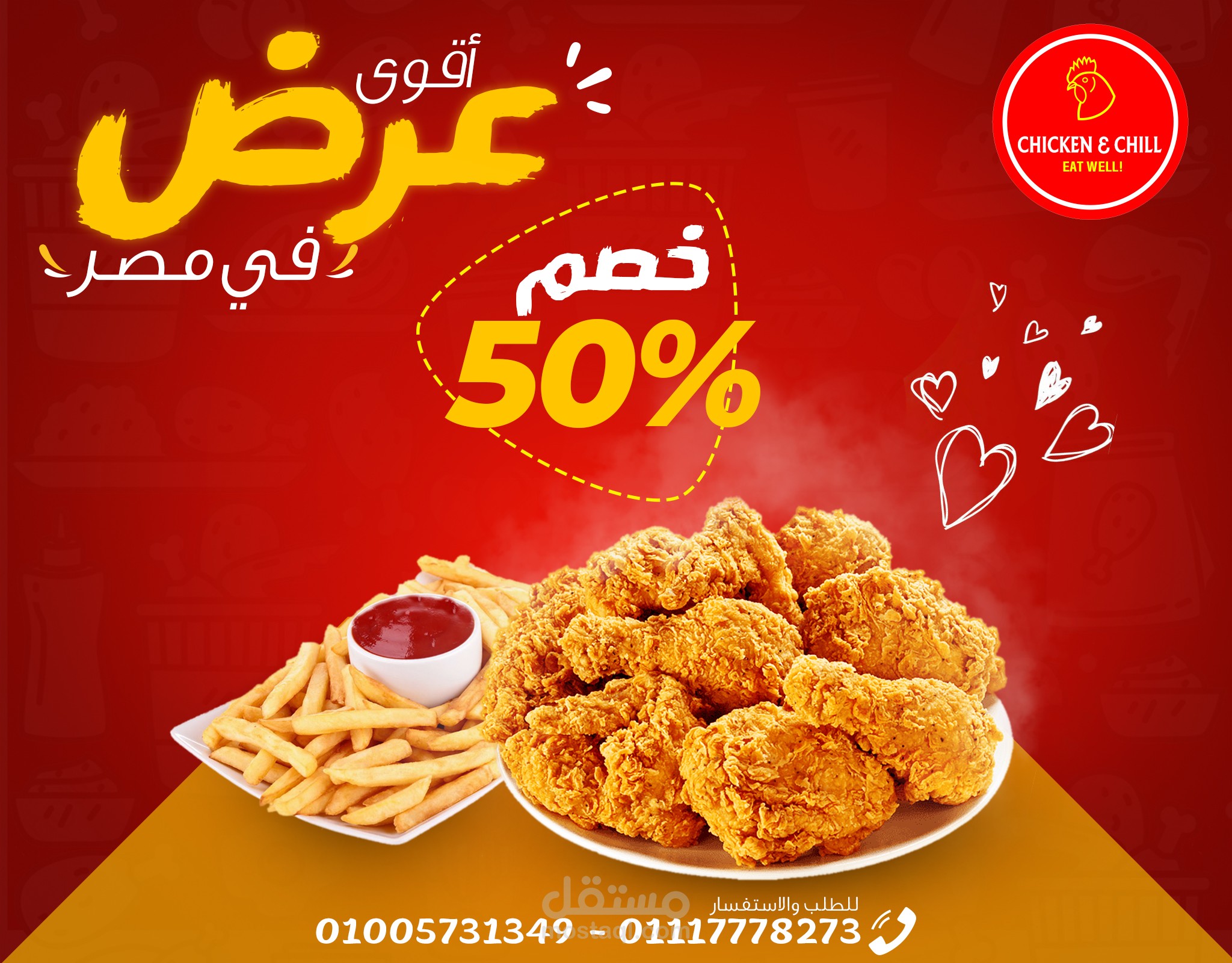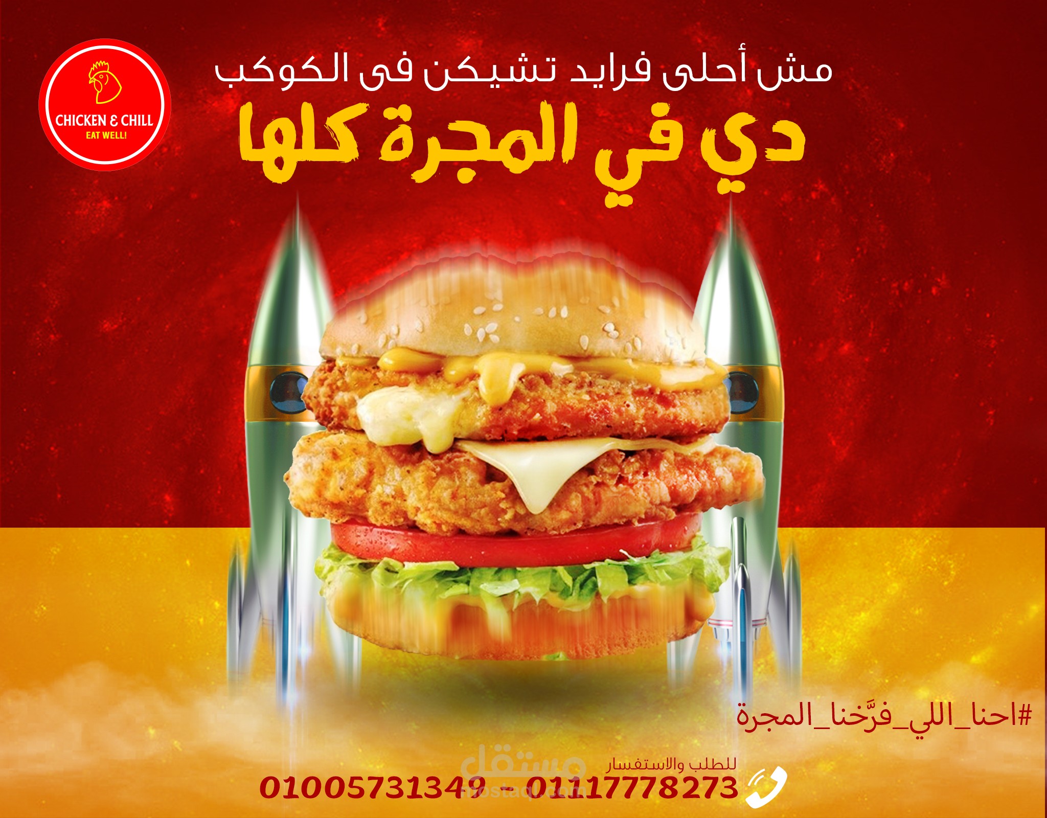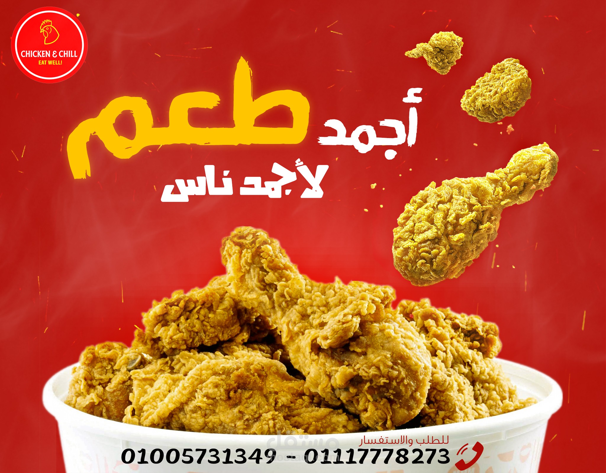 قمت بتصميم الإعلان بطريقة جذابة ومميزة، واستخدمت صور عالية الجودة للأطعمة والمشروبات اللذيذة التي تقدمها Chicken and Chill.
