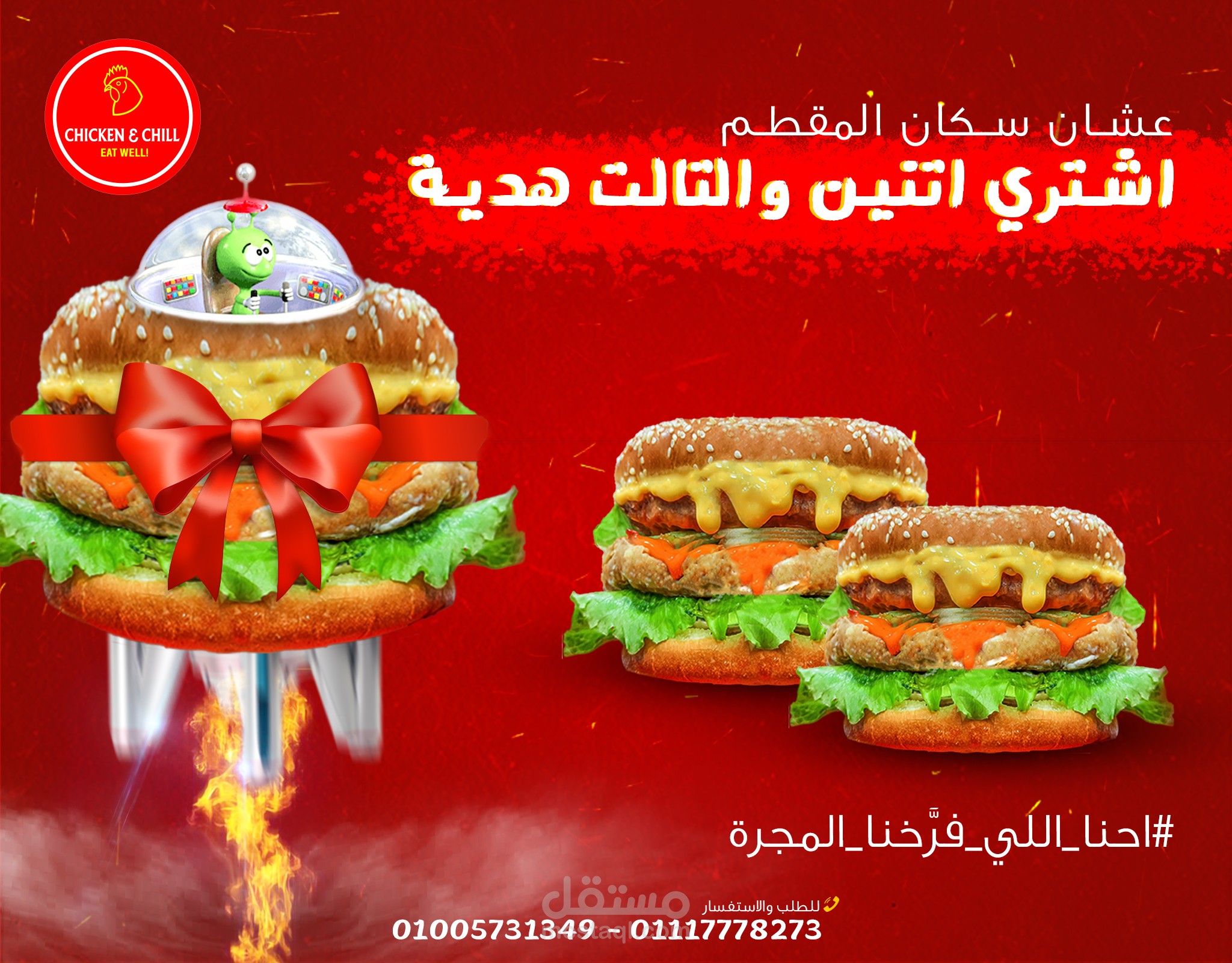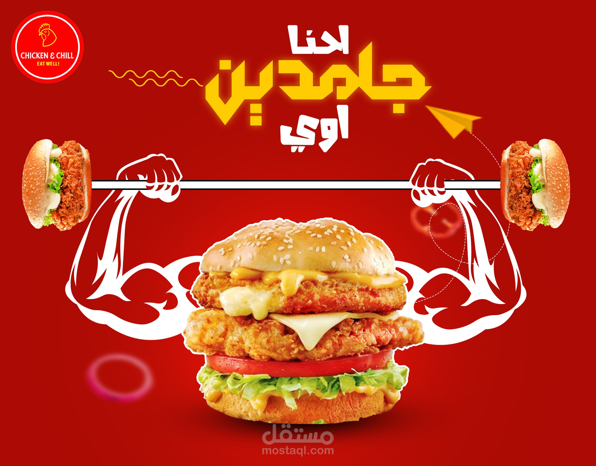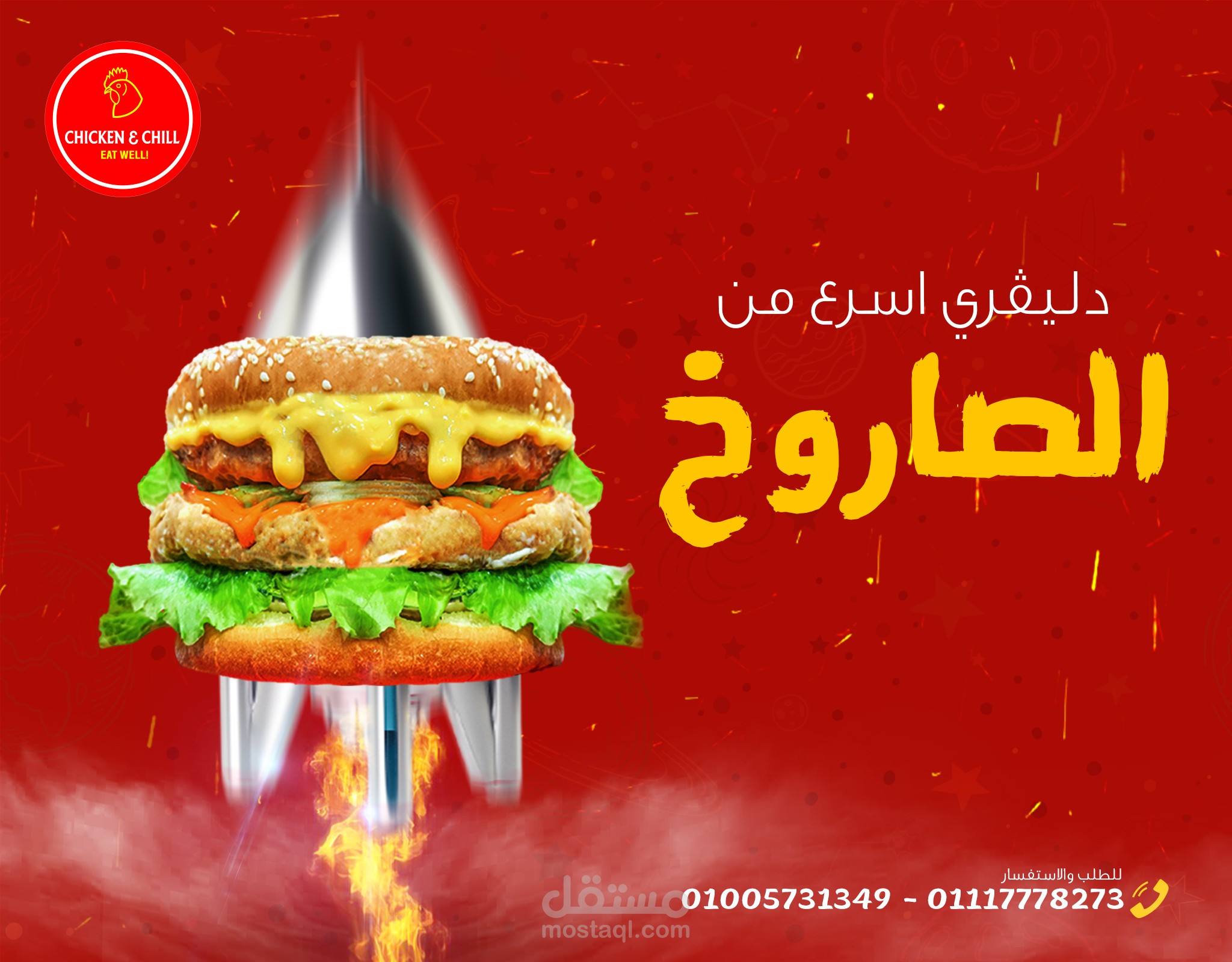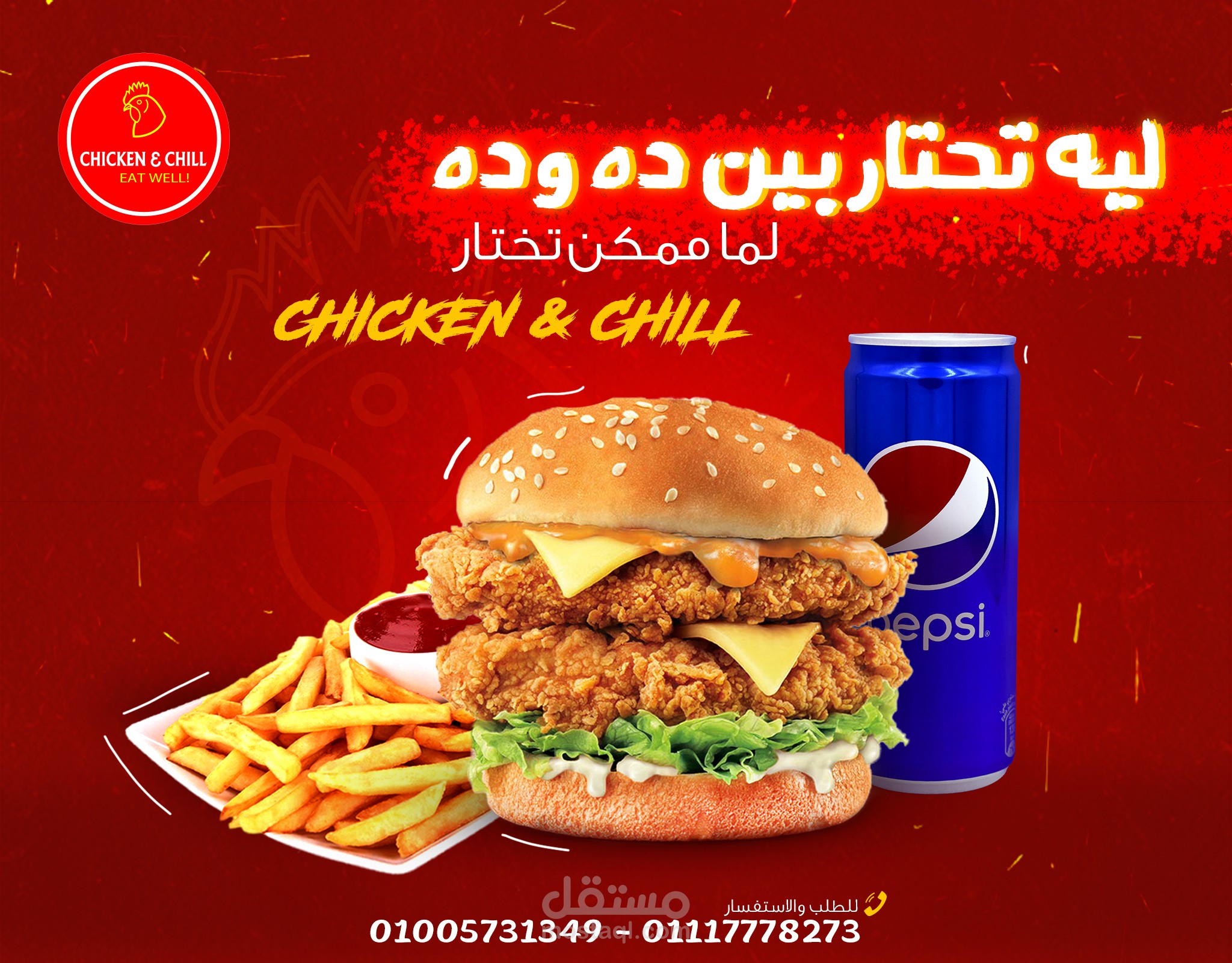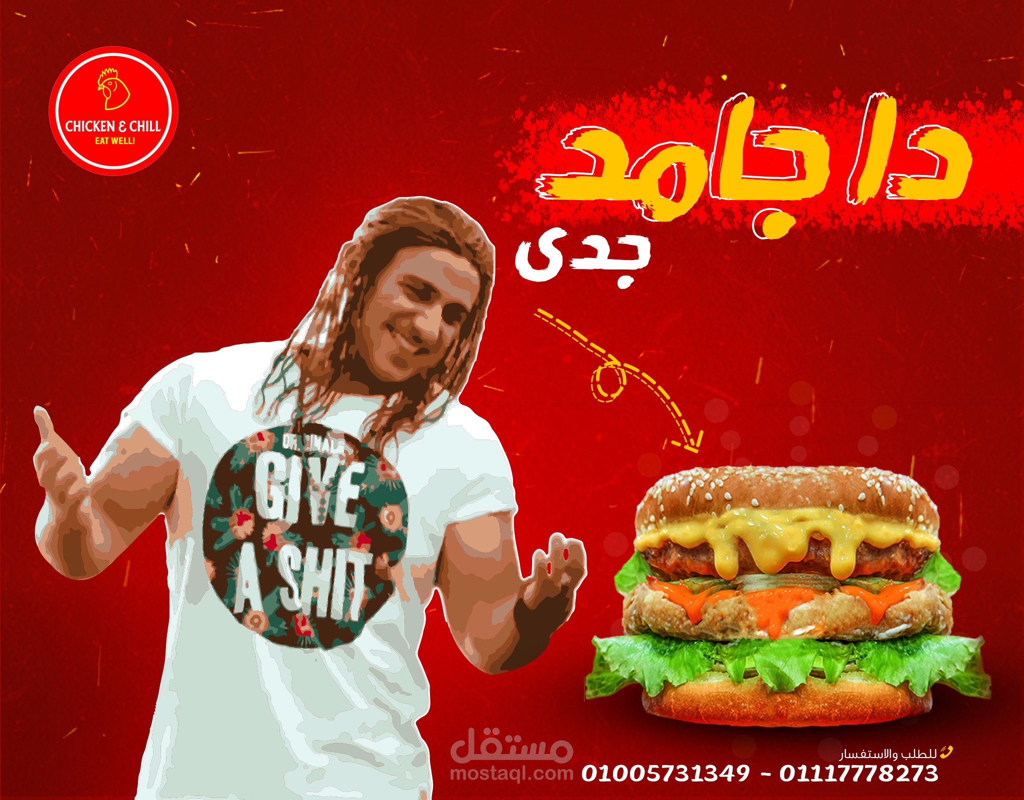 قمت بتصميم الإعلان بطريقة جذابة ومميزة، واستخدمت صور عالية الجودة للأطعمة والمشروبات اللذيذة التي تقدمها Chicken and Chill.