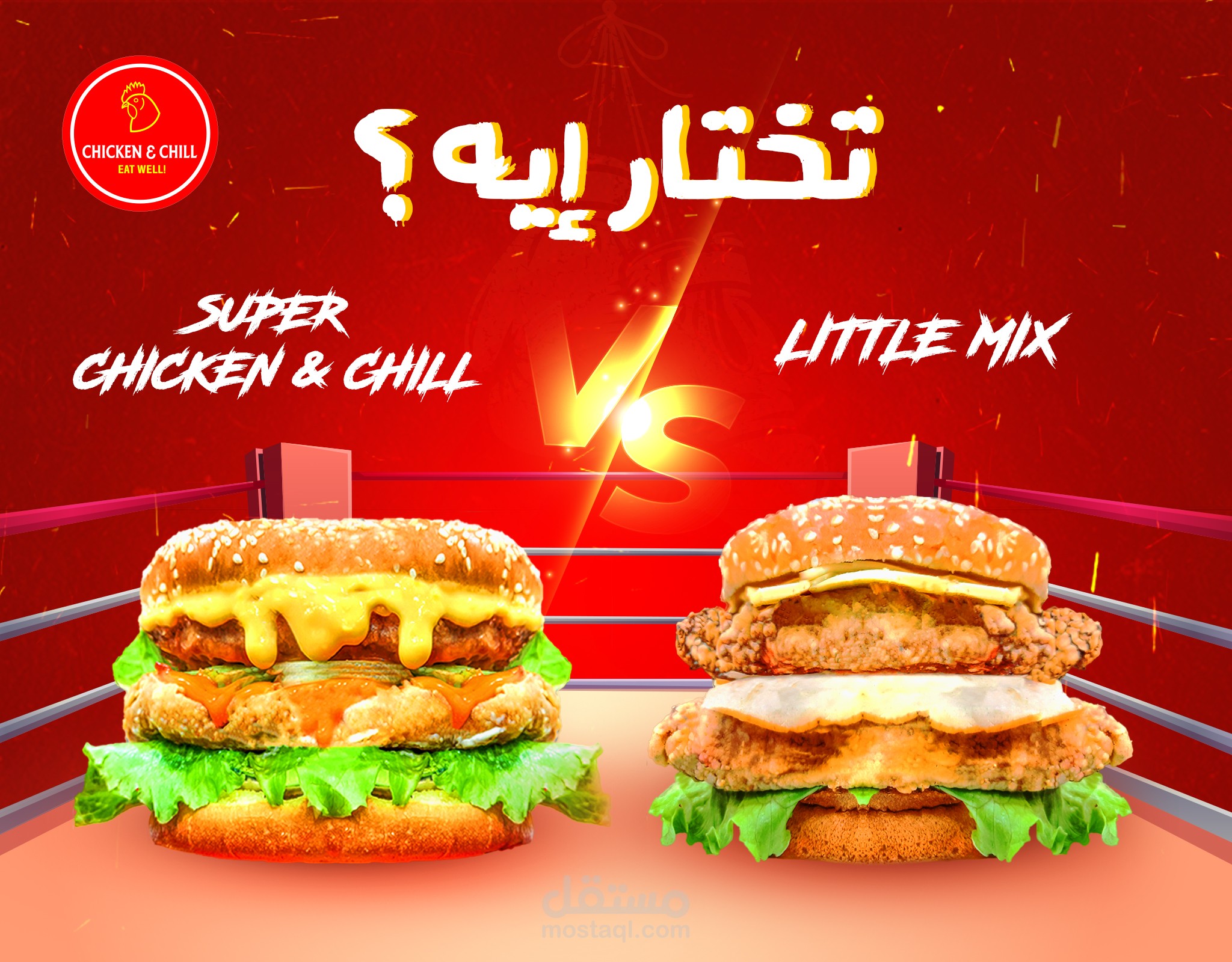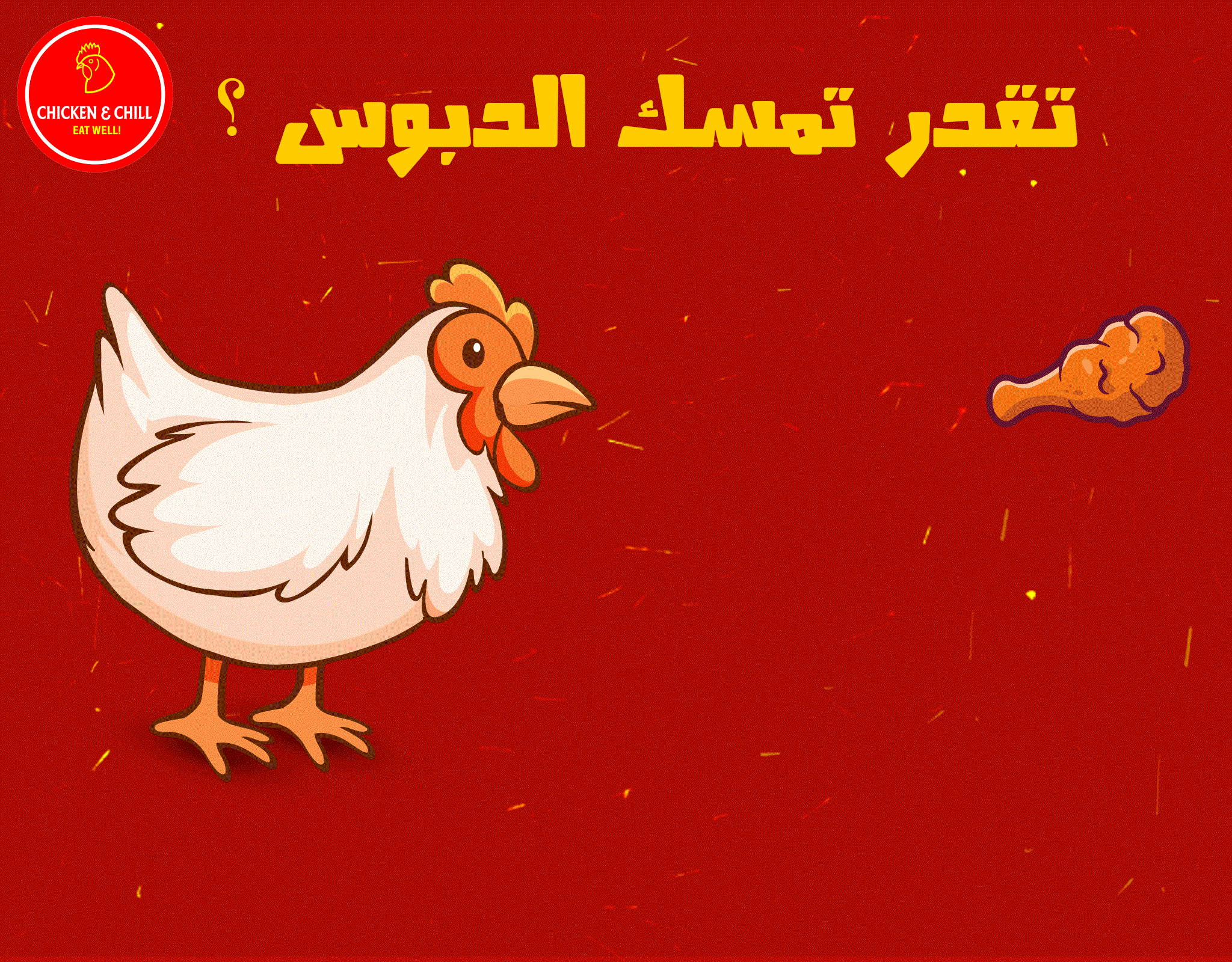 استخدمت الألوان المناسبة للإعلان والتي تناسب مفهوم مطعم Chicken and Chill، وجعلتها متناسقة ومتناغمة مع بعضها البعض.
