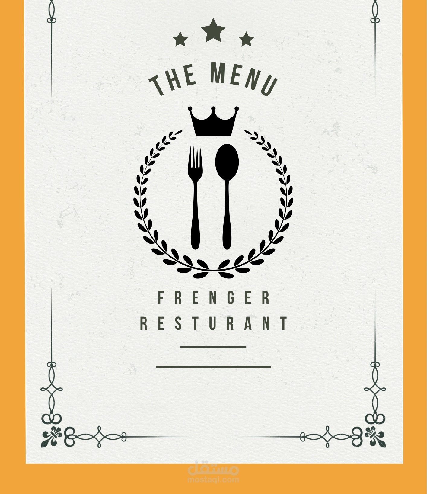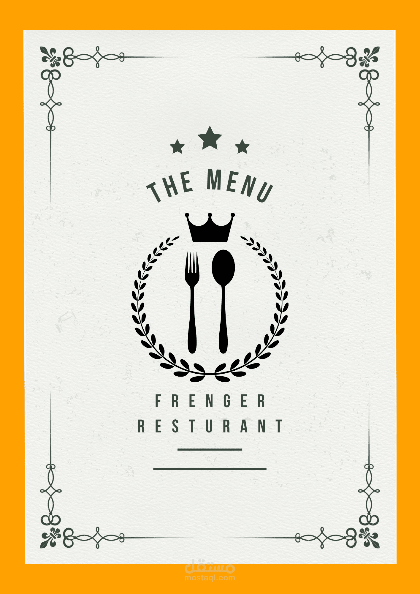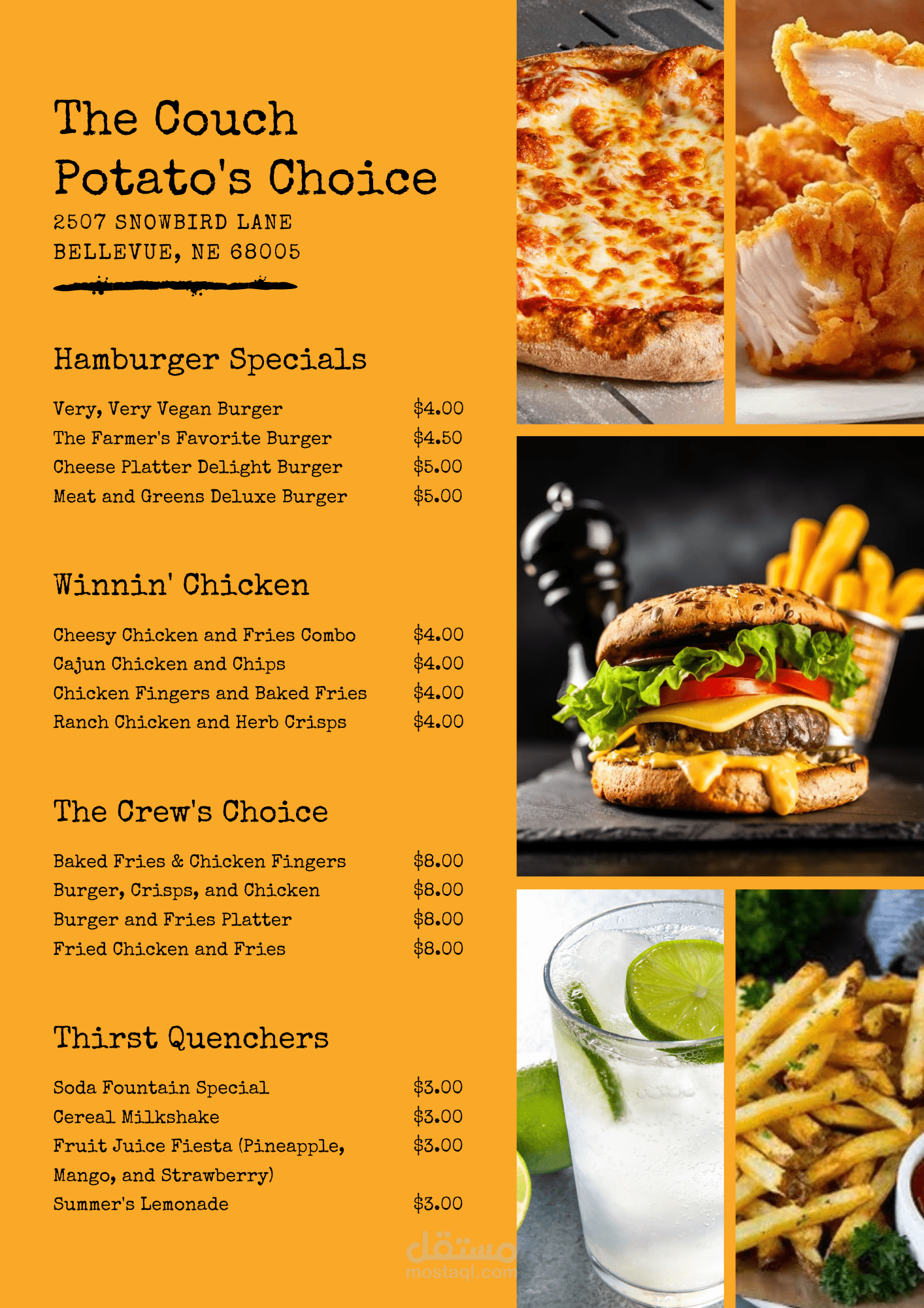 منيو لمطعم يتضمن الوجبات الرئيسية مع السعر كما يتضمن المشروبات و صور بشكل جذاب بشكل يعجب العميل و اللون الاصفر المائل للبرتقالي كلون البطاطس و الدجاج مما يعطي تناسق في الالوان