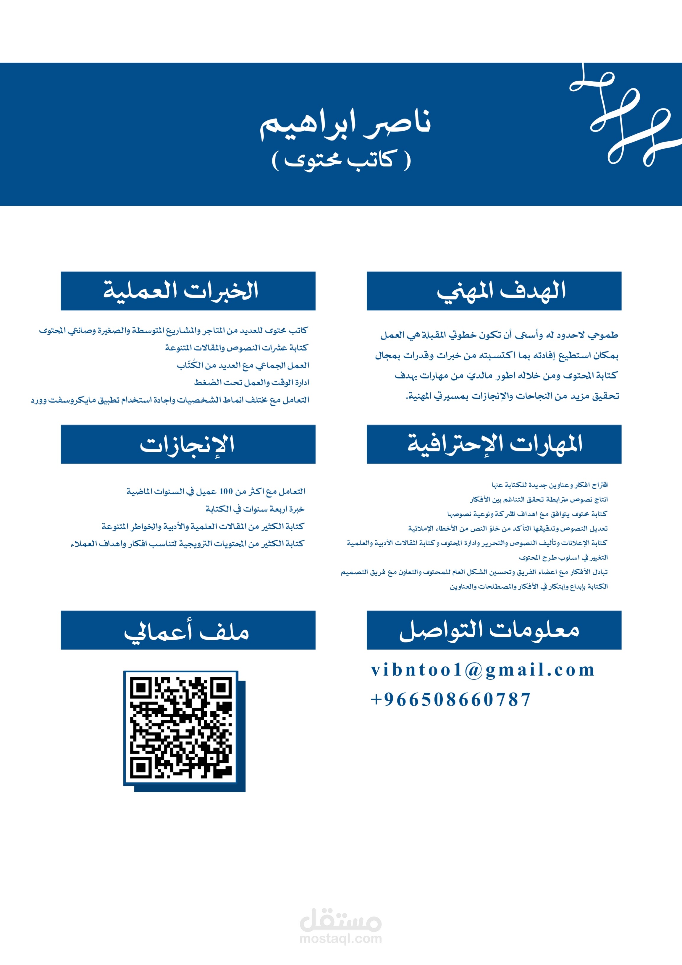 سيرتي الذاتية بالنسبة لمهارة كتابة المحتوى بالاضافة الى ملف اعمالي