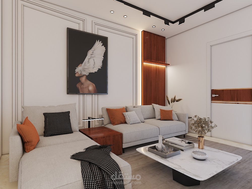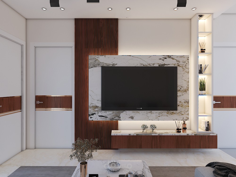 • Modern living area , soft colors , warm woods and marble tv wall touch