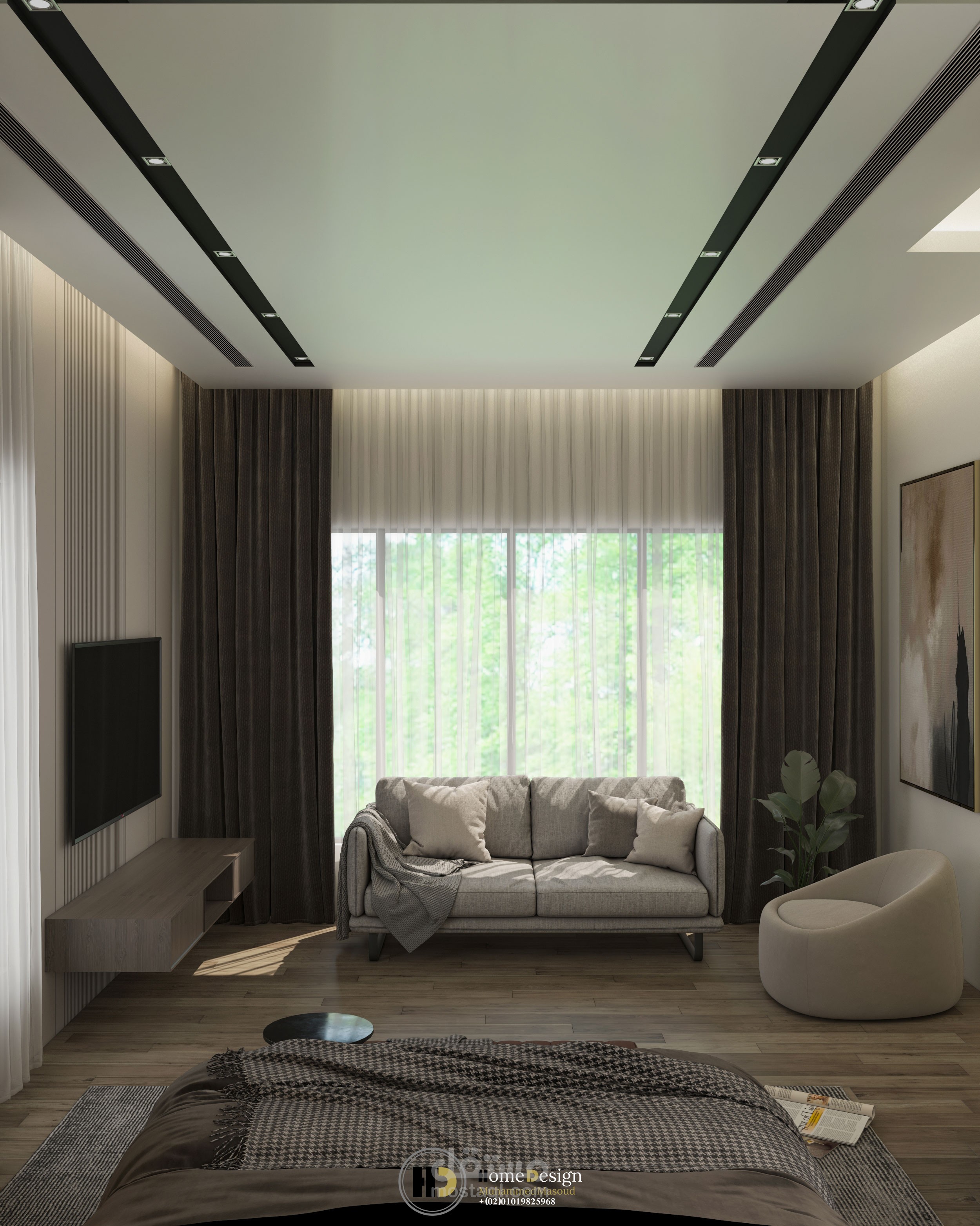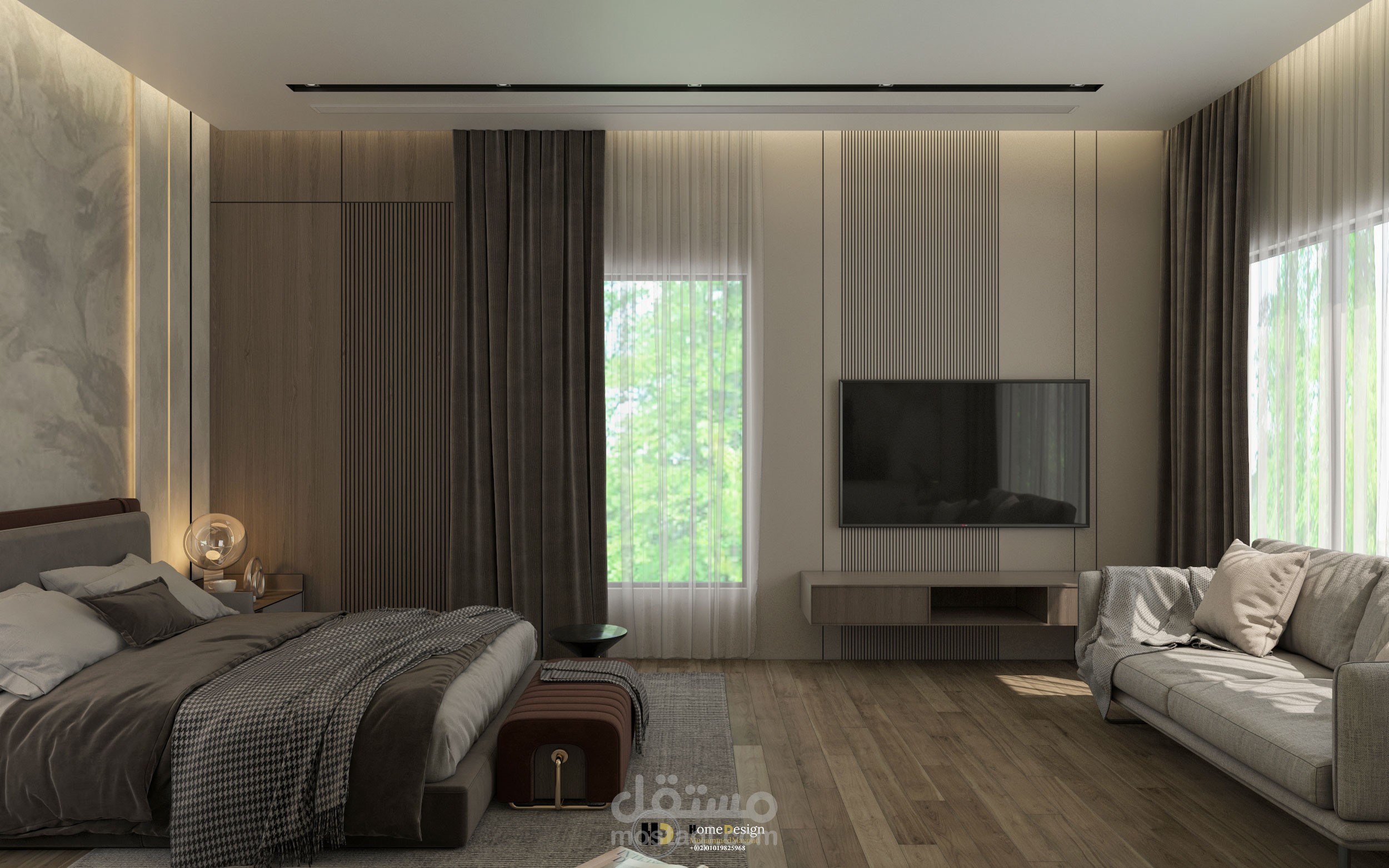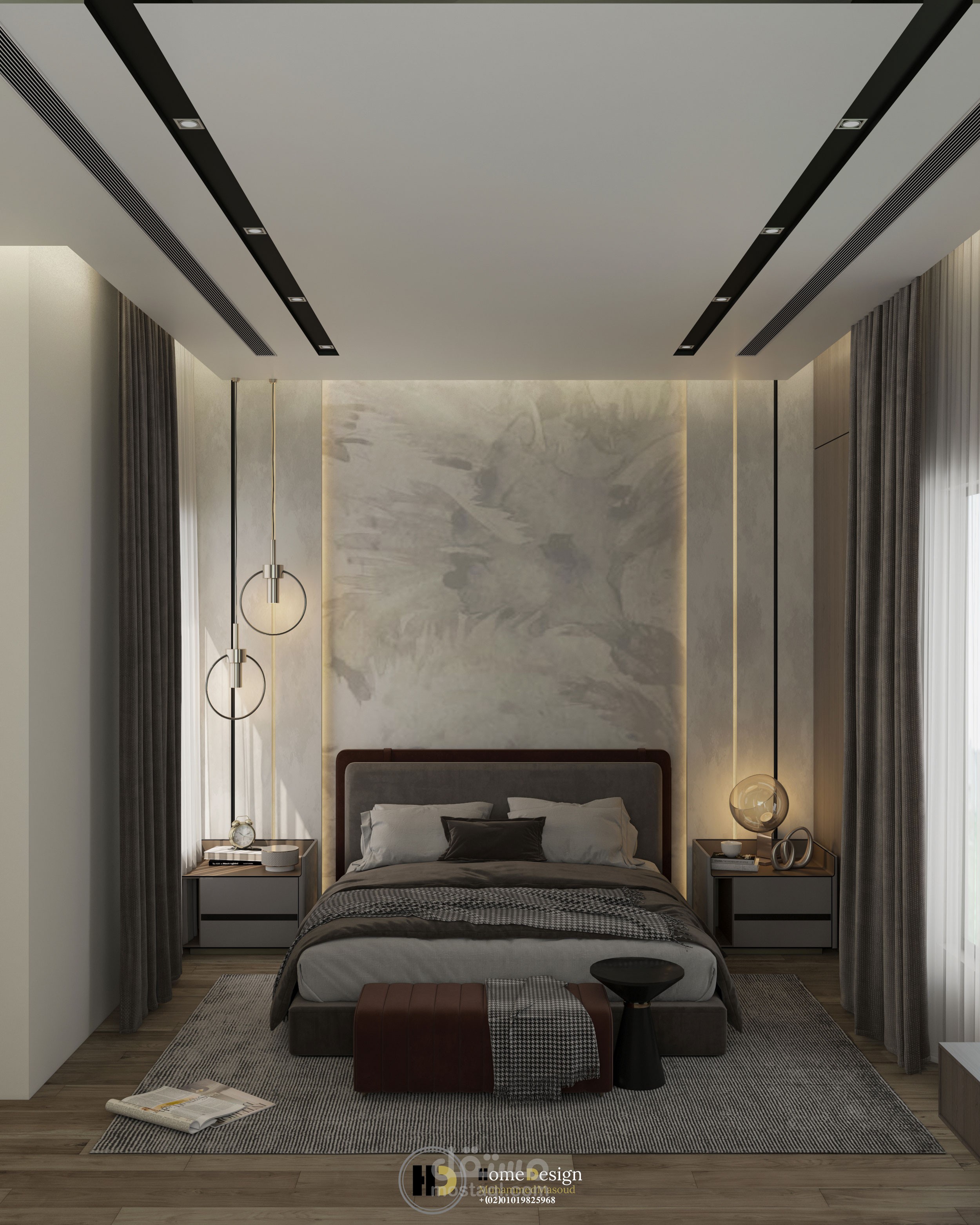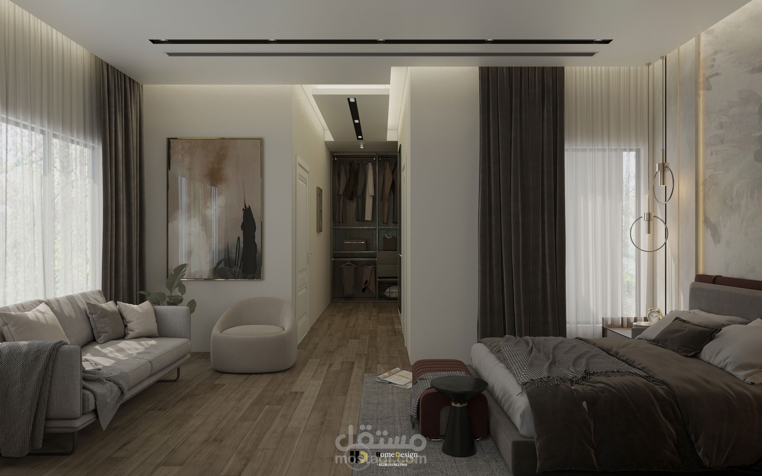 تصميم داخلى لغرفه نوم ماستر ملحق بها حمام ودريسنج .