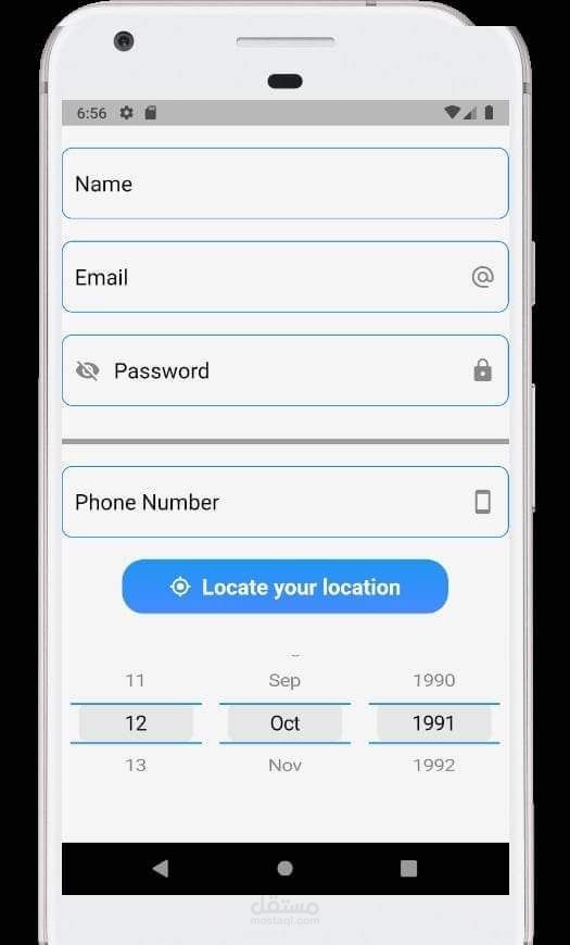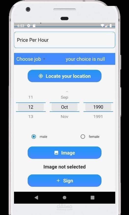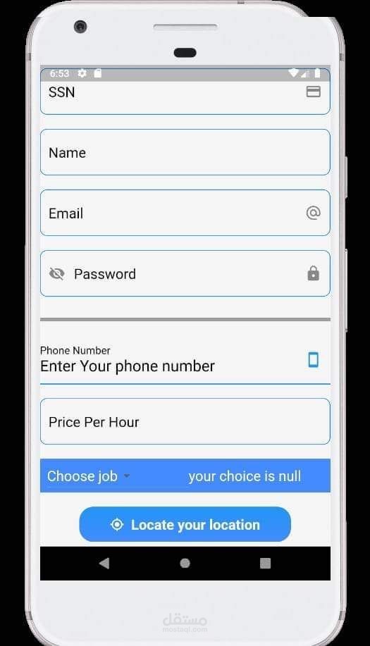- هذا التطبيق يحتوي علي صفحتين للتسجيل في التطبيق واحدة خاصة بالعمال يتم فيها طلب الاتي(الاسم/السن/البريدالالكتروني/كلمة السر بشرط ان تكون قوية /السعر بالساعة/الجنس/الصورة/نوعية العمل/صورة البطاقة لتوثيق الهوية/الموقع تلقائيا عن طريق الضغط علي زر)وصفحة اخري خاصة بالعميل يتم فيها طلب الاتي (الاسم/البريد الالكتروني/كلمة السر/الموقع)