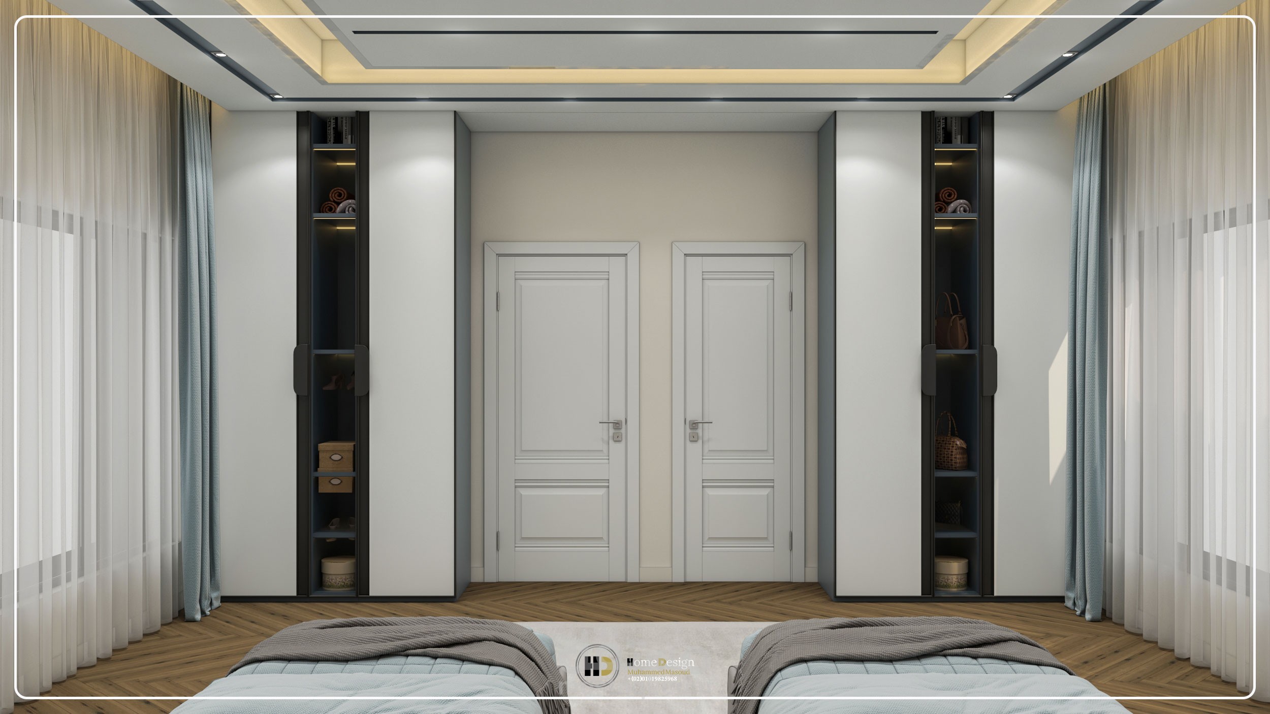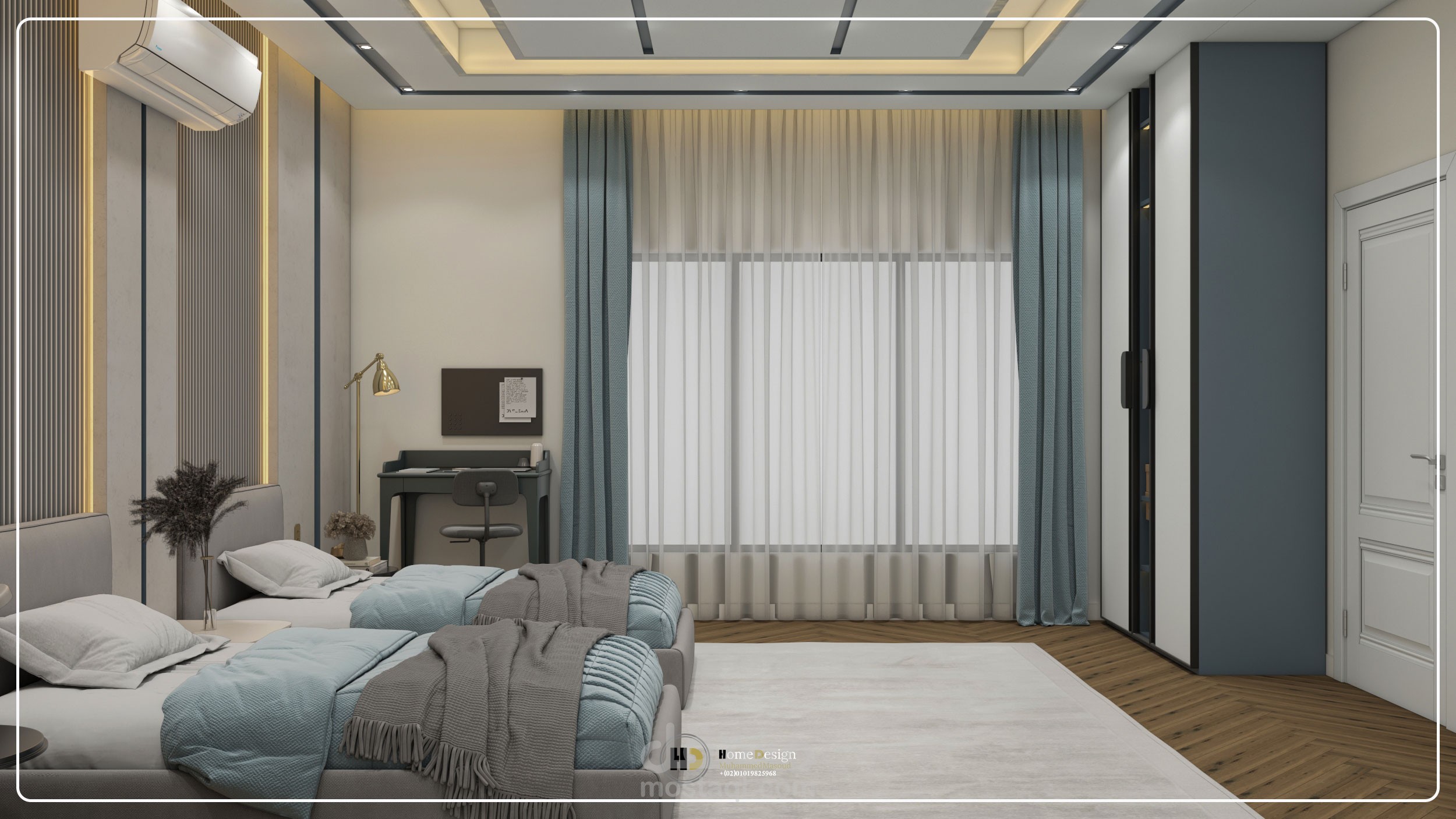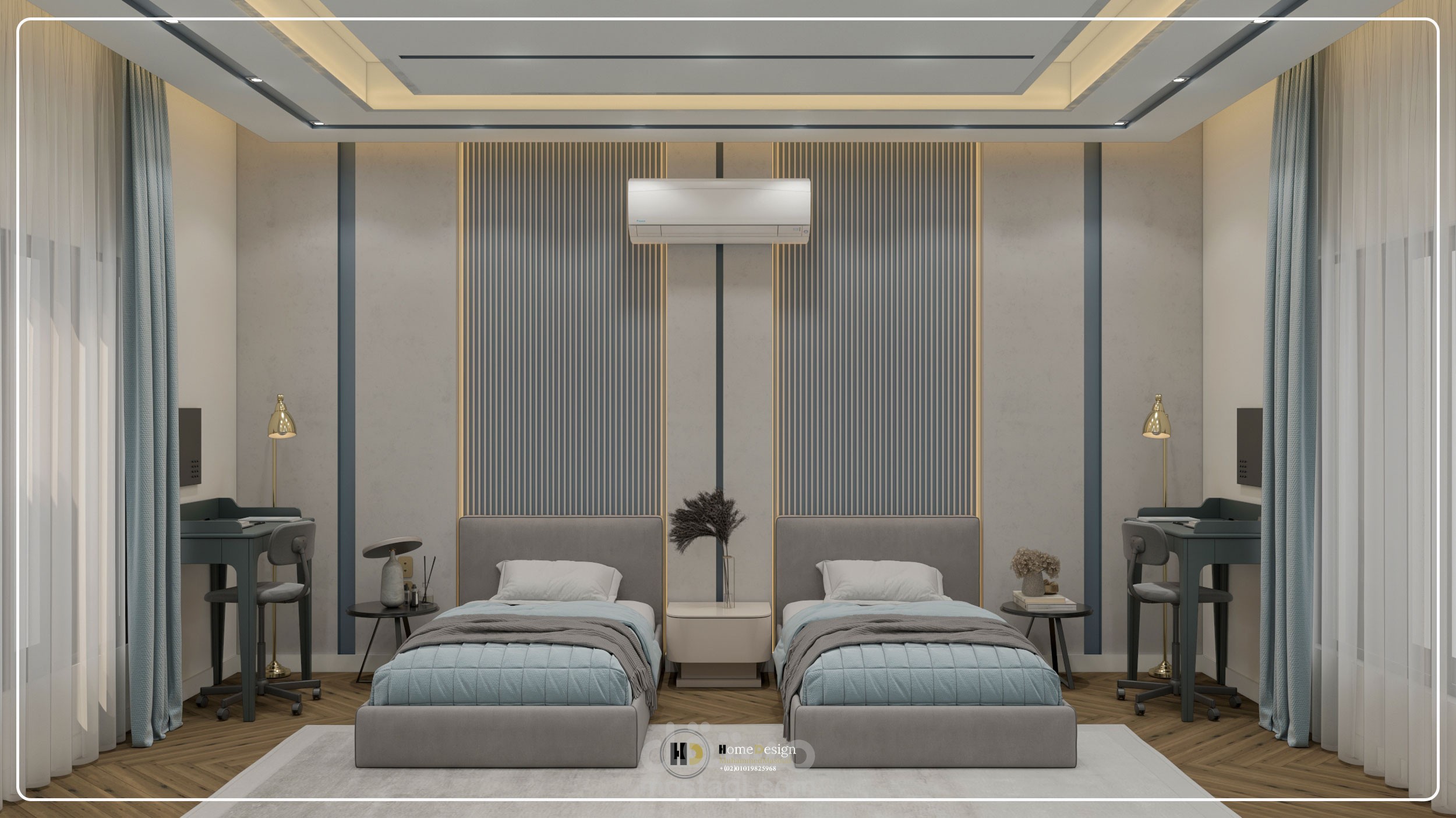 تصميم معمارى لغرفه نوم اطفال بسريرين ذات طابع مودرن والوان عصريه جذابة