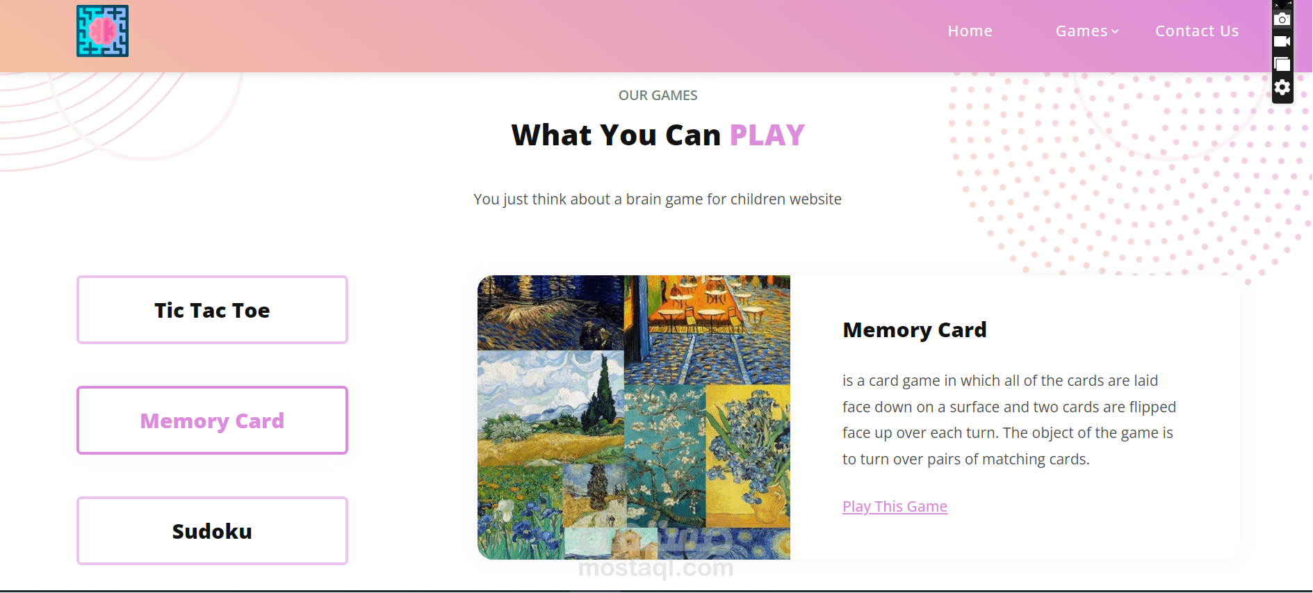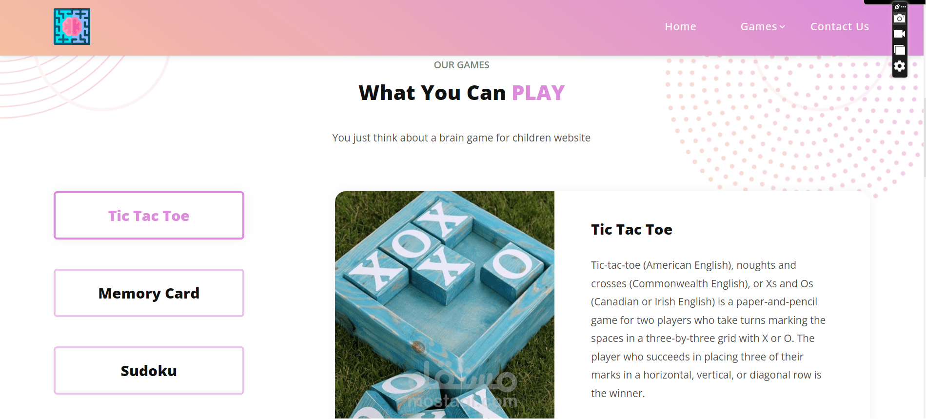 يضم الموقع العديد من ألعاب الذكاء التي تتطلب التركيز والتفكير الهادف، بما في ذلك: