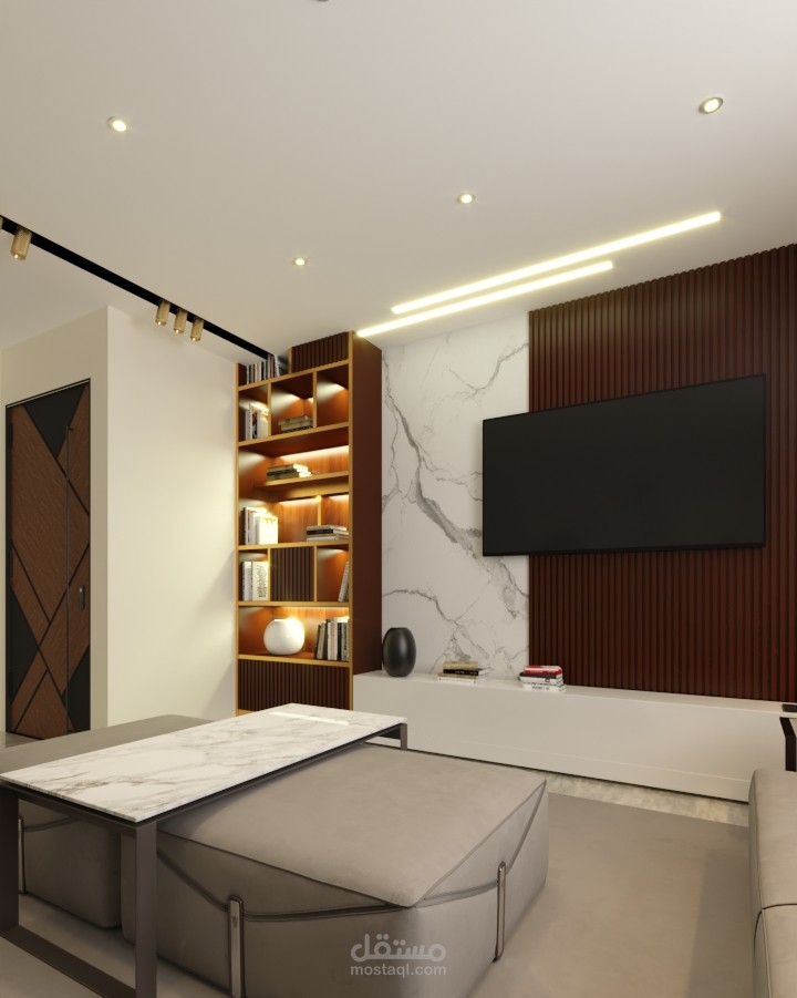 تم التصميم علي الطراز الحديث و إستخدام بديل الخشب و الرخام مع مكتبة من الخشب