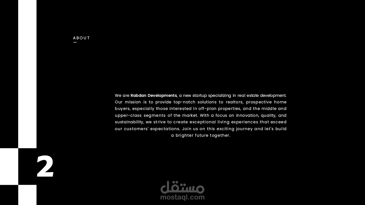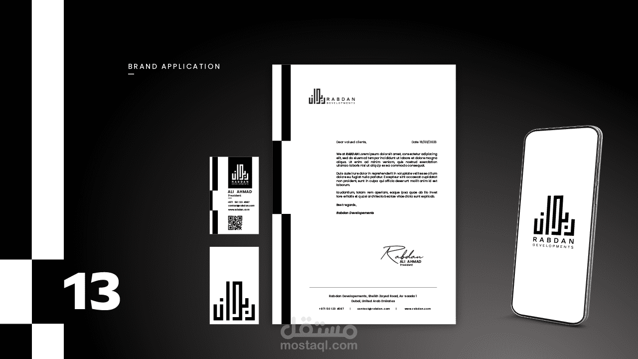 يهدف هذا المشروع إلى تصميم براند كامل لشركة عقارية تدعى "Rabdan Developments" مقرها دبي . وتضمنت المهام المطلوبة تصميم الشعار والهوية البصرية للشركة، بما في ذلك اختيار الألوان والخطوط والصور والرموز التي تعبر عن الهوية الجديدة للشركة.