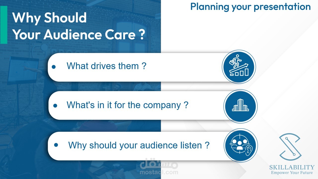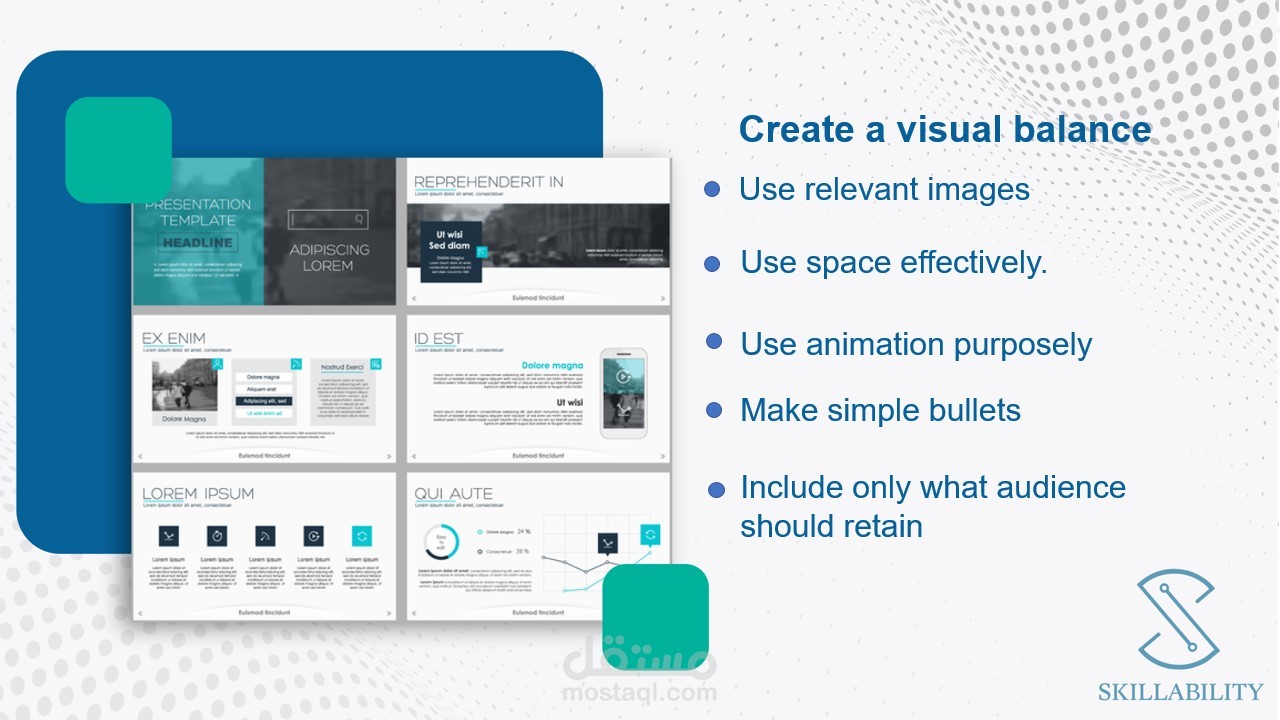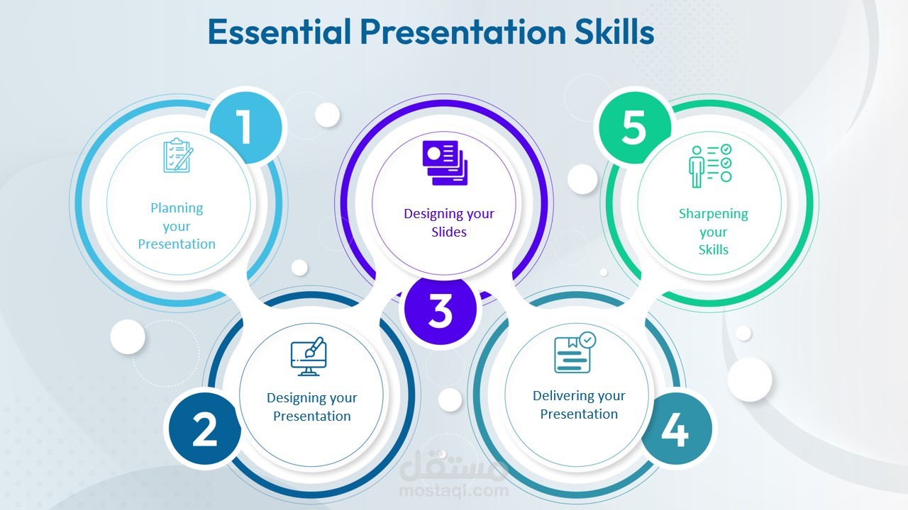 كورس تعلم مهارات العرض تم تصميم شكل مميز باستخدام اشكال معبرة وصور تساعد فى توصيل المعلومه. العميل ارسل المعلومات كلام فقط و تم تحويله الى هذا الشكل