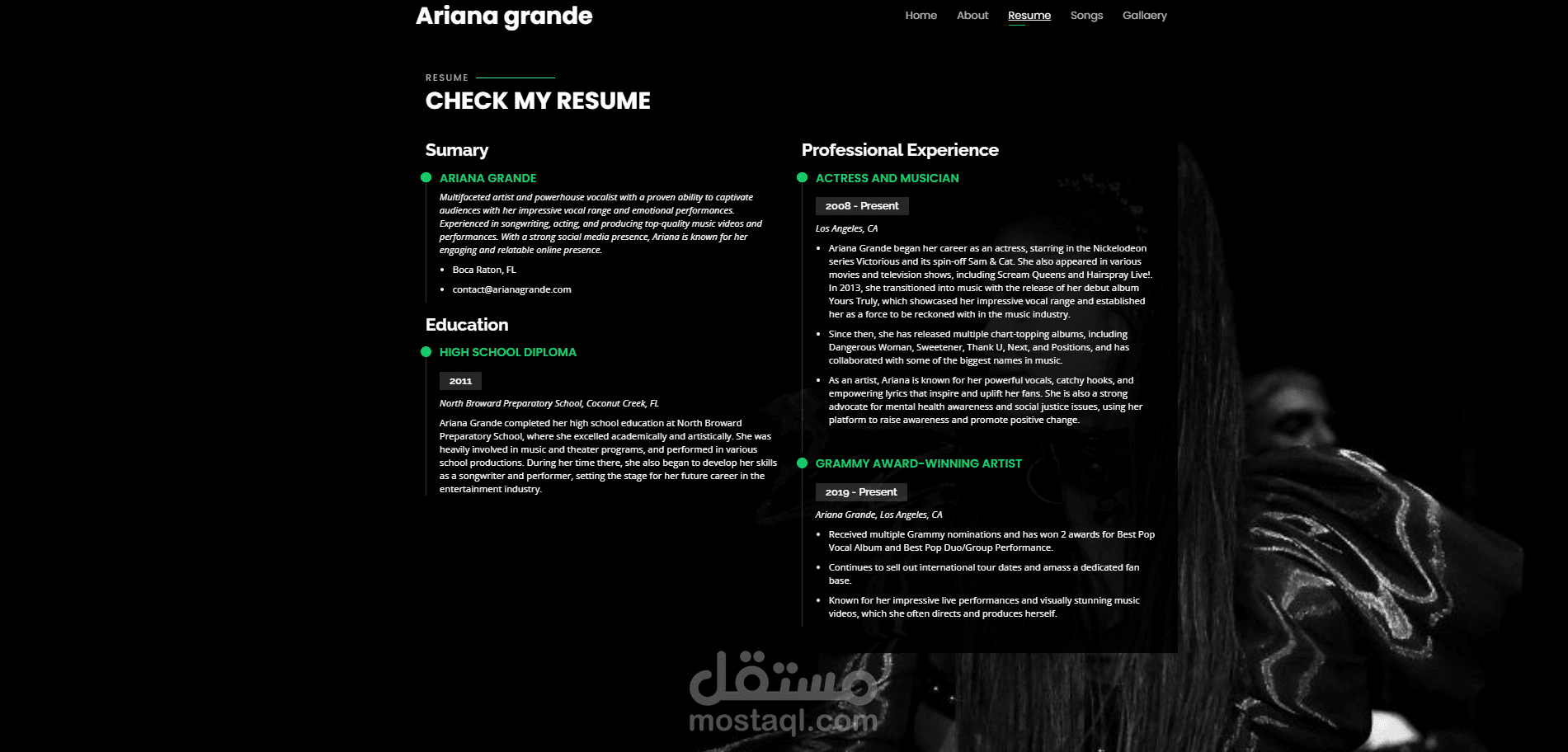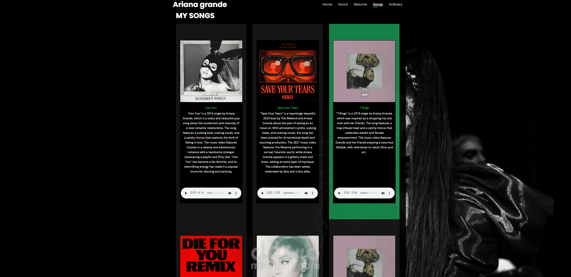 The second section is a profile page for each singer, which includes their songs, a biography,