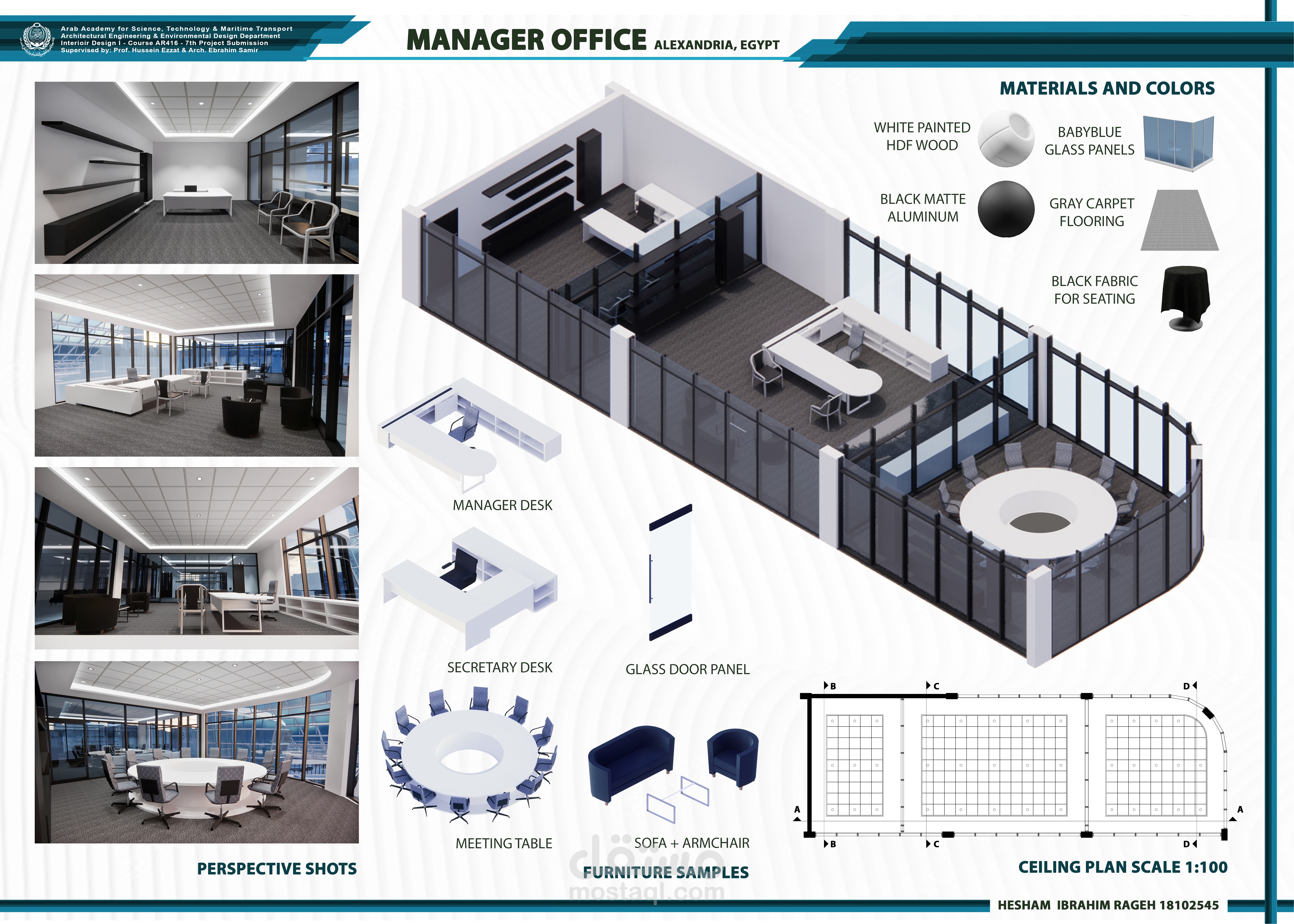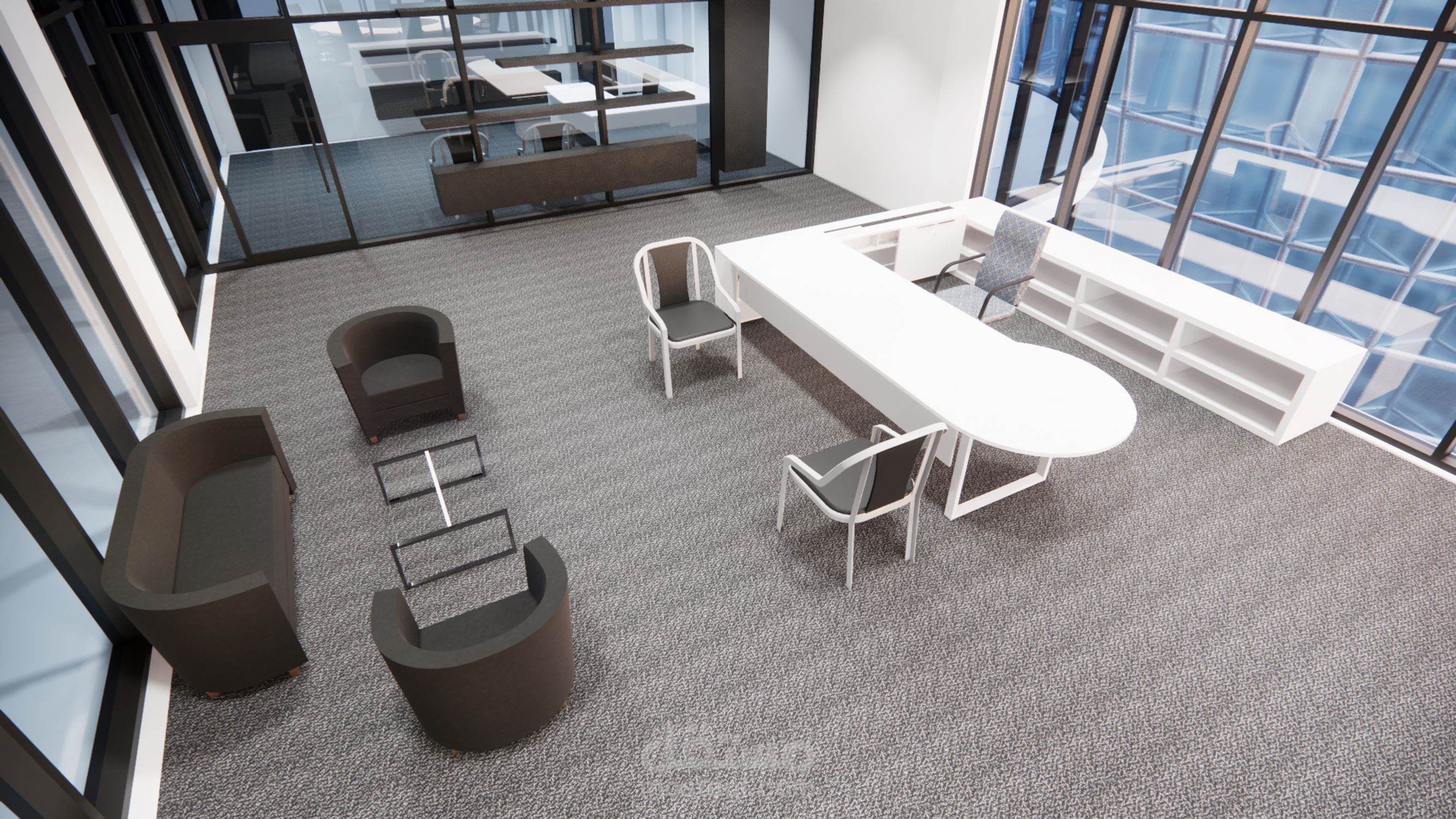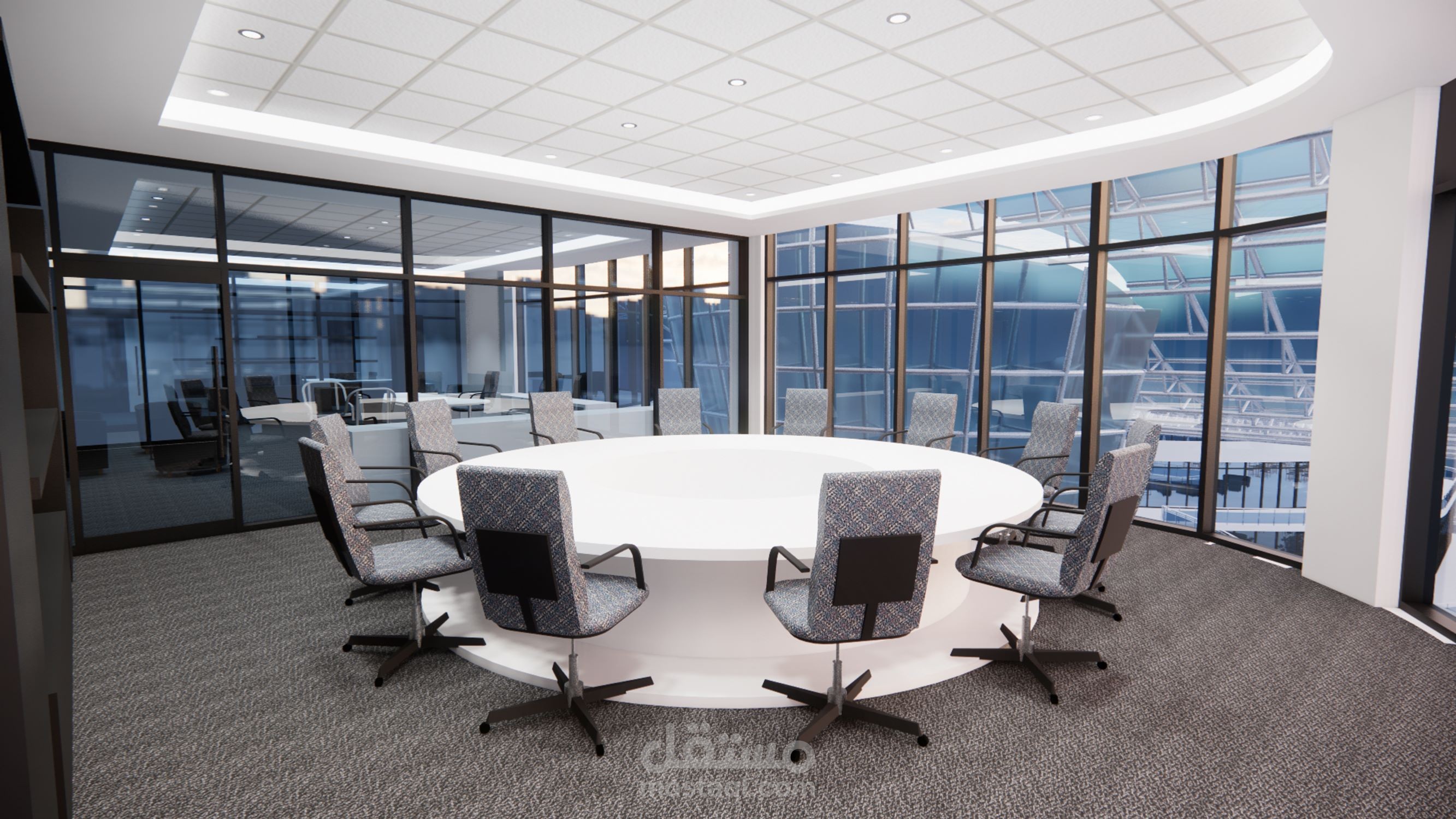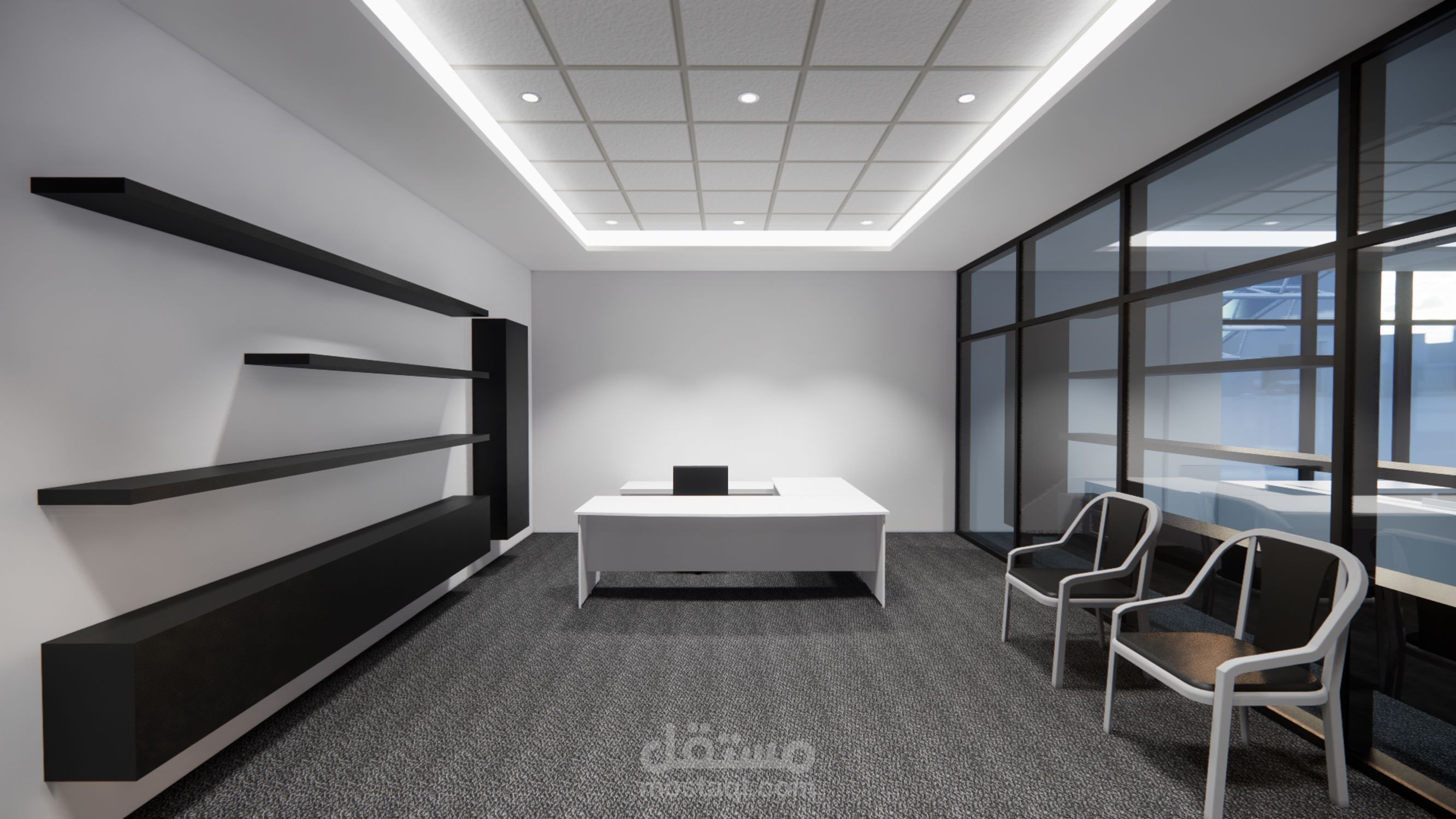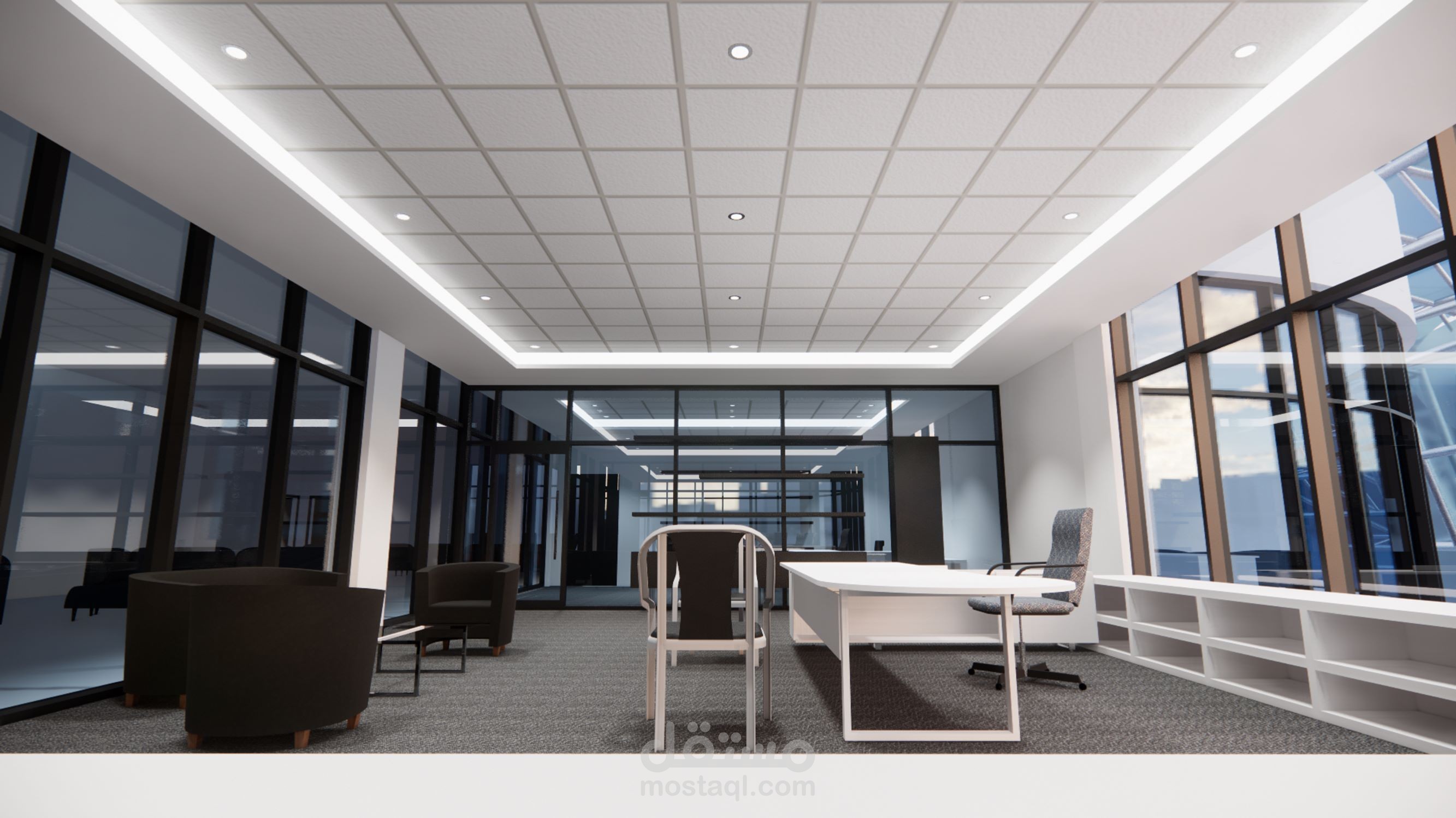 تصميم مكتب مدير لمبنى اداري يشمل ملحاقته من مكتب رئيسي وغرفة اجتماعات وسكرتارية.