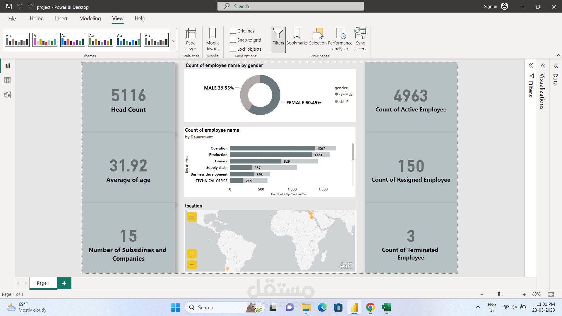 و تم خروج المطلوب من عدد الموظفين و عددهم في كل قسم و عدد الفروع ورسم خريطة للفروع الخاصة بها
