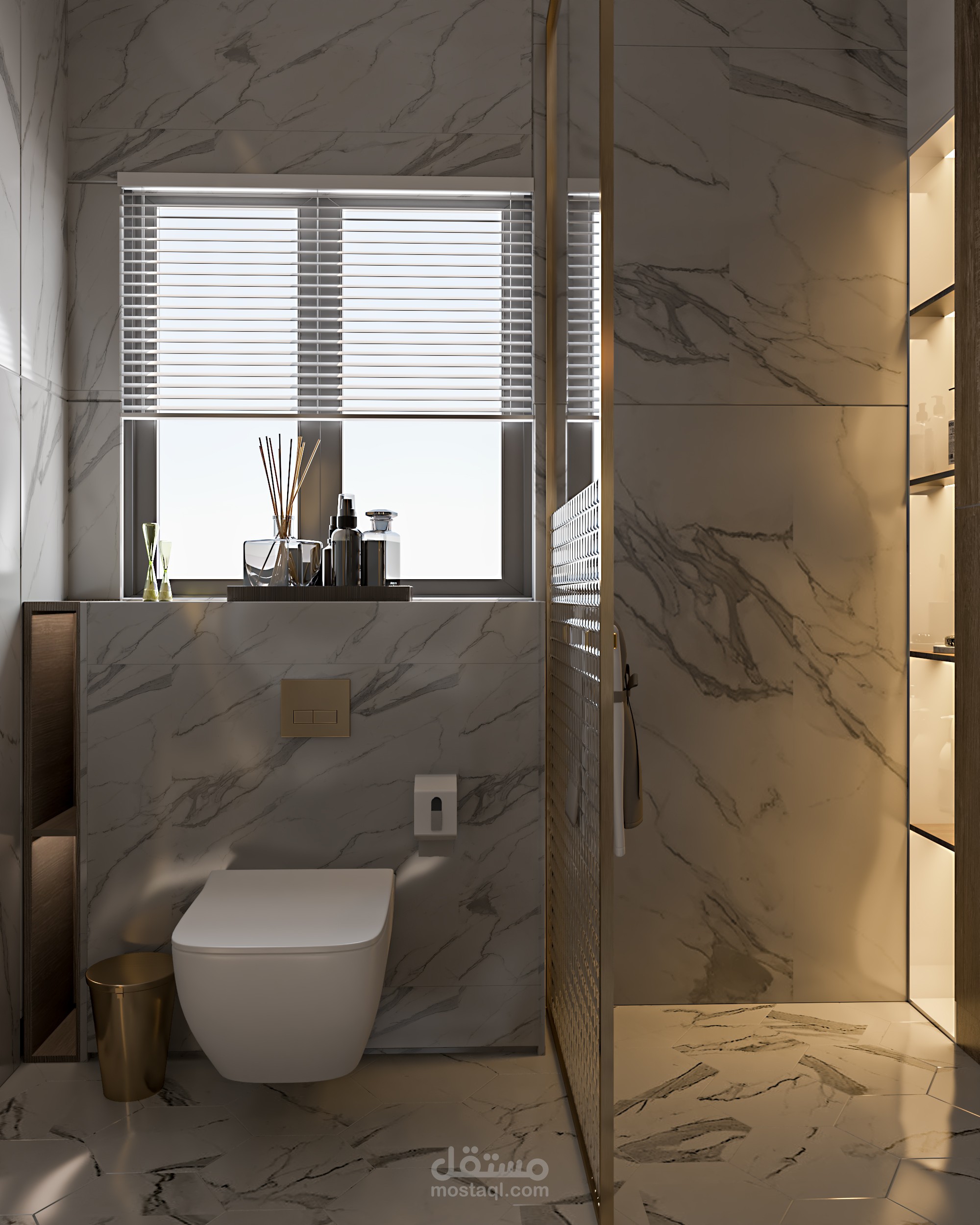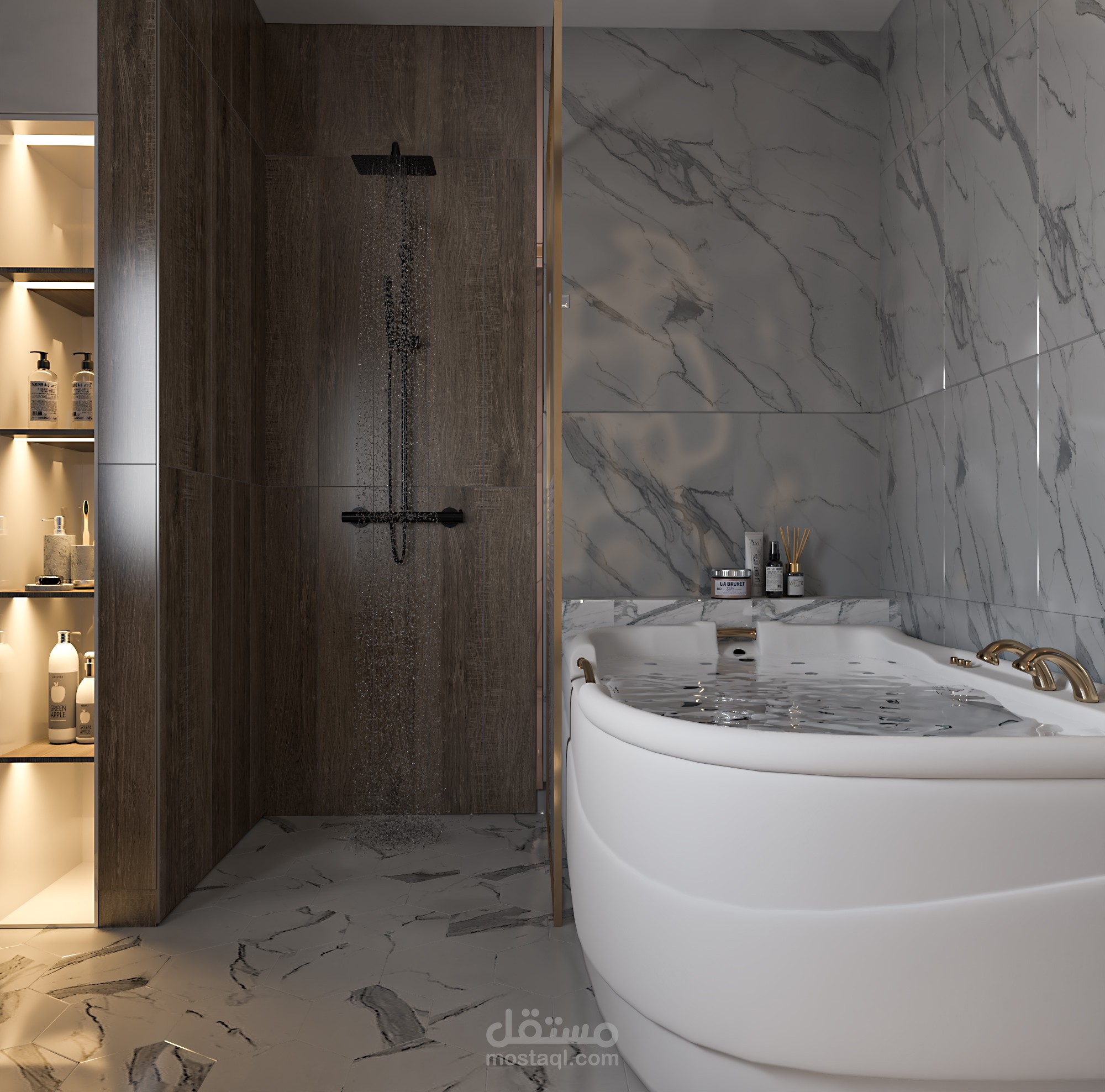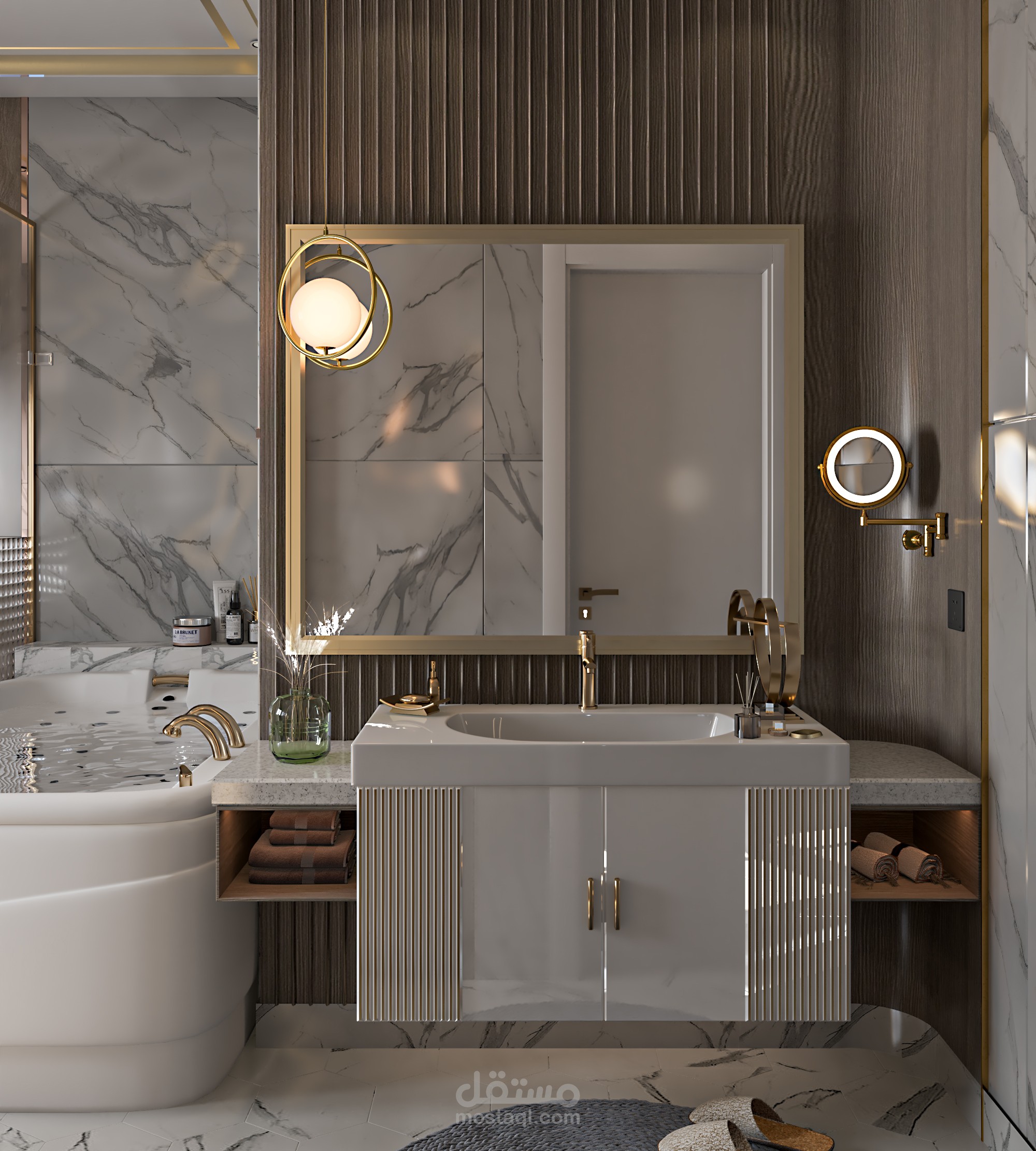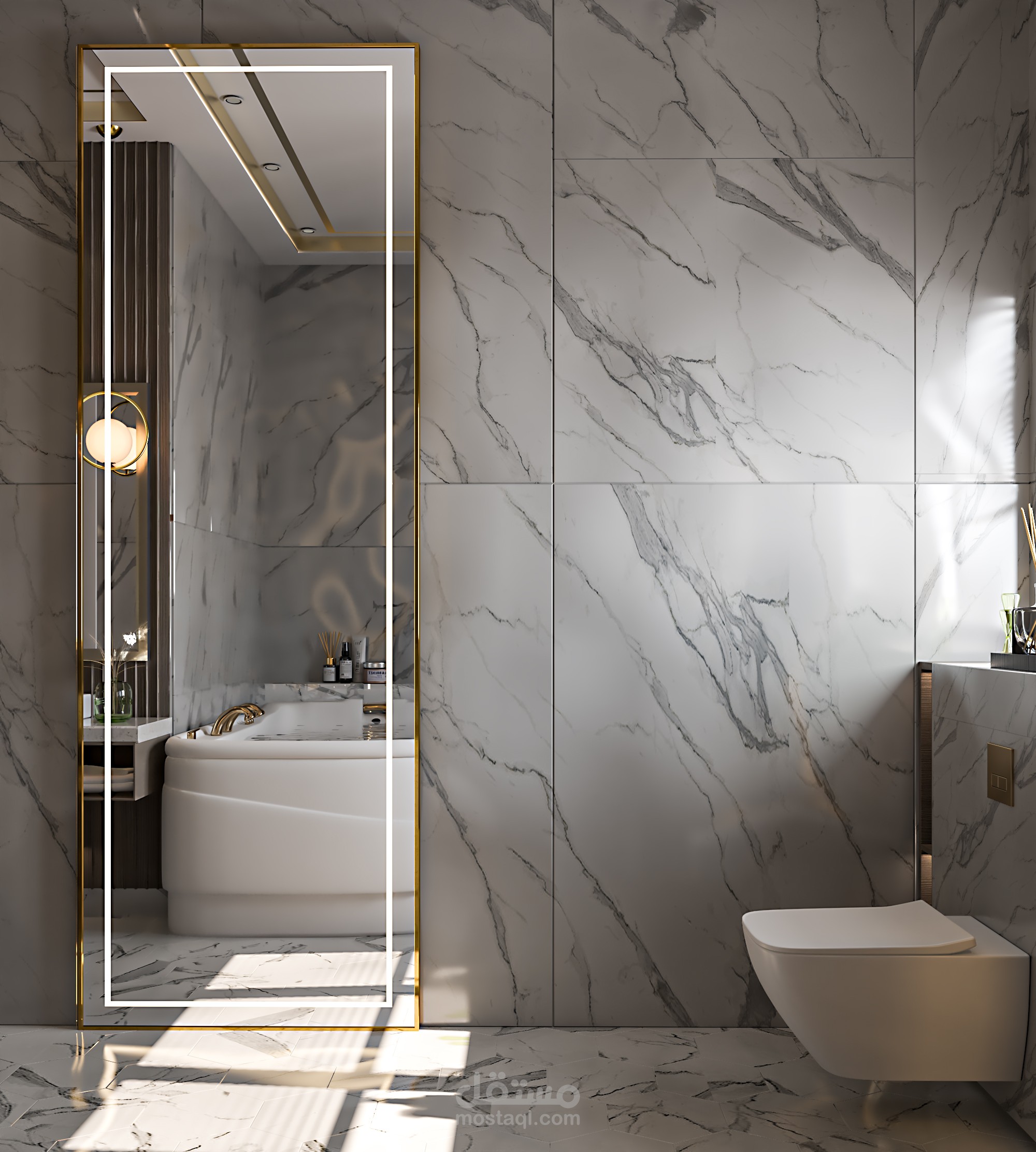 تصميم حمام مودرن مع تلبية رغبة العميل في وضع محتويات خاصه به في التصميم مثل الجاكوزي (120*180سم) ووضع مرآة طويله اخري غير مرآة الحوض ووضع قعدة معلقه