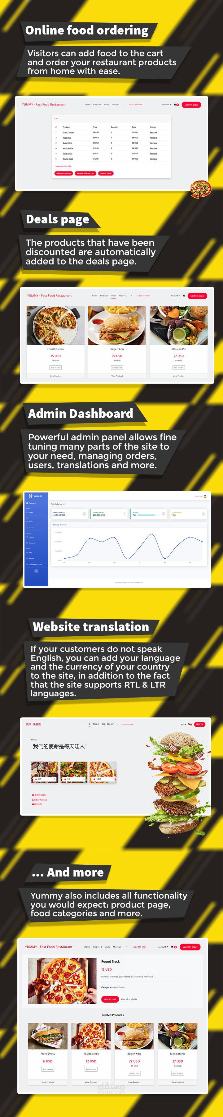 The Yummy - Online food ordering PHP script is well designed with detailed beautifully looking interior pages, eye-catching layouts, stunning styles. Aside from being responsive, YUMMY is a well-organized, clean code that ensures a smooth user experience for all visitors. and a lot of other amazing functions that we cannot ignore. Just imagine how great your brand's website looks when using YUMMY - an excellent choice for your online food store business!