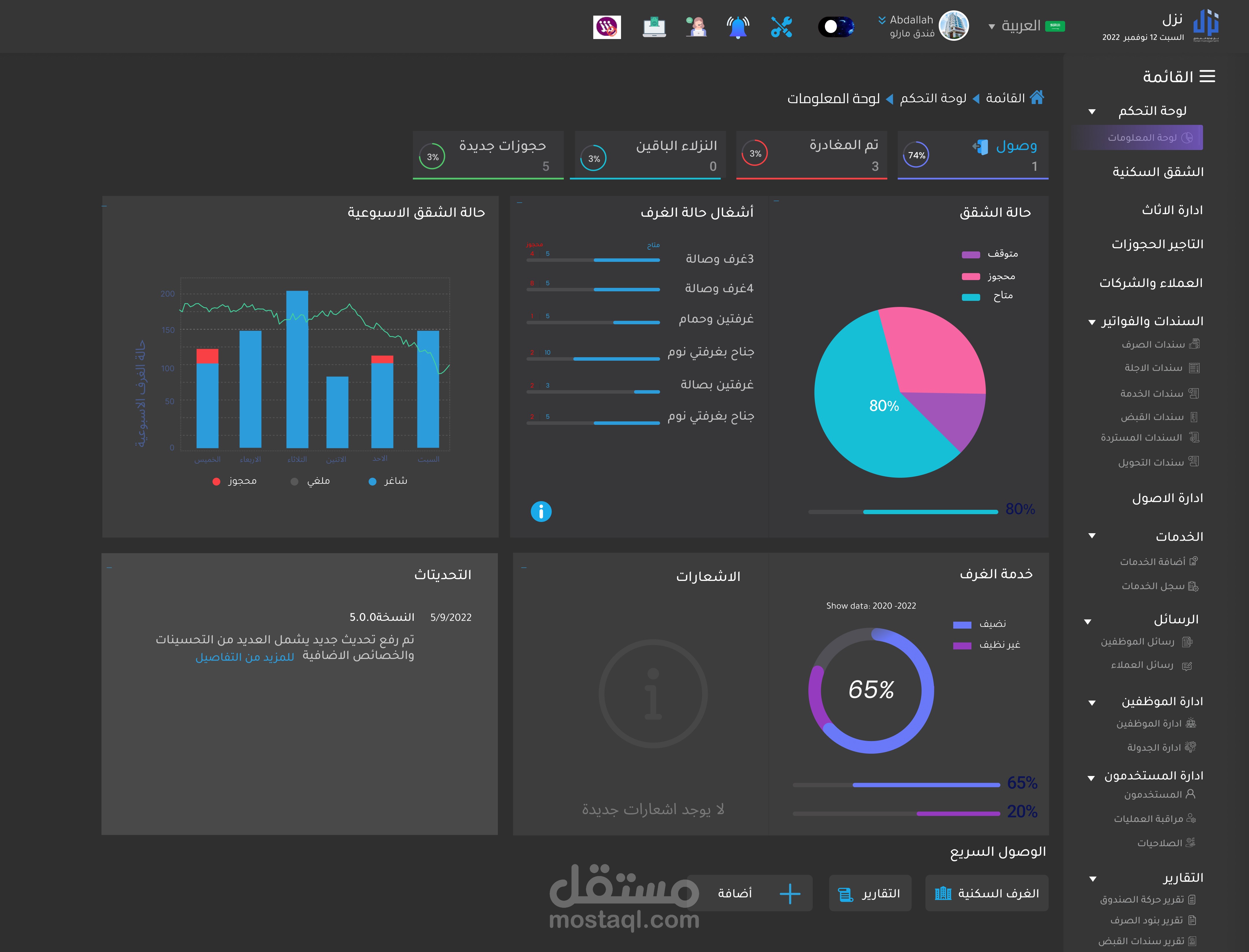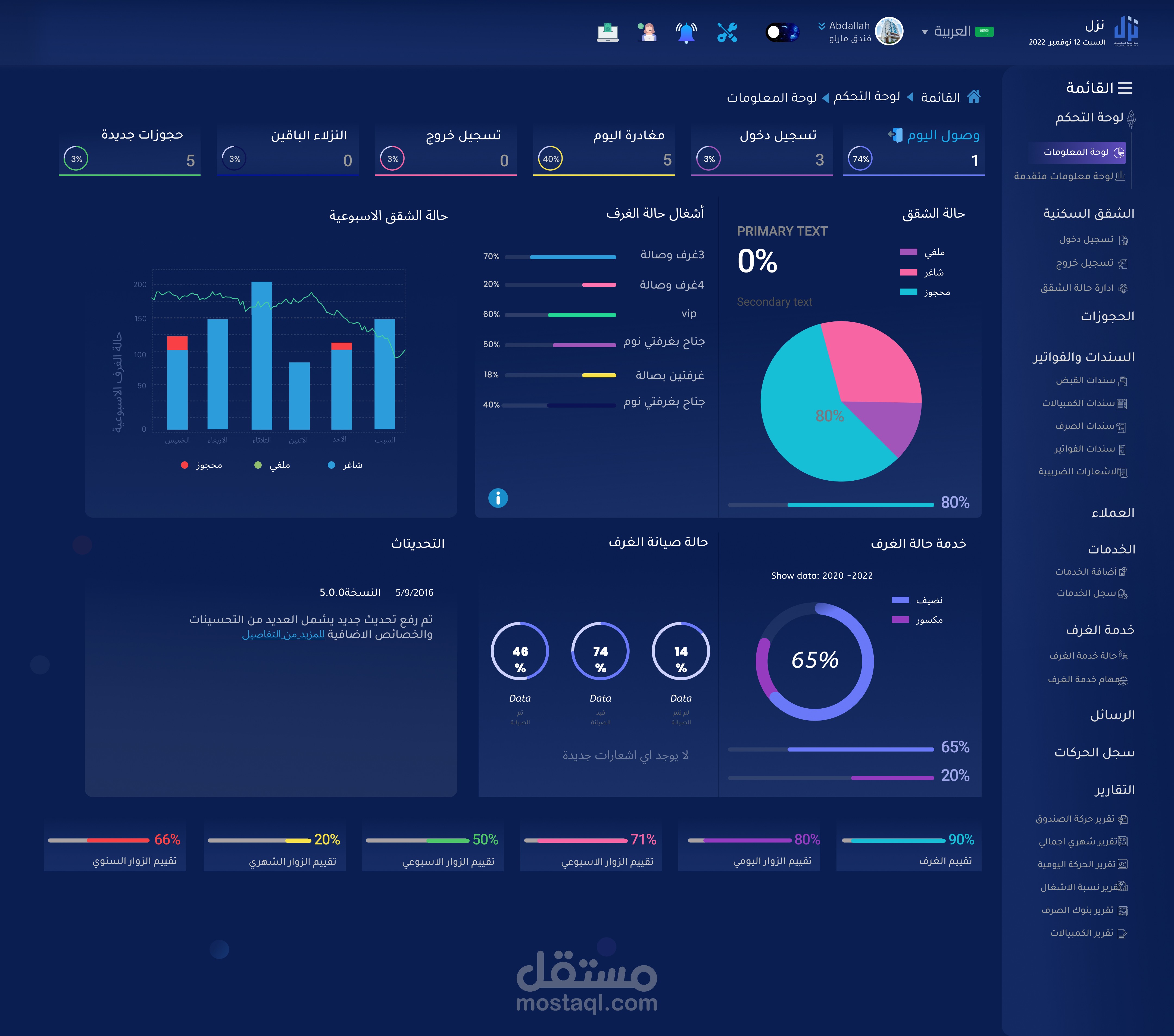 تصميم لوحة تحكم (Dashboard) لادارة الفنادق والحجوزات تحتوي على كافة الحجوزات والبيانات والتقارير الخاصة بالحجز