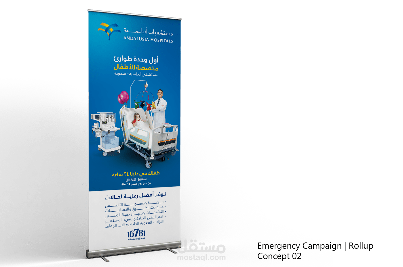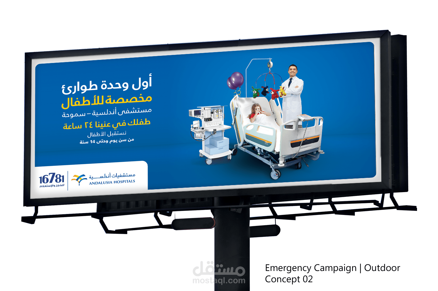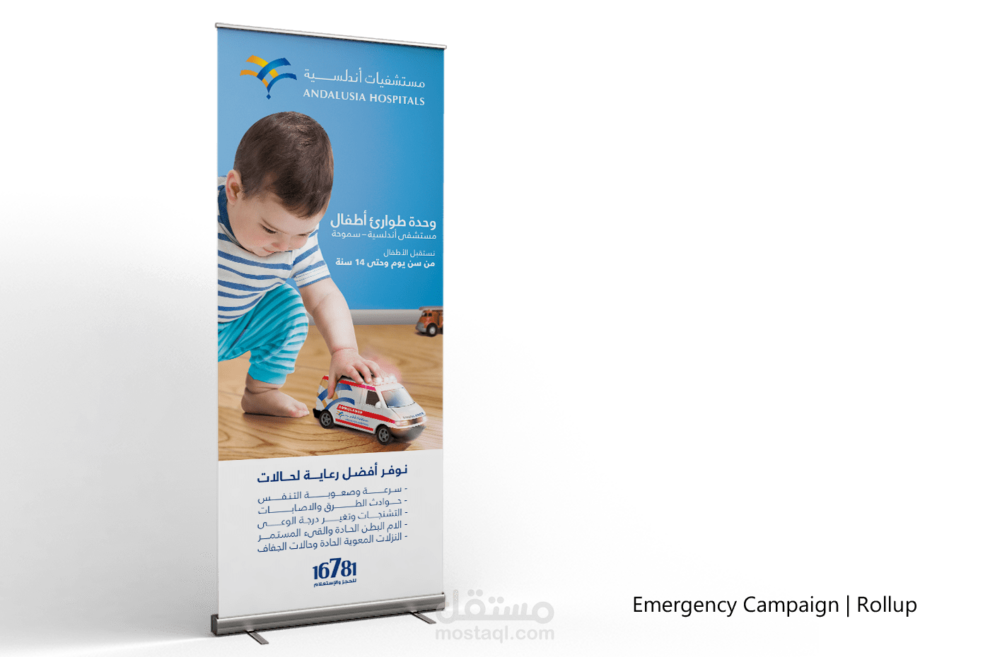 العمل عبارة عن حملة إعلانية لمجموعة مستشفيات أندلسية للتعبير عن وجود وحدة خاصة لطوارئ الأطفال بالمستشفى يشتمل العمل على لوحات إعلانية و بوستر و رول آب مرفق رابط العمل على موقع بيهانس و خطوات التنفيذ