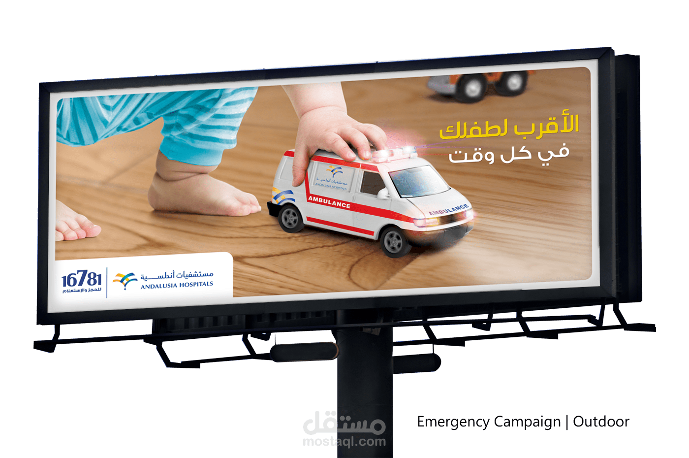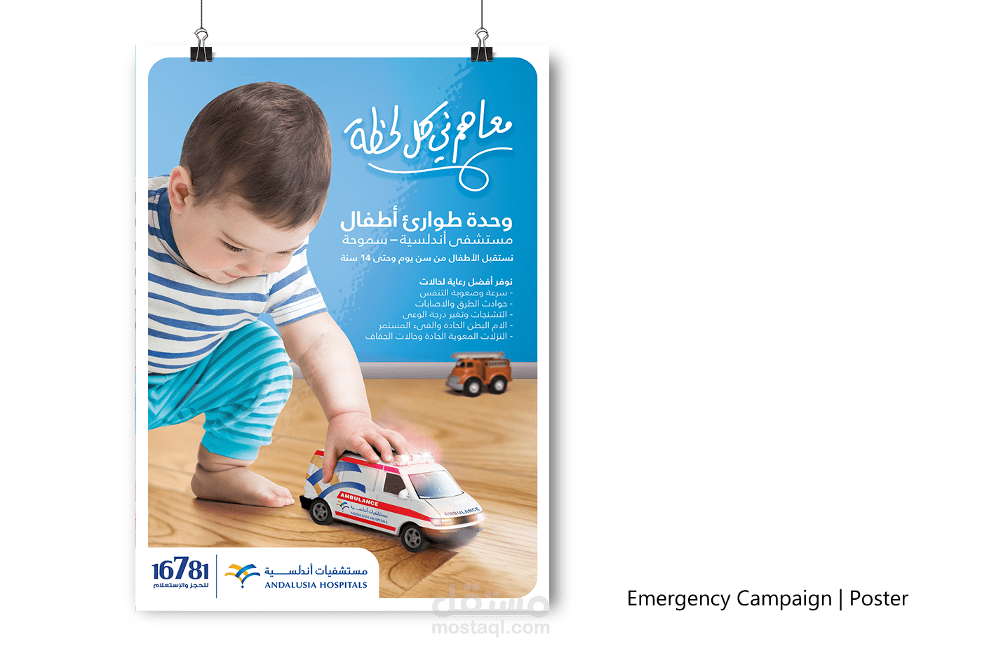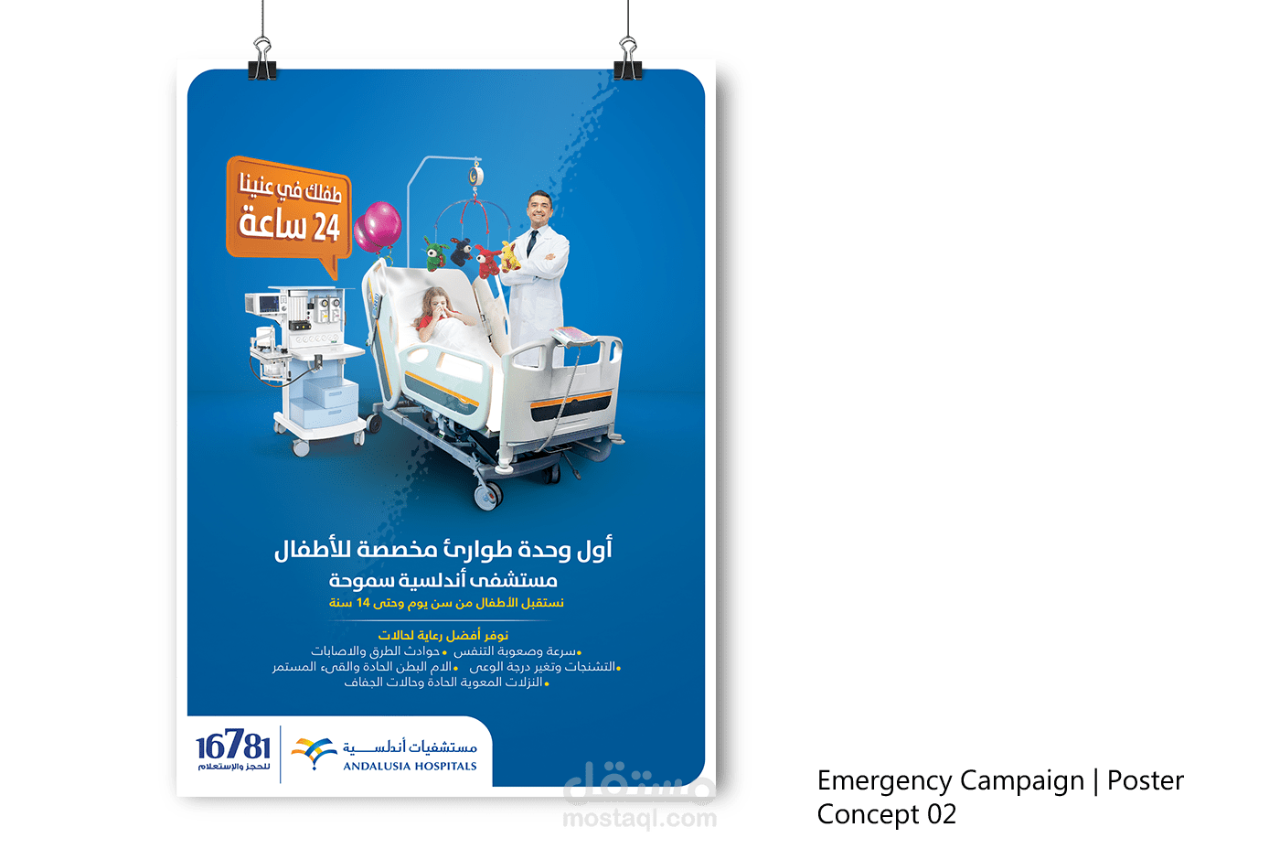 العمل عبارة عن حملة إعلانية لمجموعة مستشفيات أندلسية للتعبير عن وجود وحدة خاصة لطوارئ الأطفال بالمستشفى يشتمل العمل على لوحات إعلانية و بوستر و رول آب مرفق رابط العمل على موقع بيهانس و خطوات التنفيذ