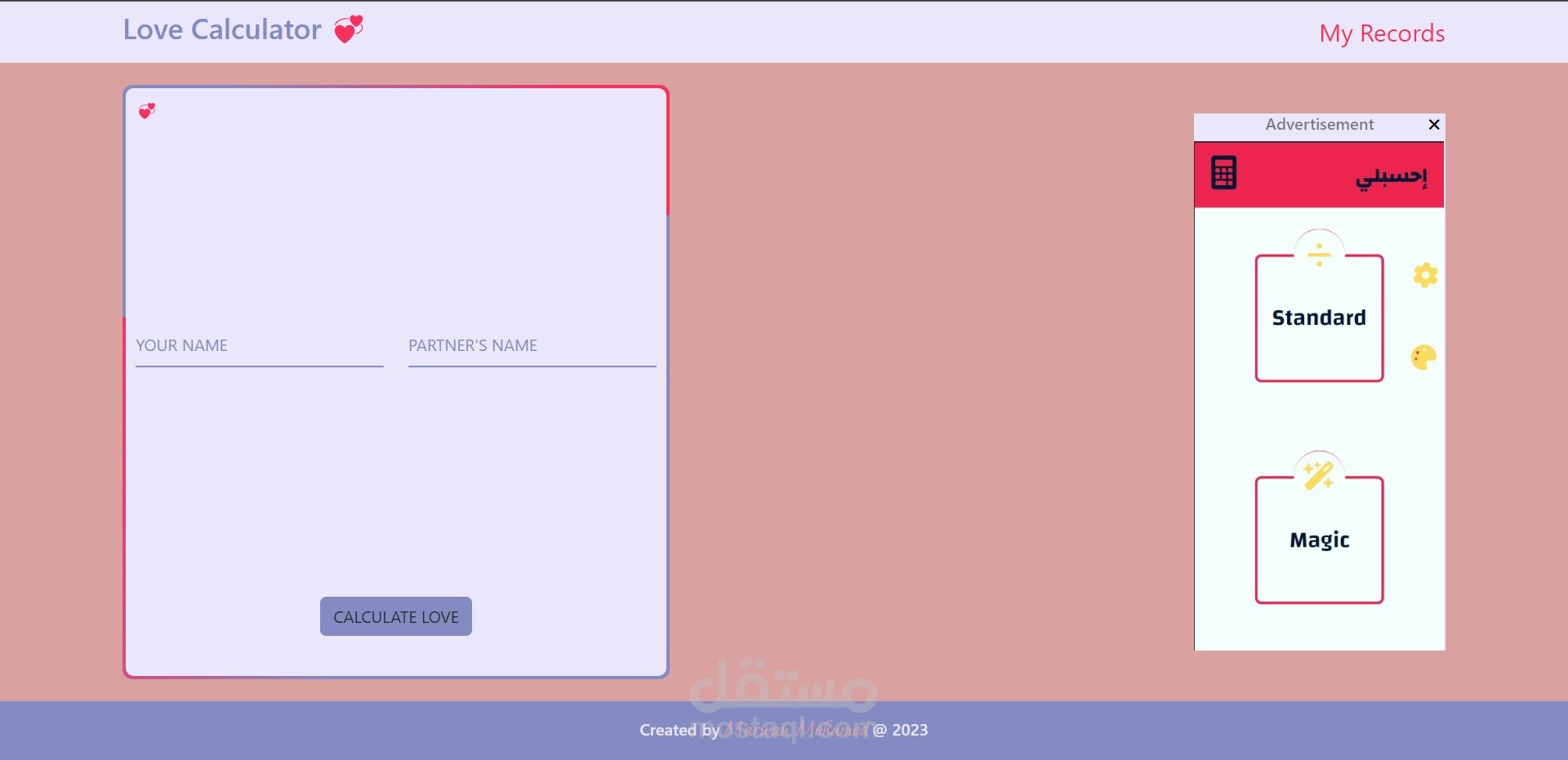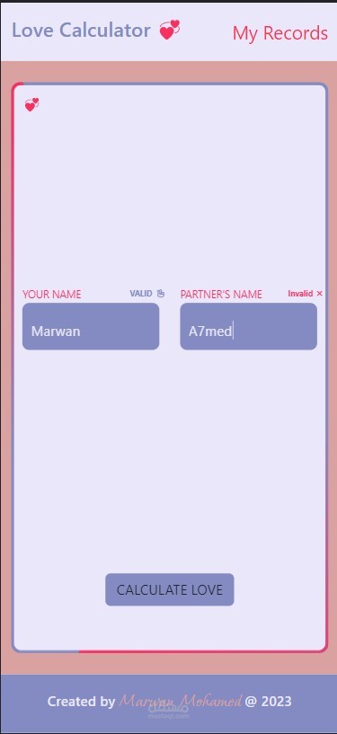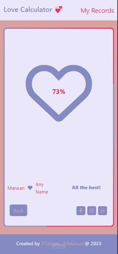 فكرة التطبيق هي السماح للمستخدمين بإدخال أسمائهم، بالإضافة إلى اسم شريكهم، ومن ثم الانتقال إلى صفحة أخرى. ستقوم هذه الصفحة بحساب نسبة الحب بينهما وعرض النتيجة، والتي تشمل أسمائهم ونسبة الحب والنصائح (مثل البحث عن شخص آخر). بالإضافة إلى ذلك، يمكن للمستخدم الوصول إلى قسم السجلات الذي لا يزال قيد التطوير. وعلاوة على ذلك، تم تحاكي إعلانات Google داخل التطبيق.