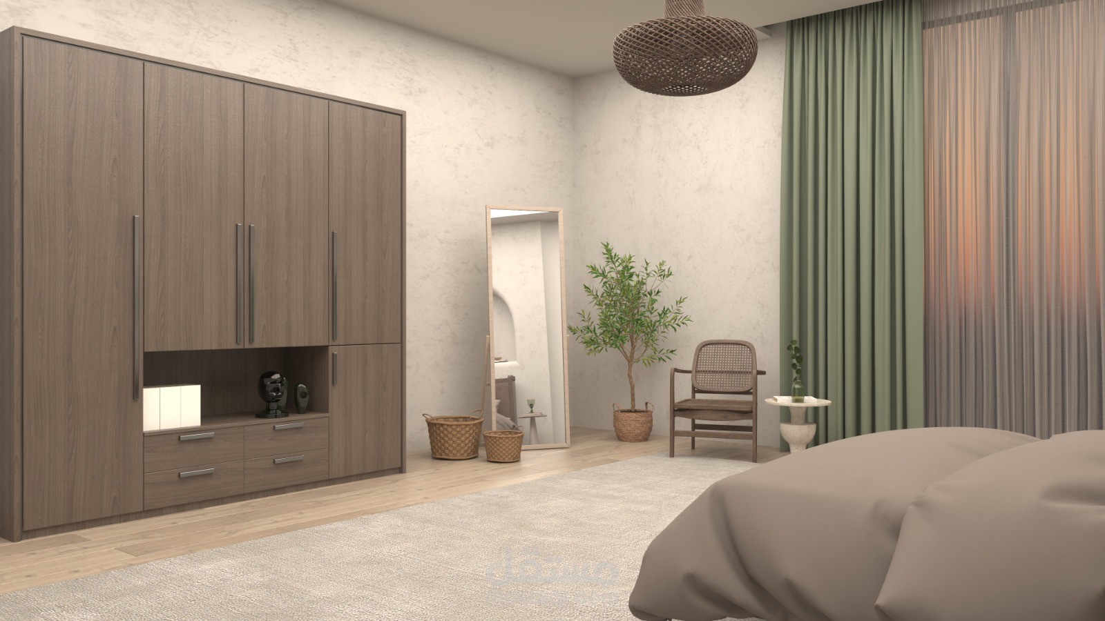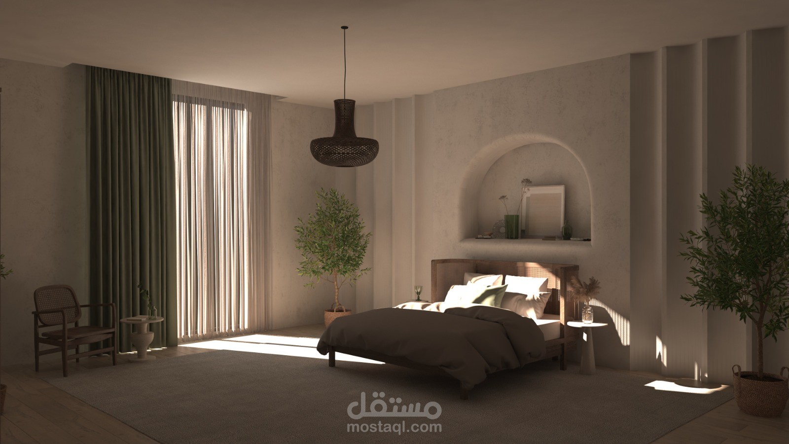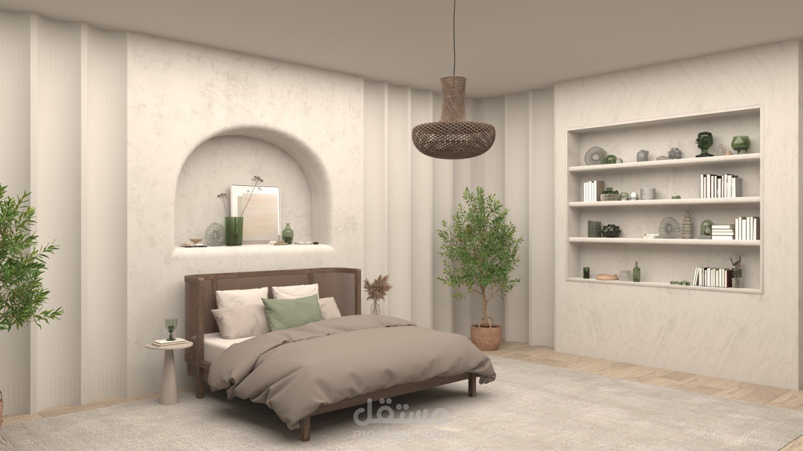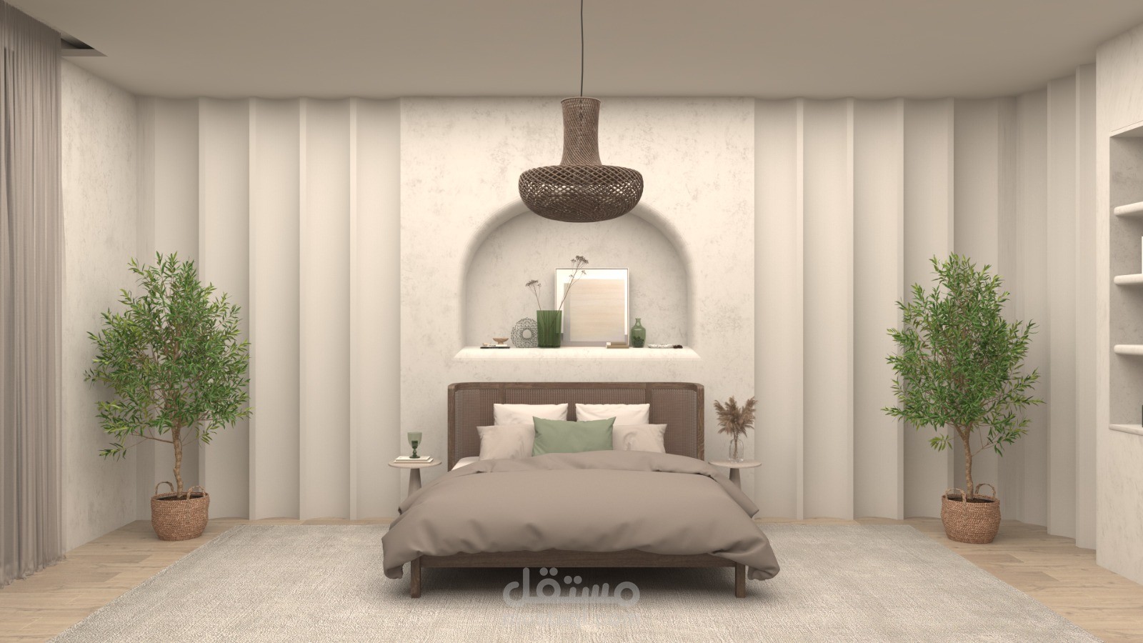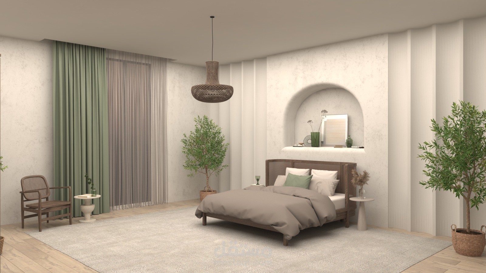 يعتمد تصميم هذه الغرفة على البساطة و الأناقة معا و تم اختيار ألوان محايدة بدرجات دافئة اضافة الى قطع أثاث بيئية يدوية الصنع كالأسبتة من الخوص المضفر و قطع الخزف و كرسي الخيزران ..... لتبعث على الشعور بالاسترخاء و هو الغرض الأساسي لغرفة النوم