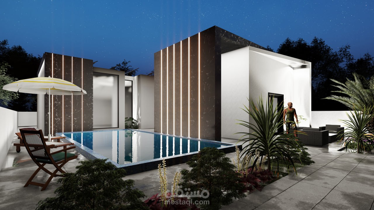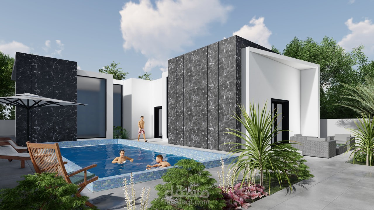 تصميم خارجي لشاليه بالاضافة لمقطع فيديو يوضح طريقة الحركة ضمن الشاليه وتم التصميم باستخدام برنامج الريفت وبرنامج اللوميون