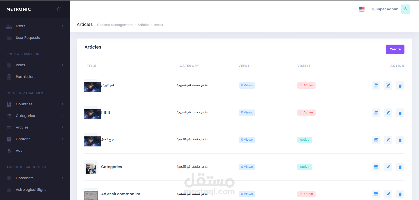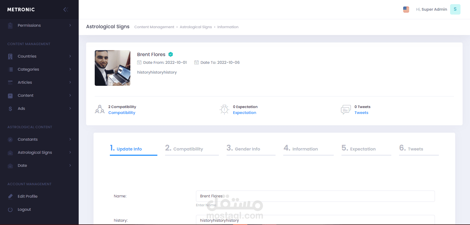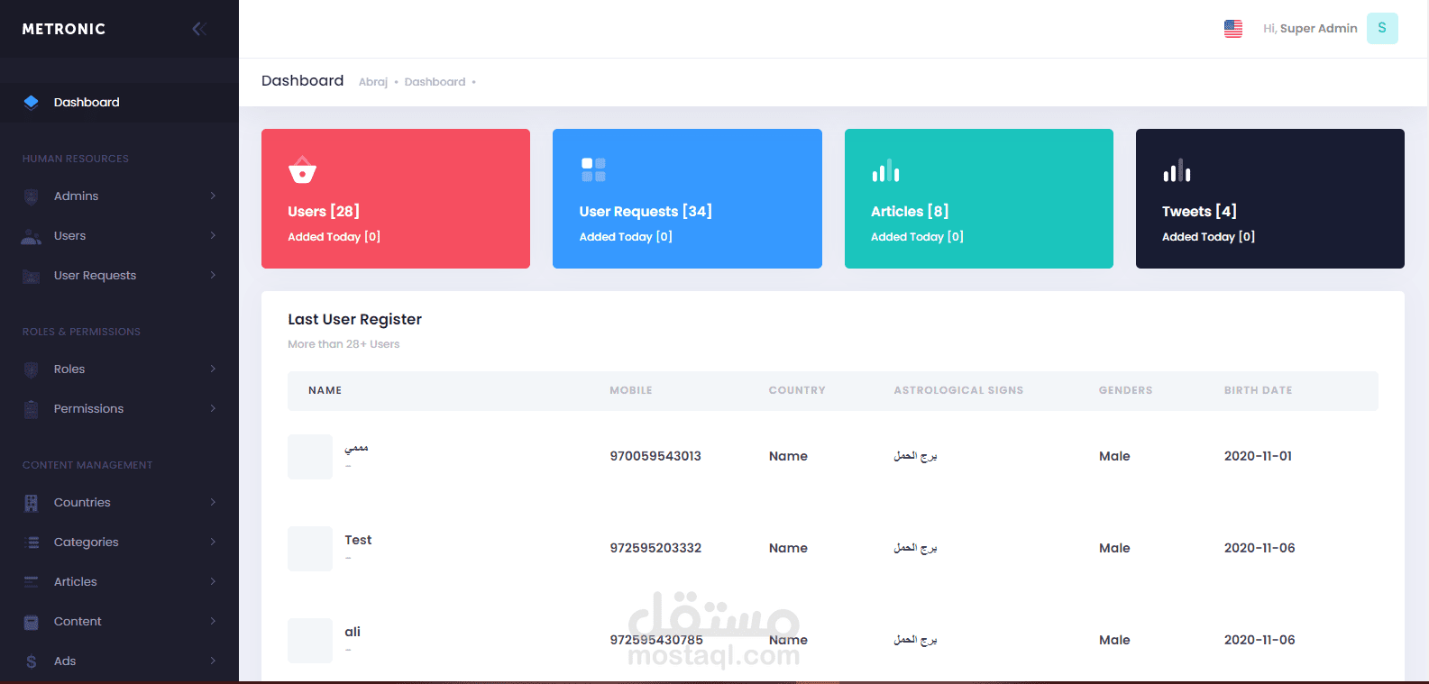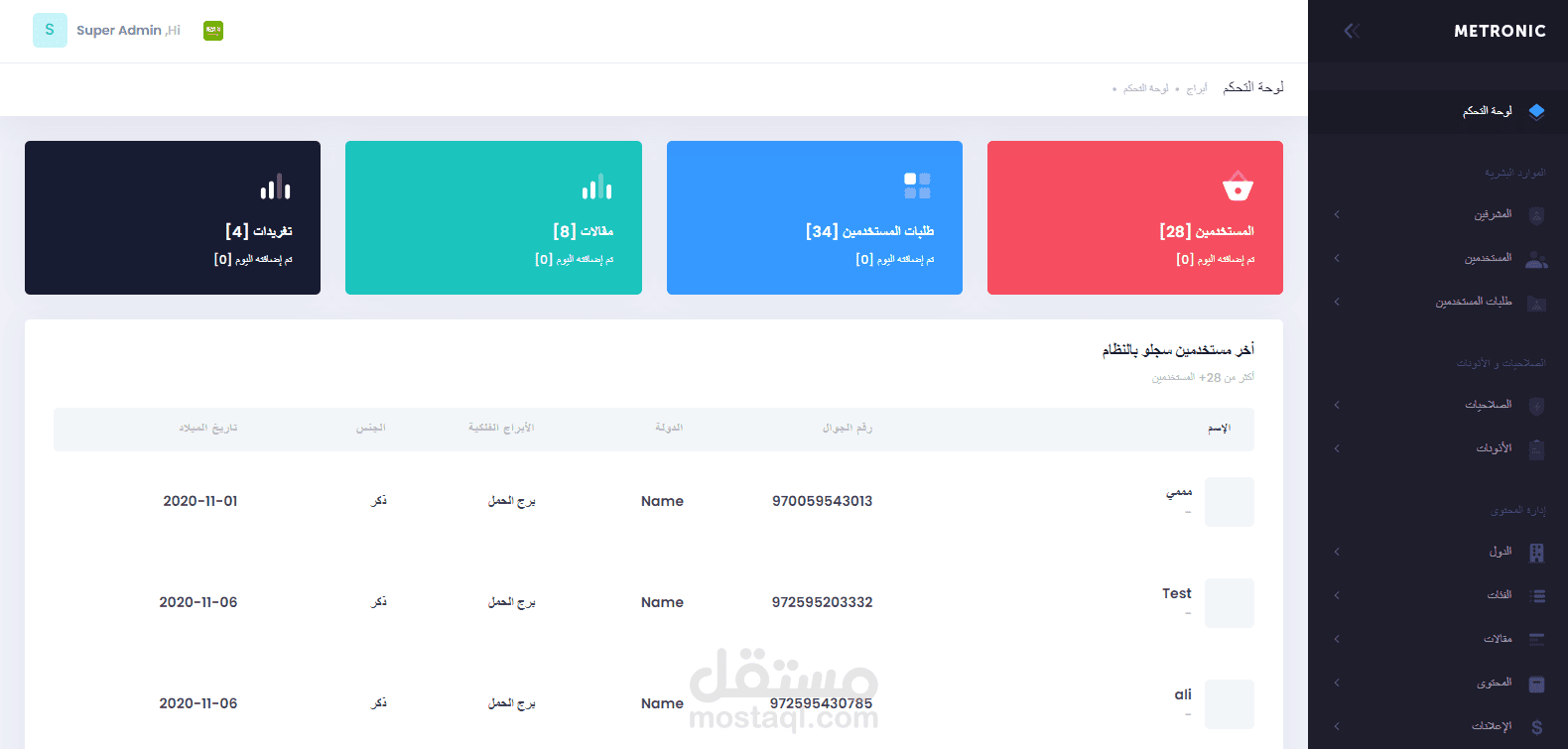 منصة أبراج , الهدف منها متابعة أبراج الفلك والتوقعات اليومية للزبون , والتحكم بتطبيق موبايل.