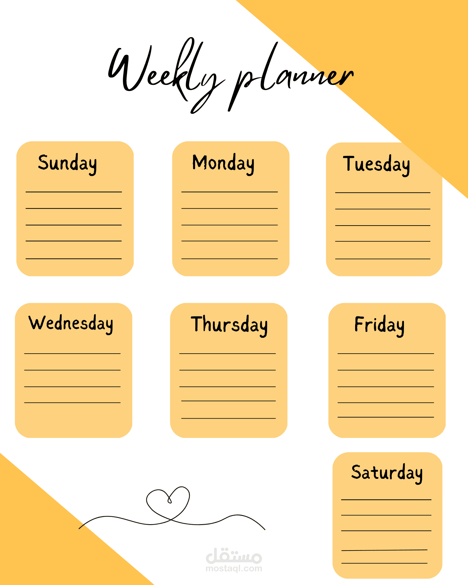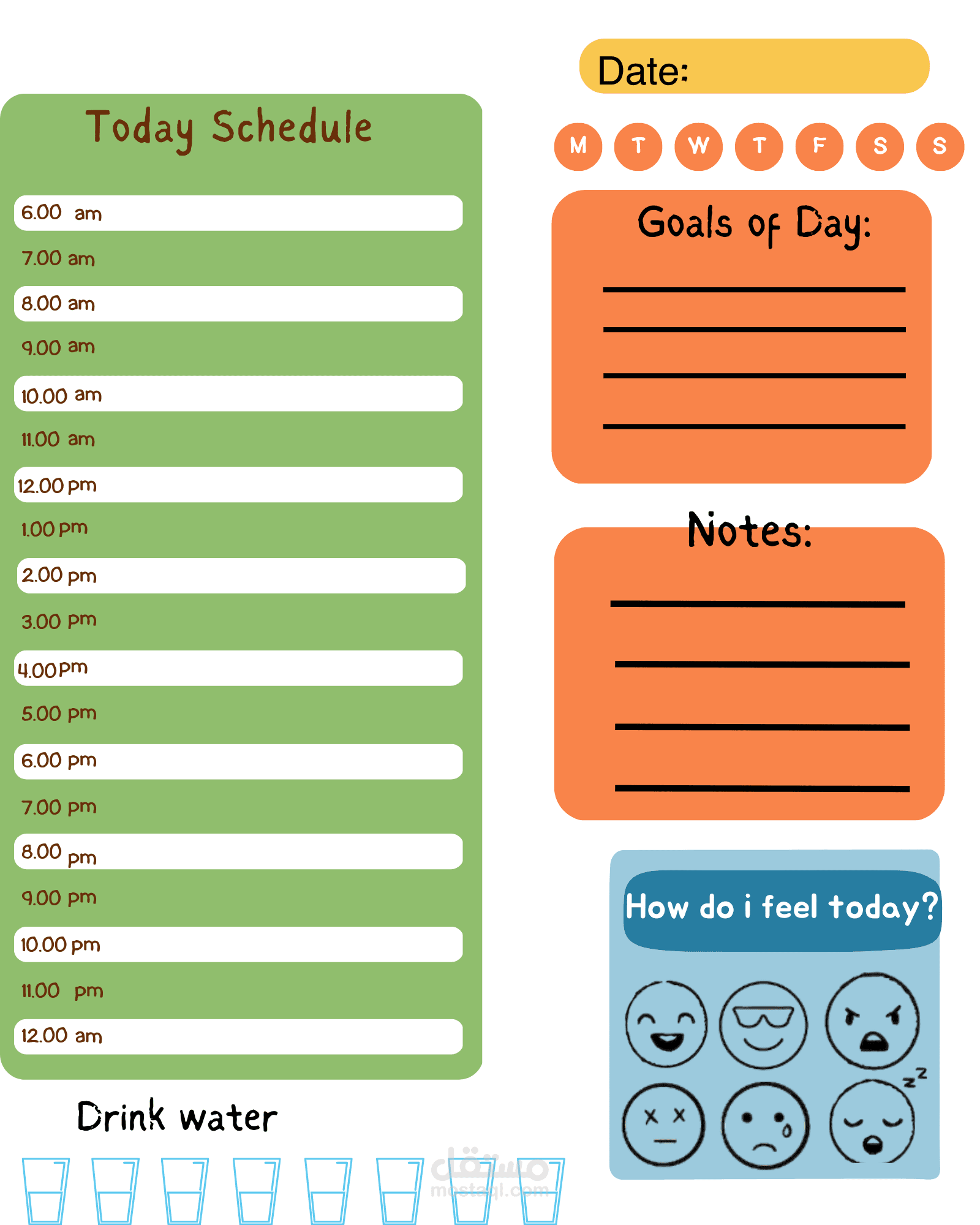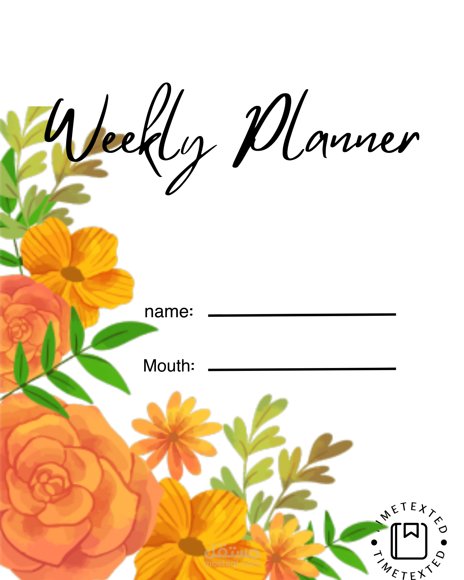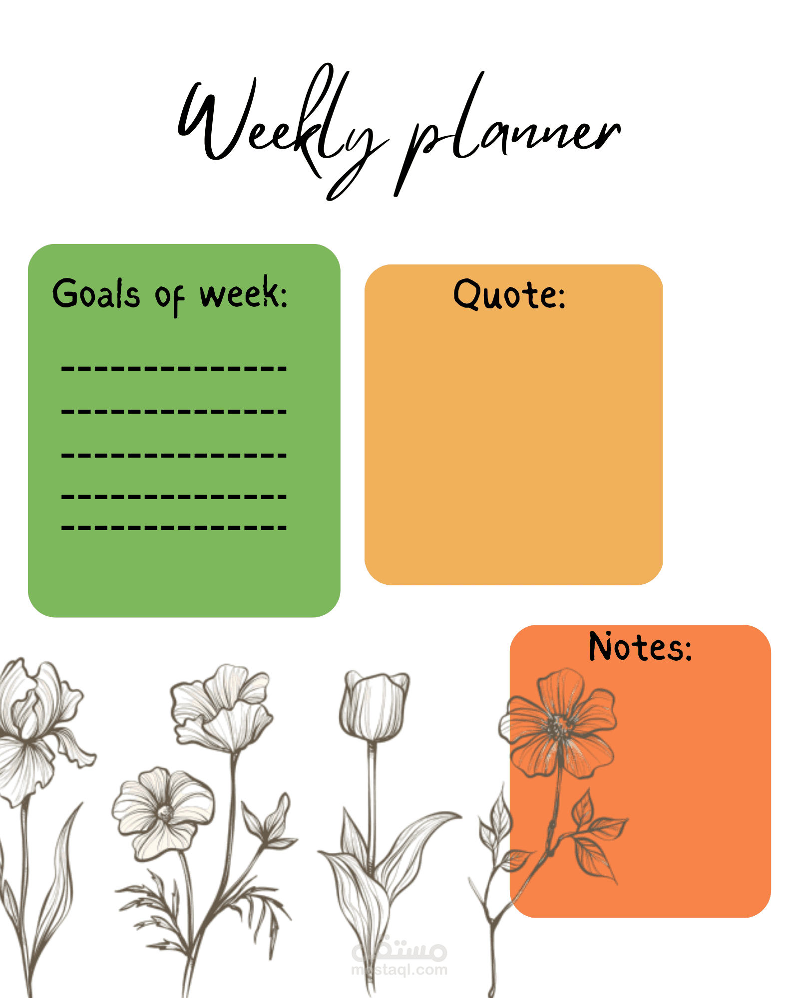 مخطط اسبوعي يحتوي على 10 صفحات - تشمل هذه الصفحات 7 اوراق و هي للتخطيط اليومي , و صفحة لتحديد الاهداف بشكل عام و اخرى بتحديد الاهداف بشكل خاص .