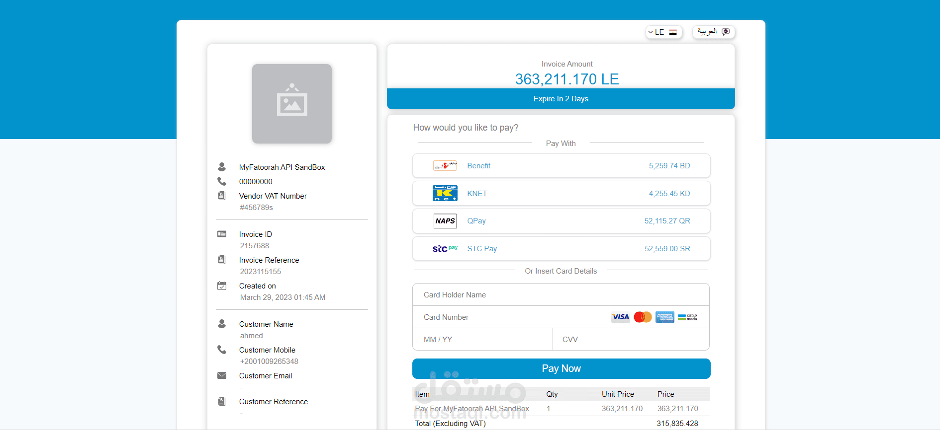 -اضافة بوابه دفع ماى فاتورة والتى يمكن من خلالها الدفع من خلال اى كارت سواء visa -mastercard او اى كارت اخر .